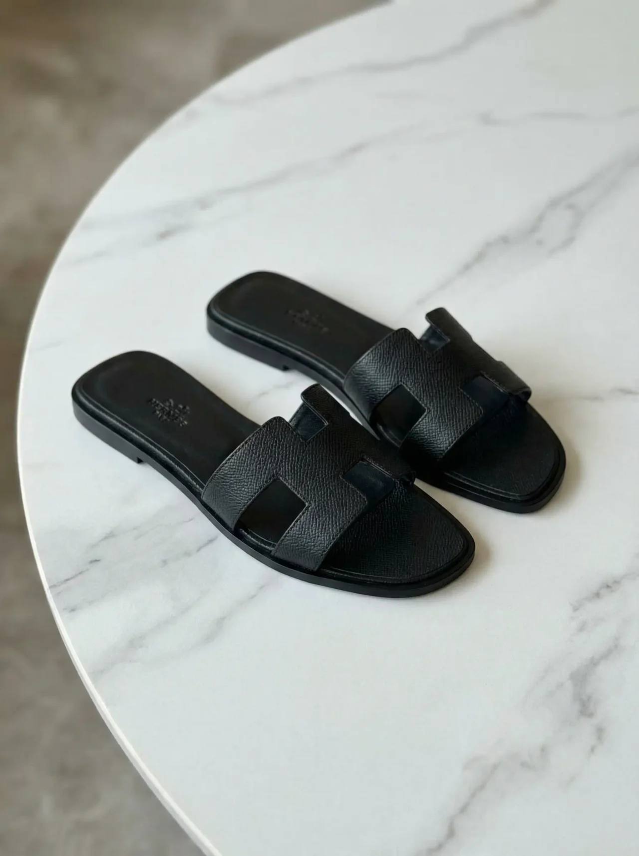 Премиальные сандалии Hermès Oran в чёрной зернистой коже: ручная работа, фирменный H-ремешок, удобная плоская подошва и кожаная стелька с тиснением логотипа. Идеальны для повседневного элегантного образа летом.