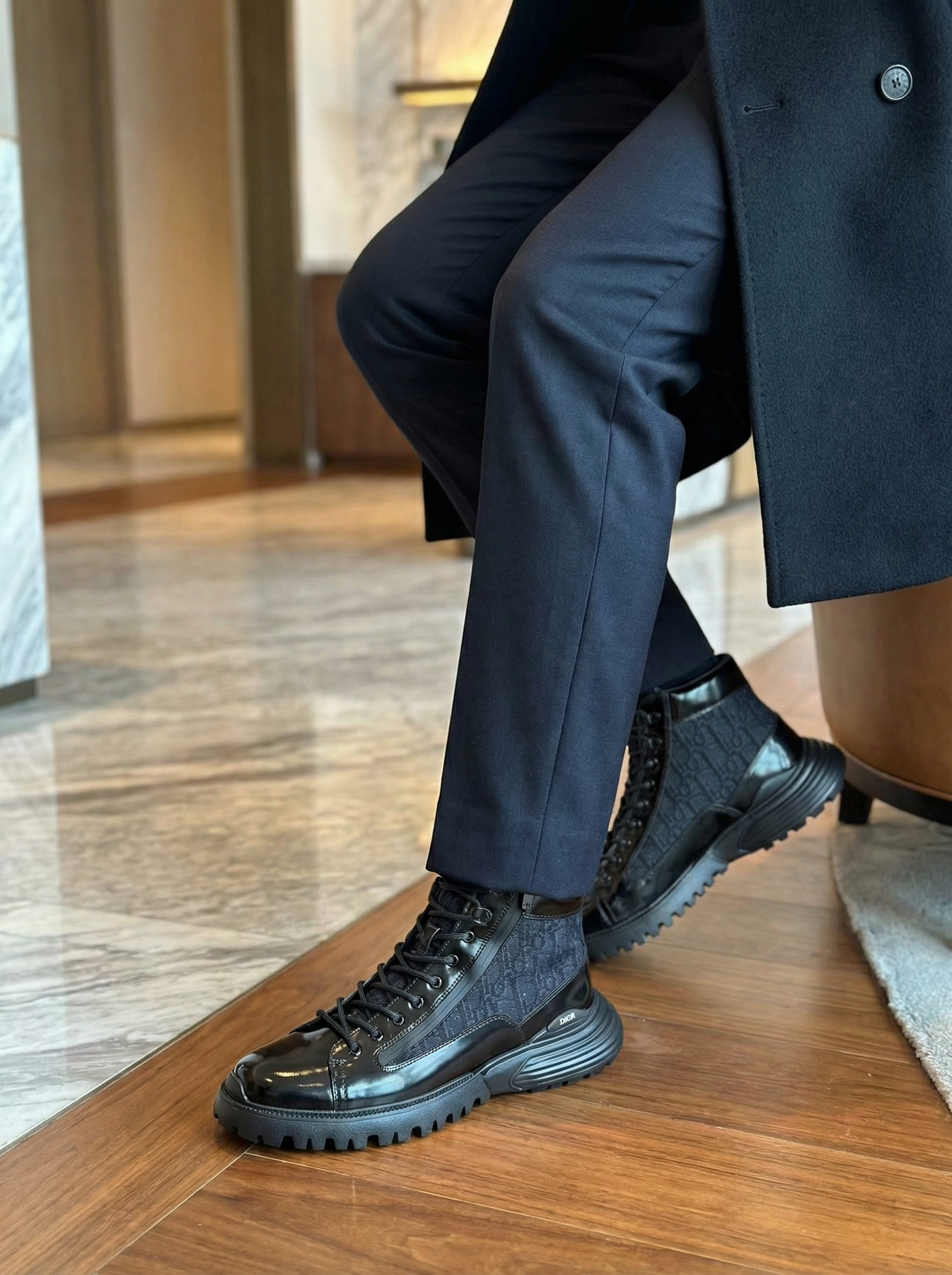 Элегантные и функциональные мужские ботинки CHRISTIAN DIOR из коллекции Oblique. Слитный черный дизайн сочетает мягкую замшу и фирменную жаккардовую ткань с мотивом Oblique, создавая сдержанный роскошный образ — идеальны для города и холодного сезона.