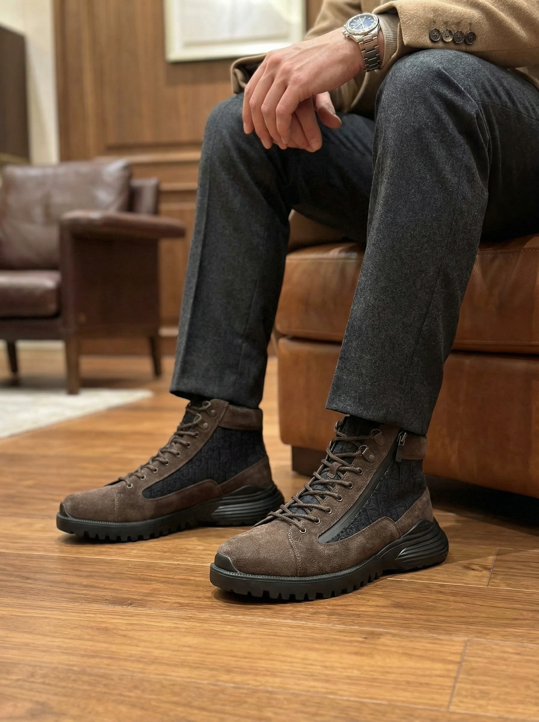 • Верх: мягкая натуральная замша тёплого коричневого тона с аккуратной строчкой, придающей ботинкам структурированность и долговечность.