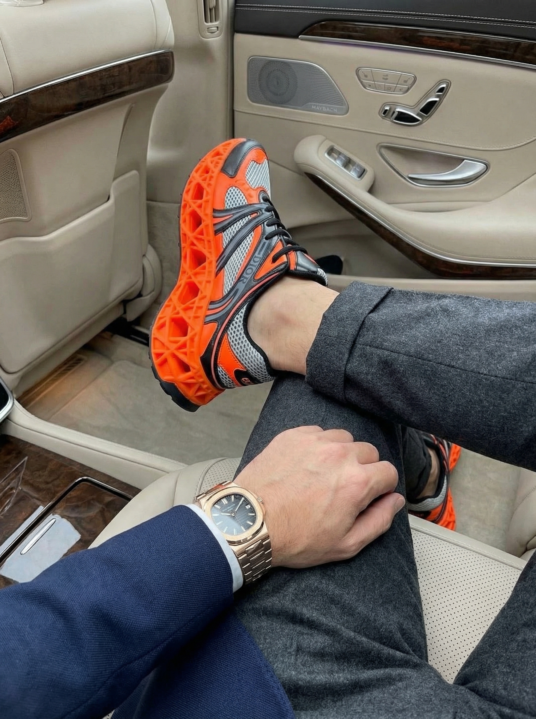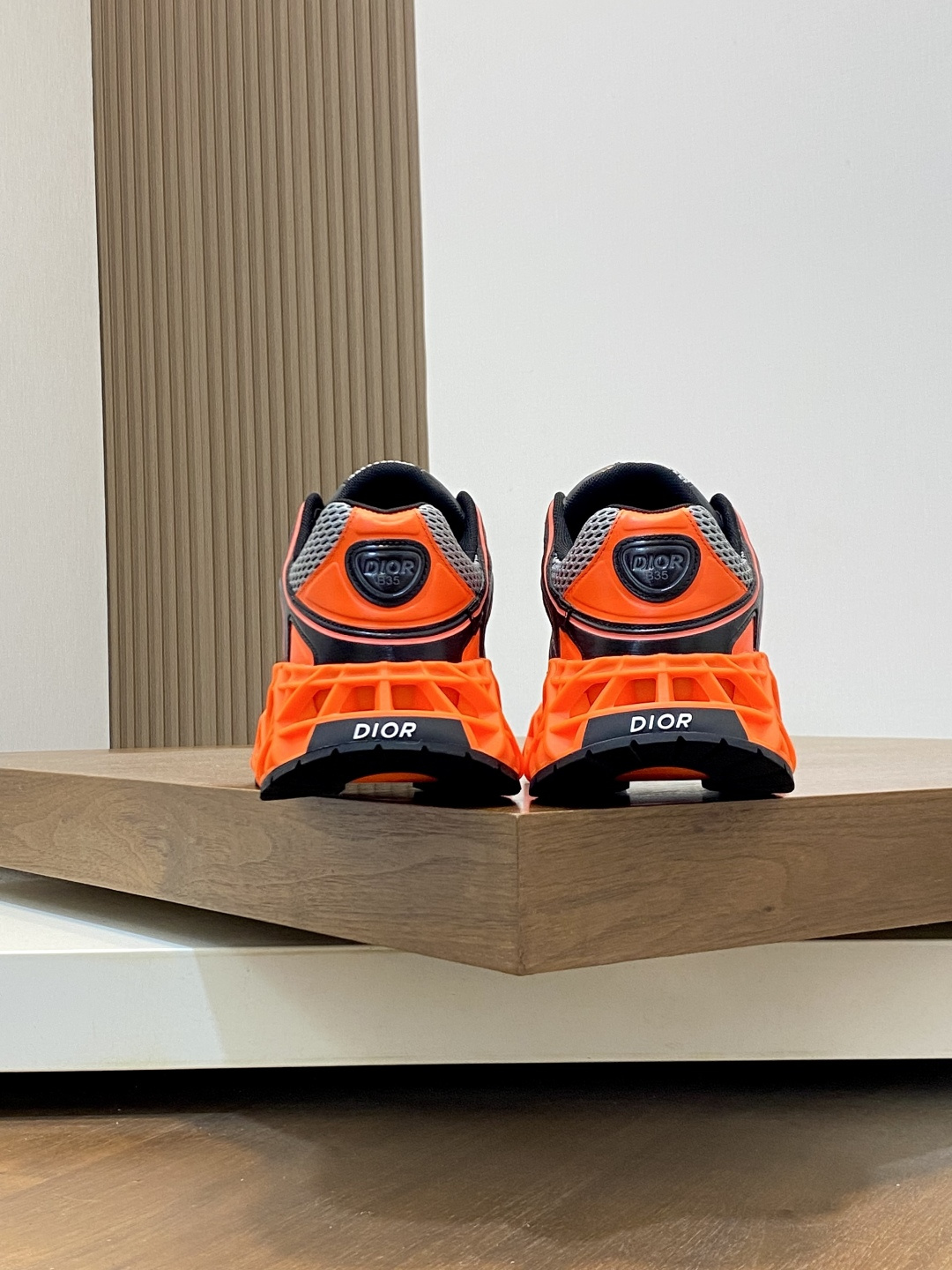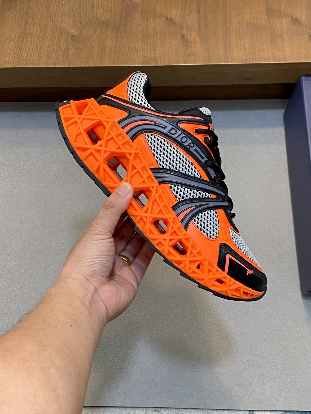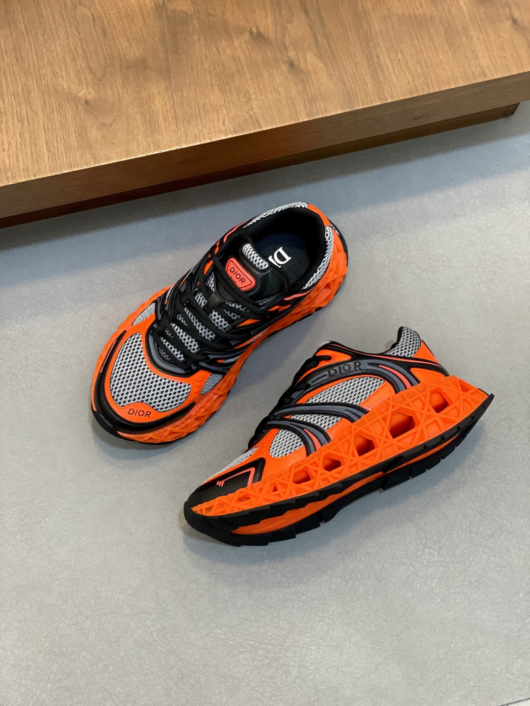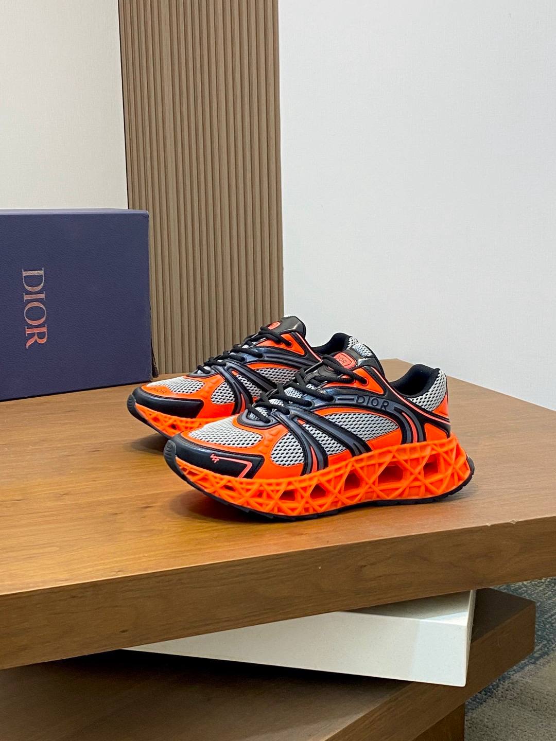 Пара выполнена с верхом из дышащей сетки серо‑белого оттенка в сочетании с контрастными синтетическими/резиновыми накладками черного цвета, которые структурируют и поддерживают стопу. Ярко‑оранжевая подошва с геометрическим объёмным рельефом задаёт смелый акцент и обеспечивает амортизацию и визуальную лёгкость конструкции. Мягкий воротник и анатомическая стелька с фирменным логотипом DIOR гарантируют комфорт при длительной носке. Центральная шнуровка позволяет точно подогнать посадку, а декоративные детали с надписью DIOR подчёркивают статусный характер модели.