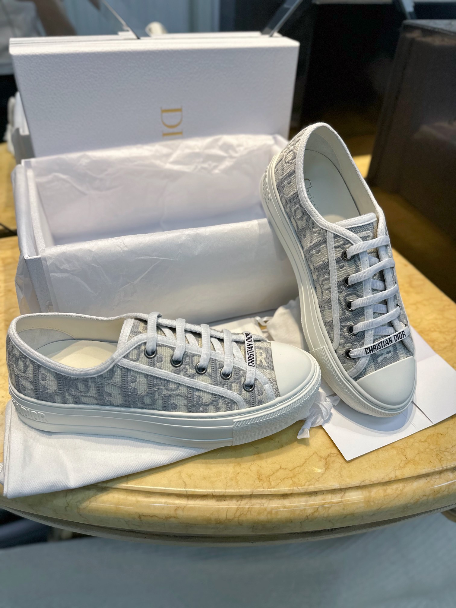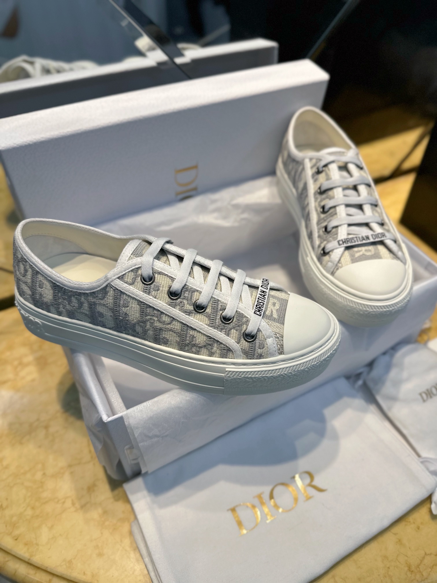 • Брендирование: фирменные знаки Dior видны на верхнем жаккарде, декоративной нашивке у шнуров и, вероятно, тиснением на задней части подошвы/пятке.