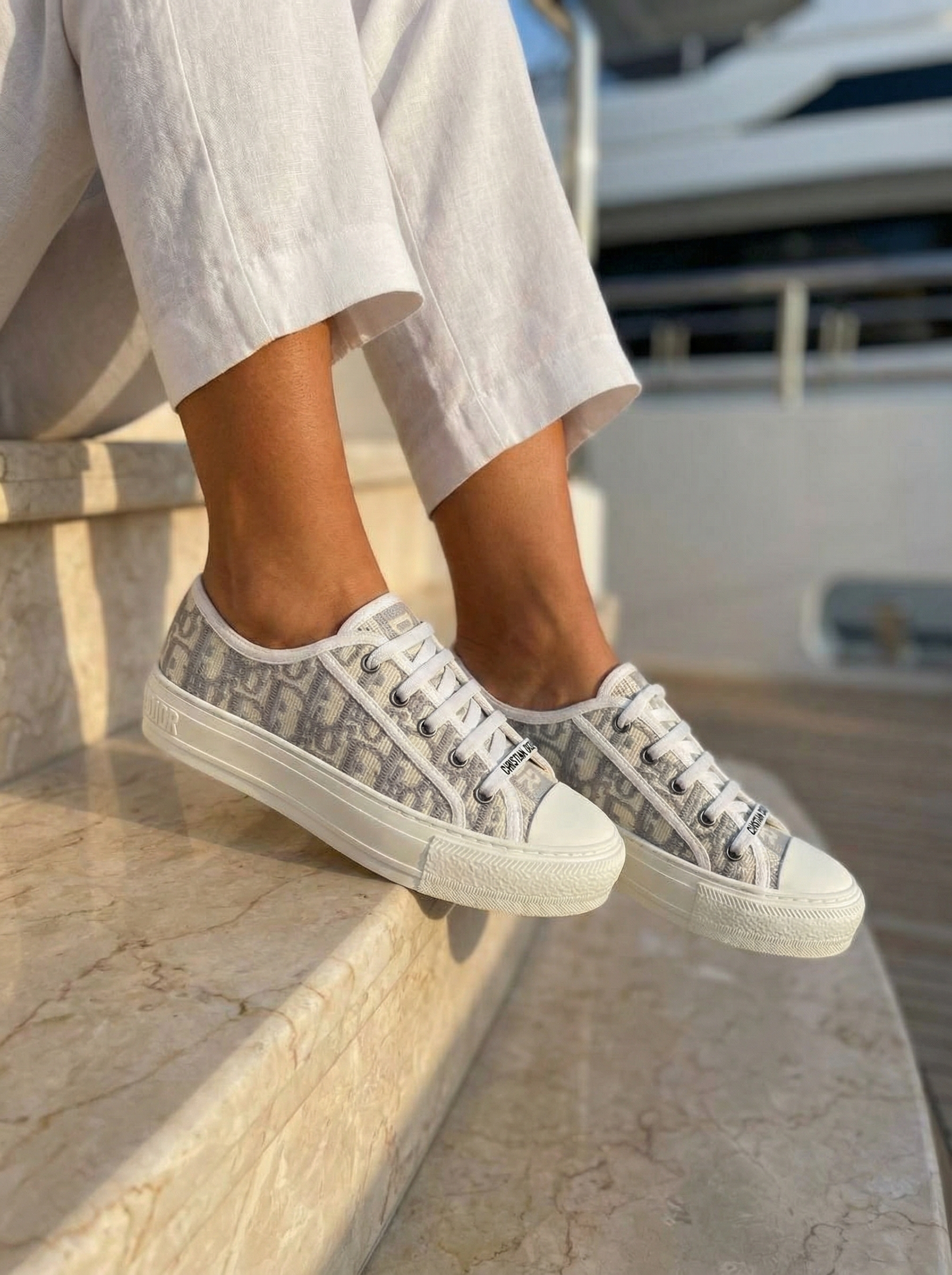 • Верх: текстильный жаккард Dior Oblique в светло-серой/пастельно-голубой гамме с повторяющимся логотипом. По контуру — тонкая окантовка и накладки из гладкой белой кожи для прочности и аккуратного внешнего вида.