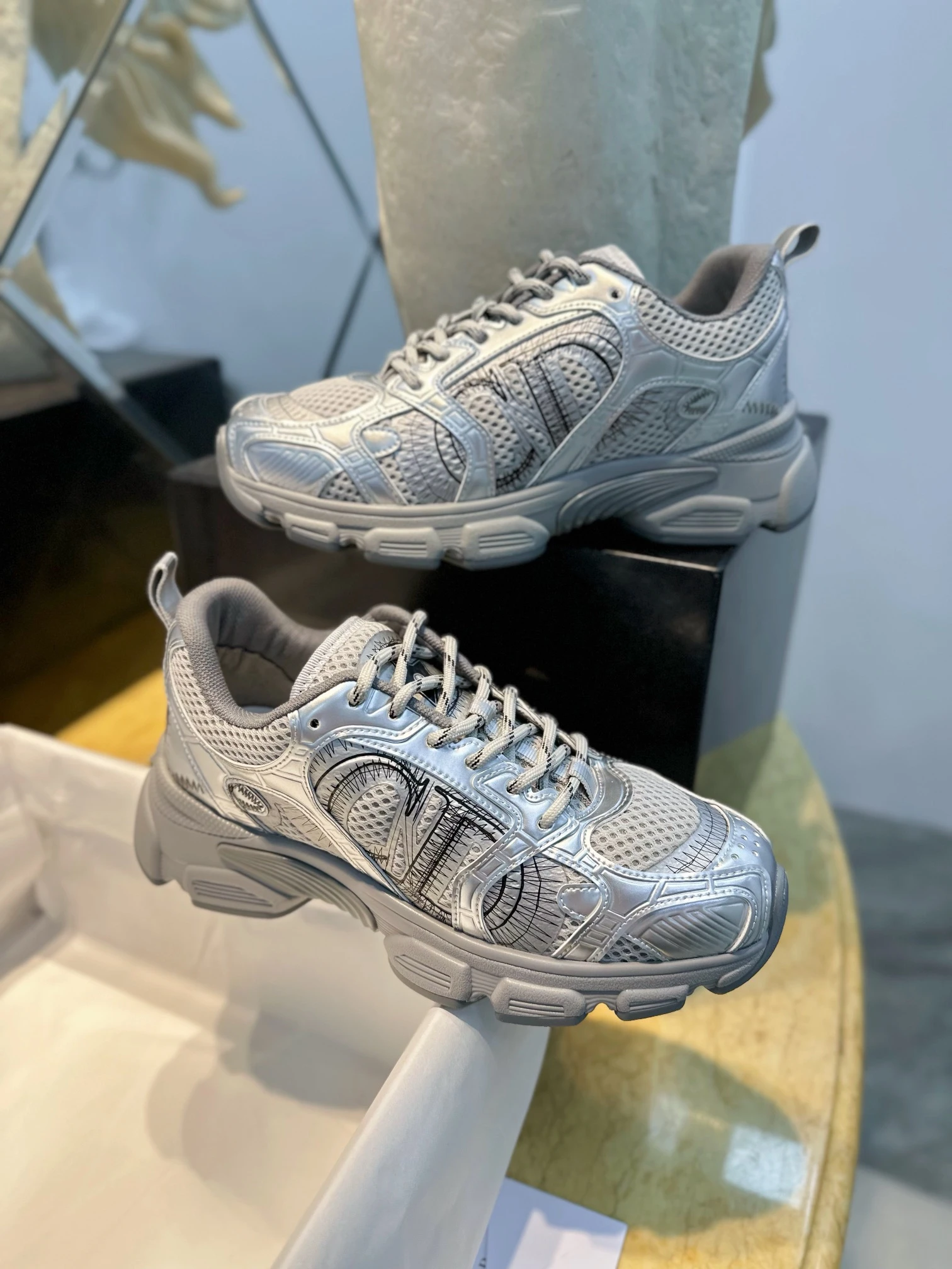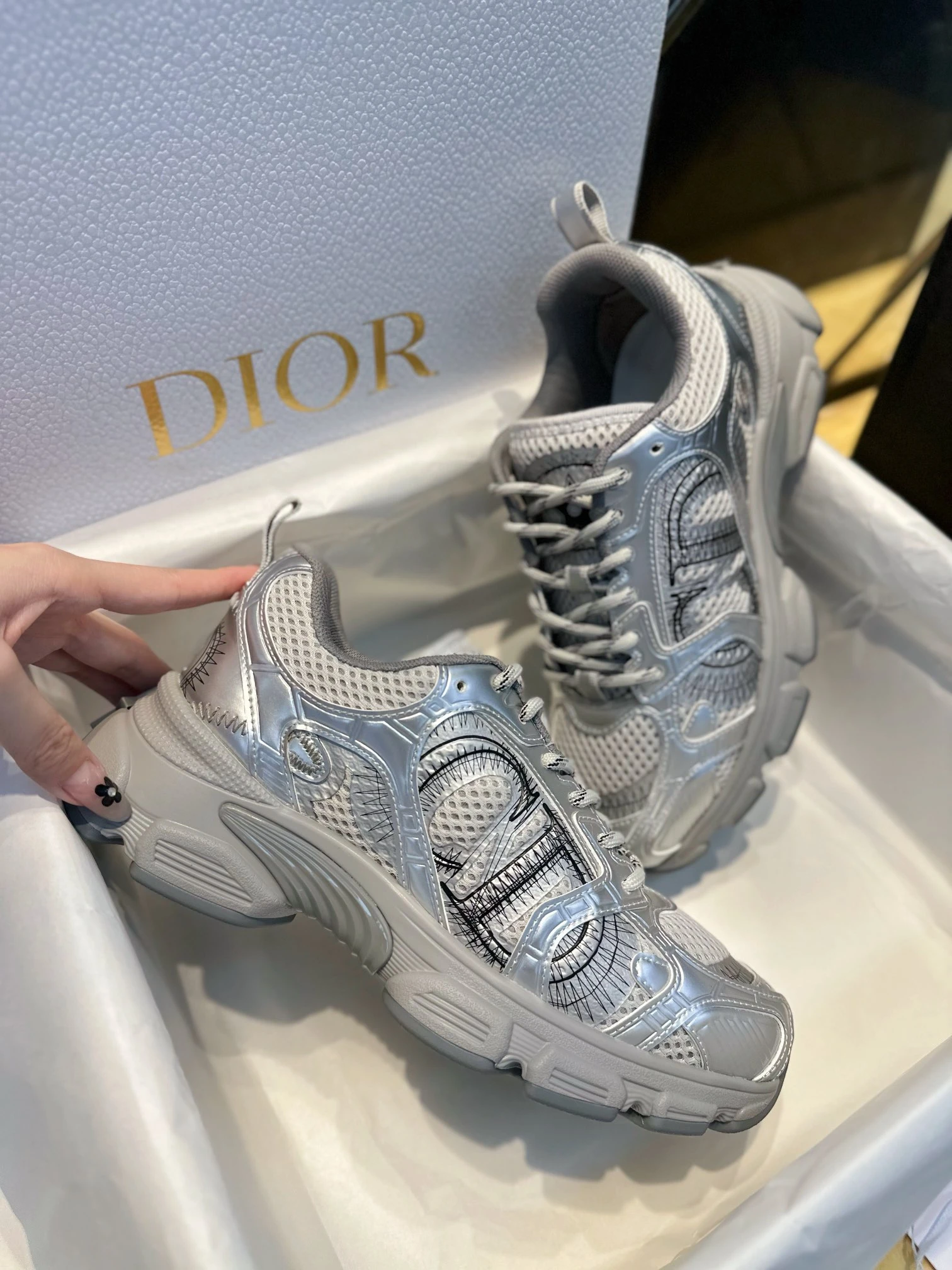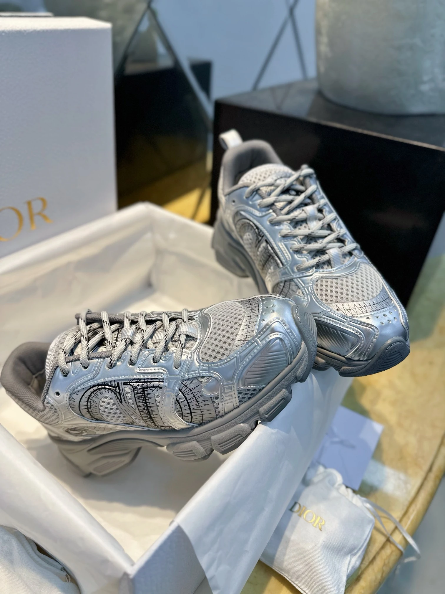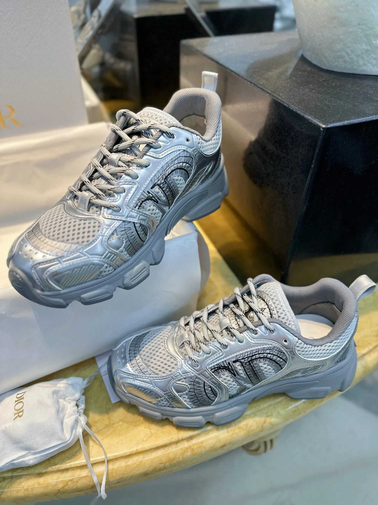 Современная, элегантная модель в стиле «chunky» с выраженным спортивным характером и изысканными деталями — кроссовки Chrono от Christian Dior. Серебристая металлизированная отделка в сочетании с дышащей сеткой и текстурированными нашивками создаёт роскошный, но практичный образ для города и путешествий.