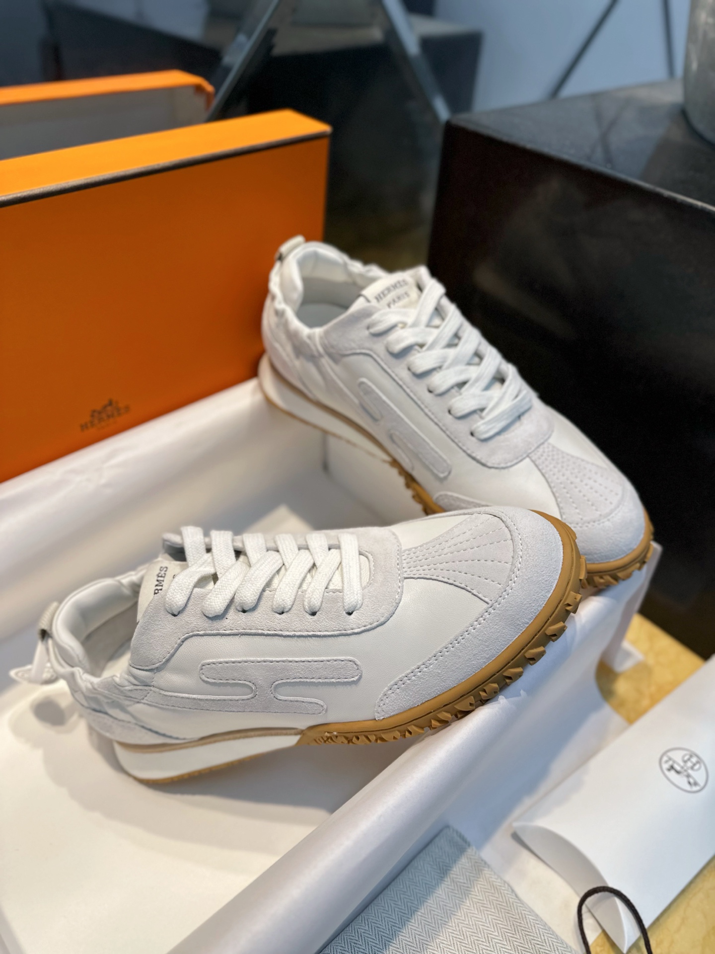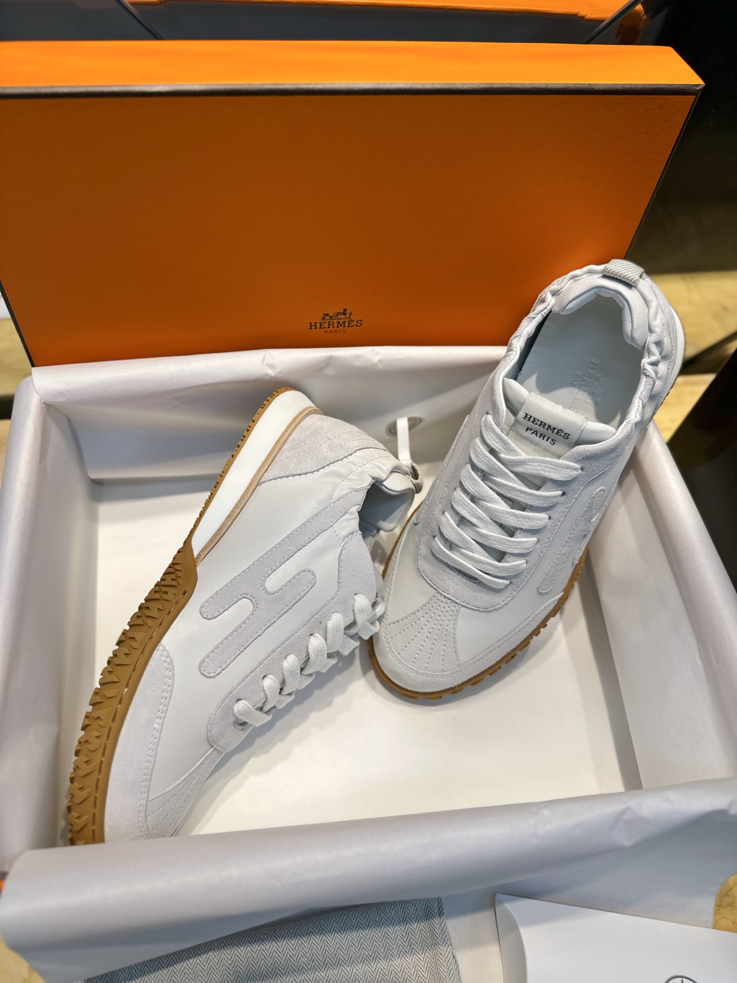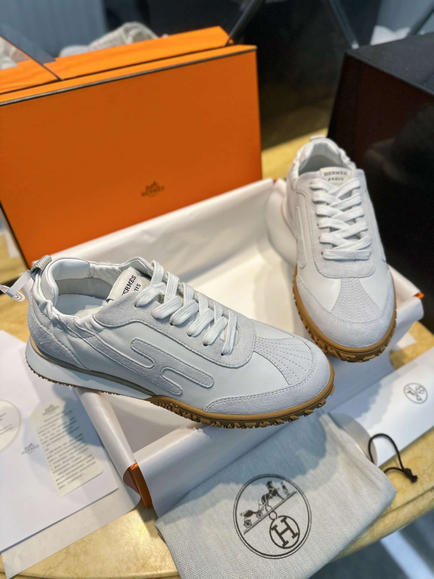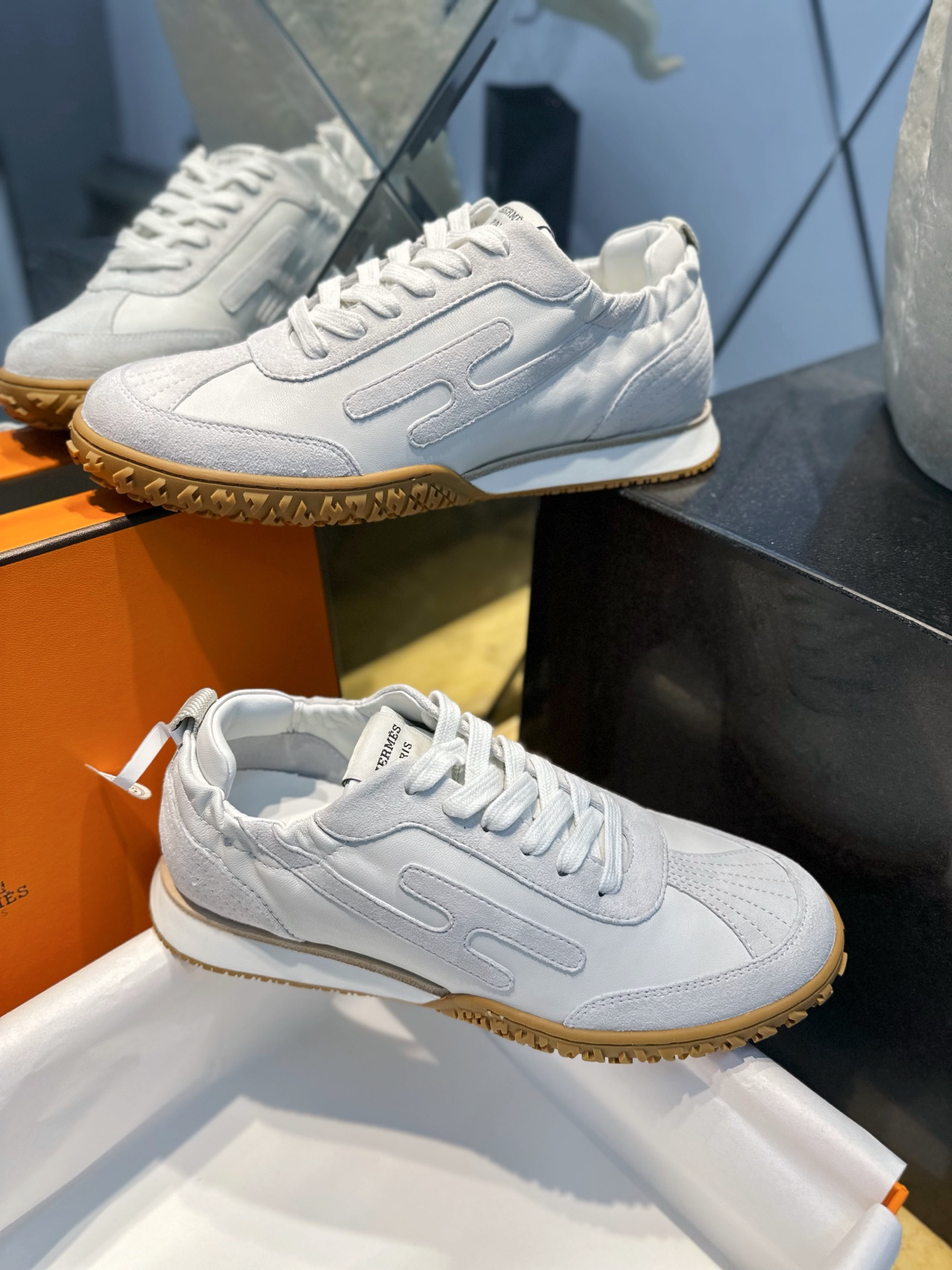 Низкопрофильные кроссовки Hermes в ретро-спортивном стиле с аккуратными строчками и фирменным декоративным элементом на боковой панели.