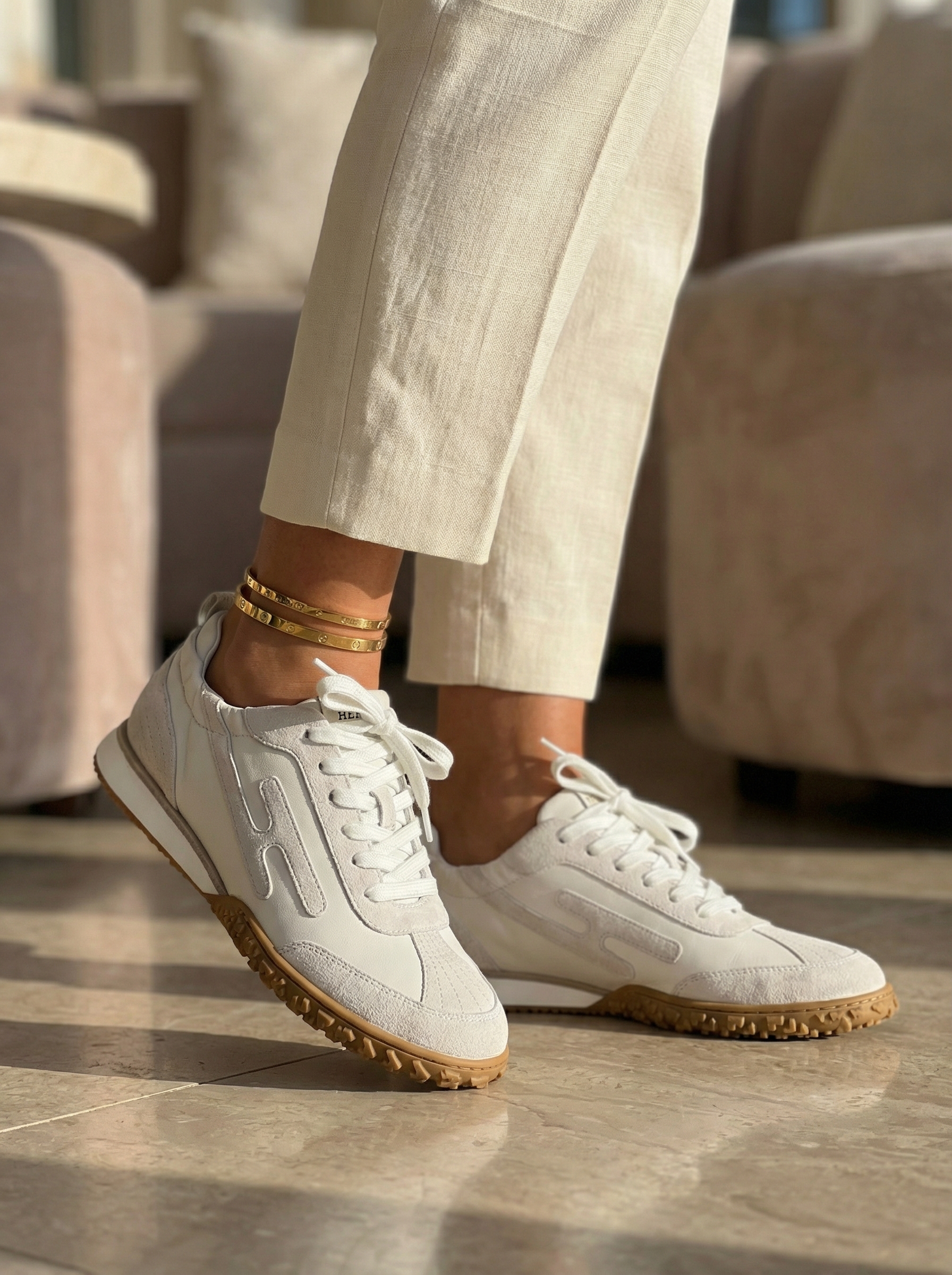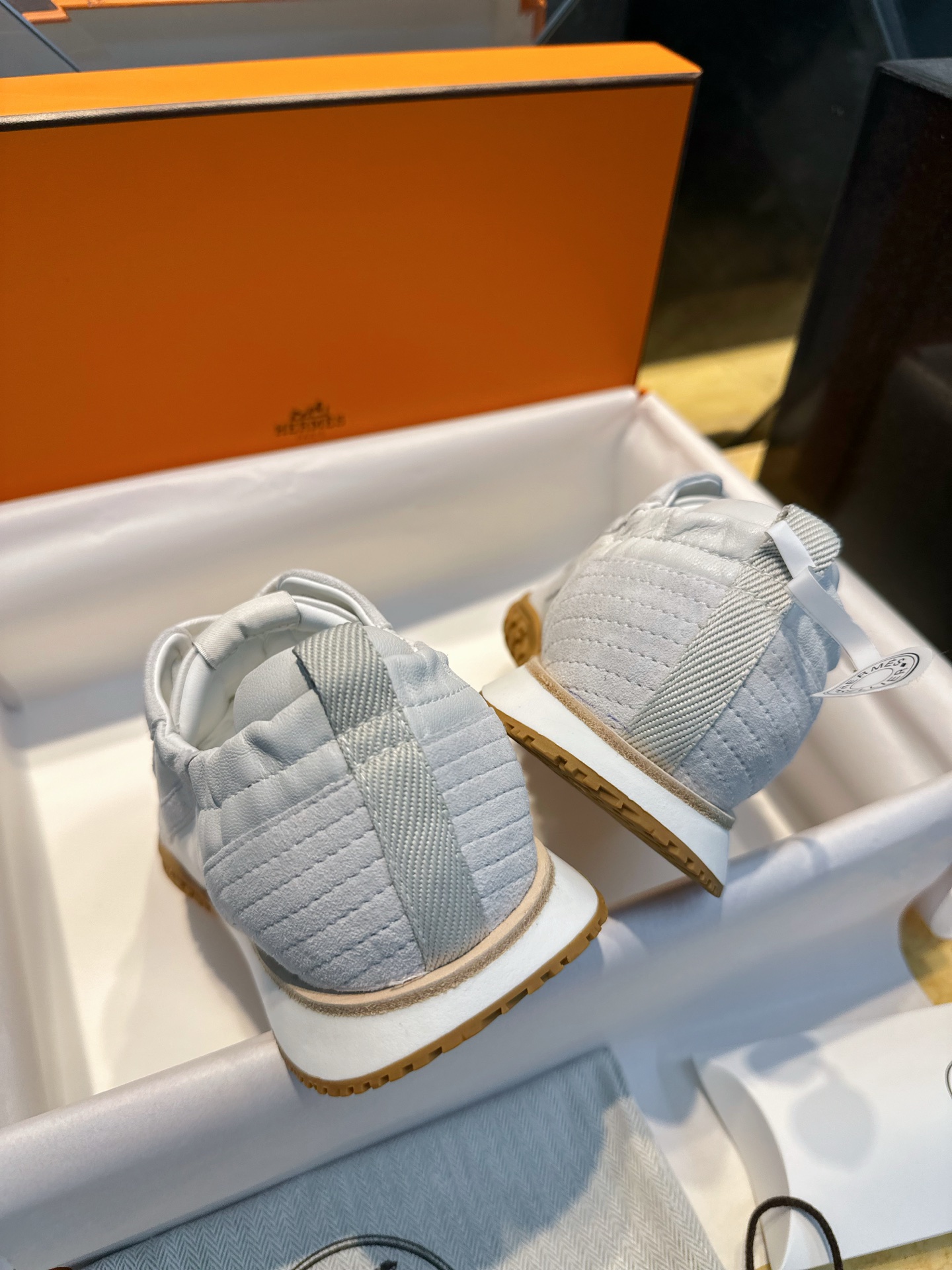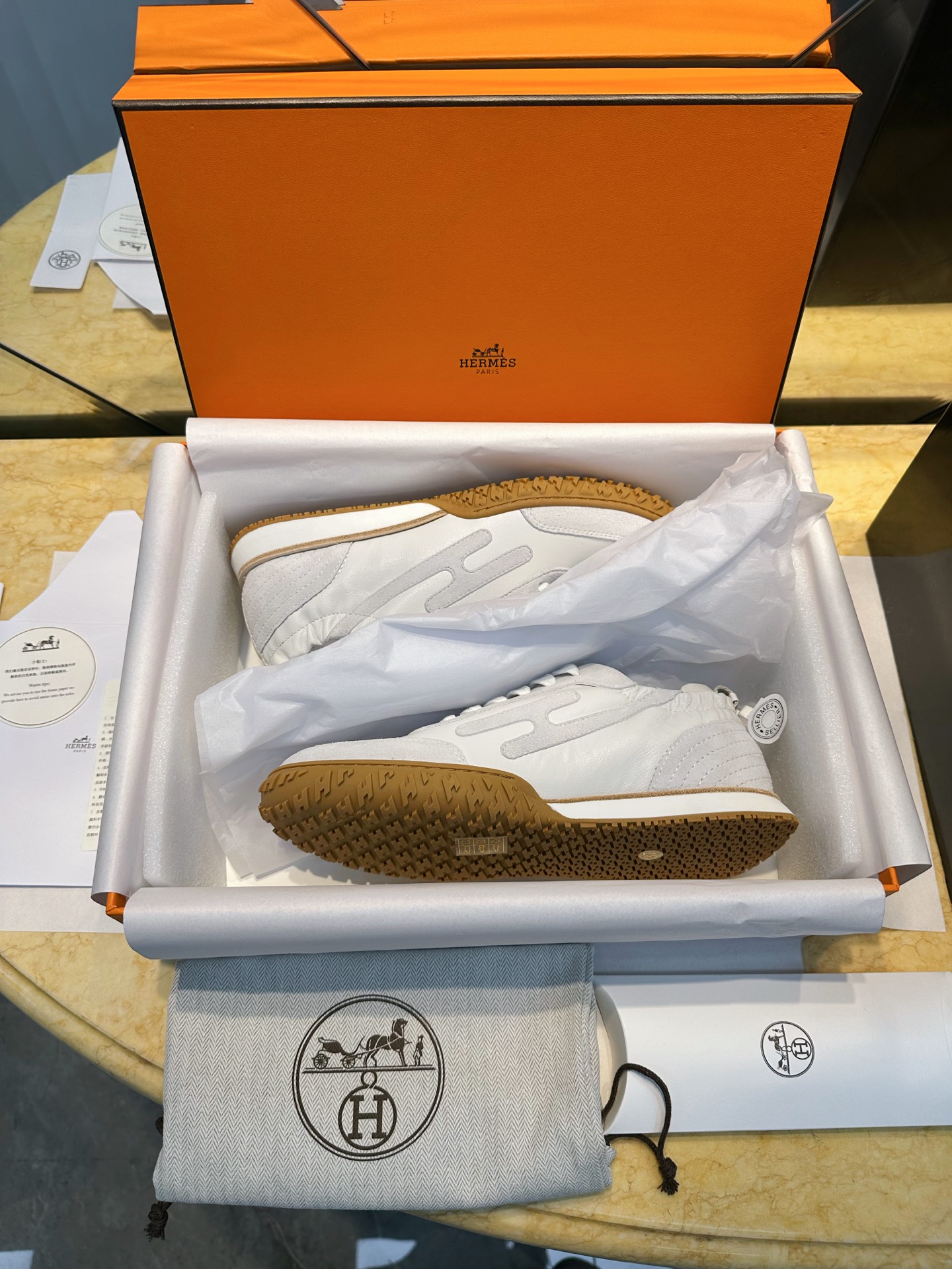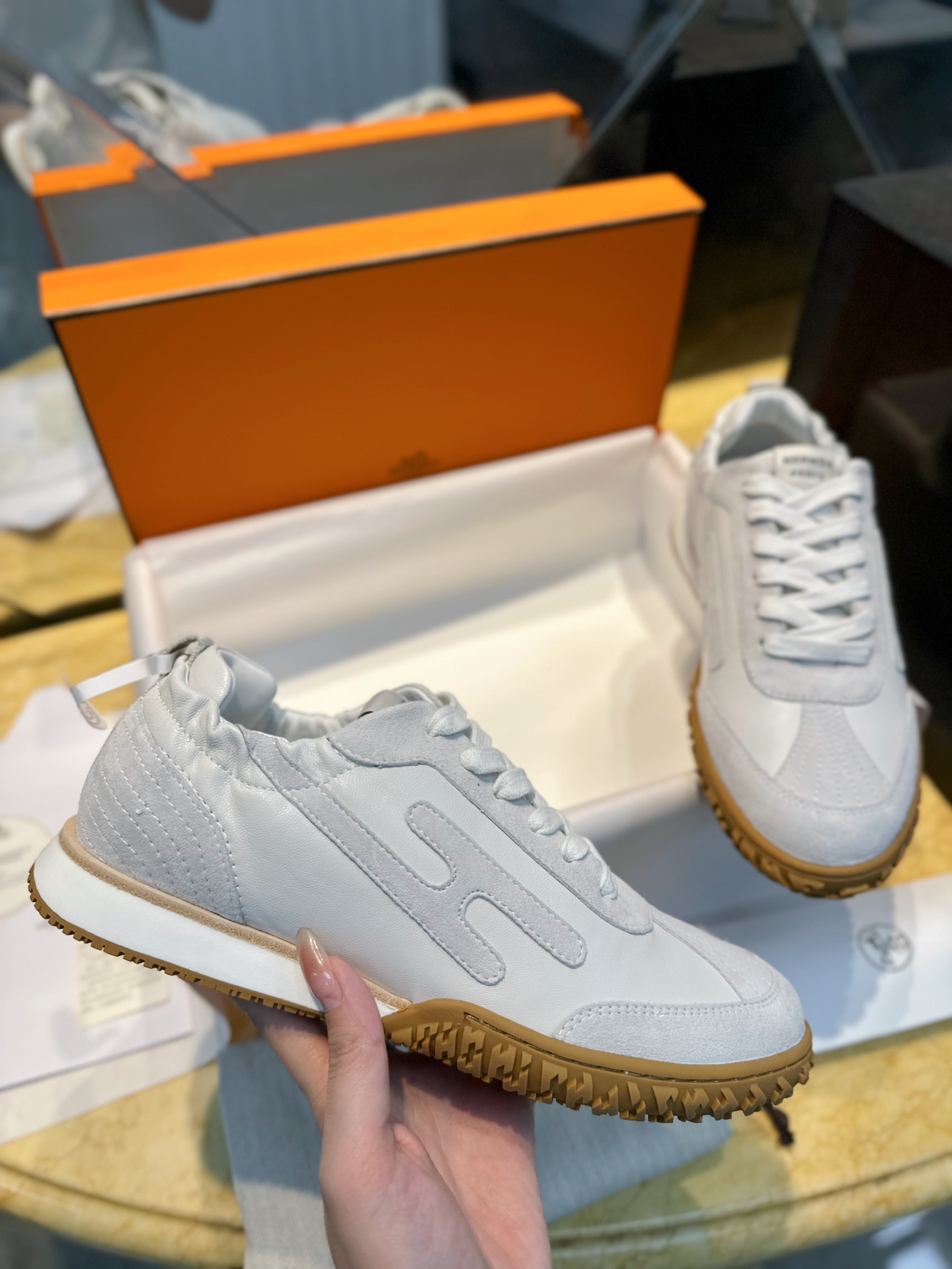Низкопрофильные кроссовки Hermes в ретро-спортивном стиле с аккуратными строчками и фирменным декоративным элементом на боковой панели.
