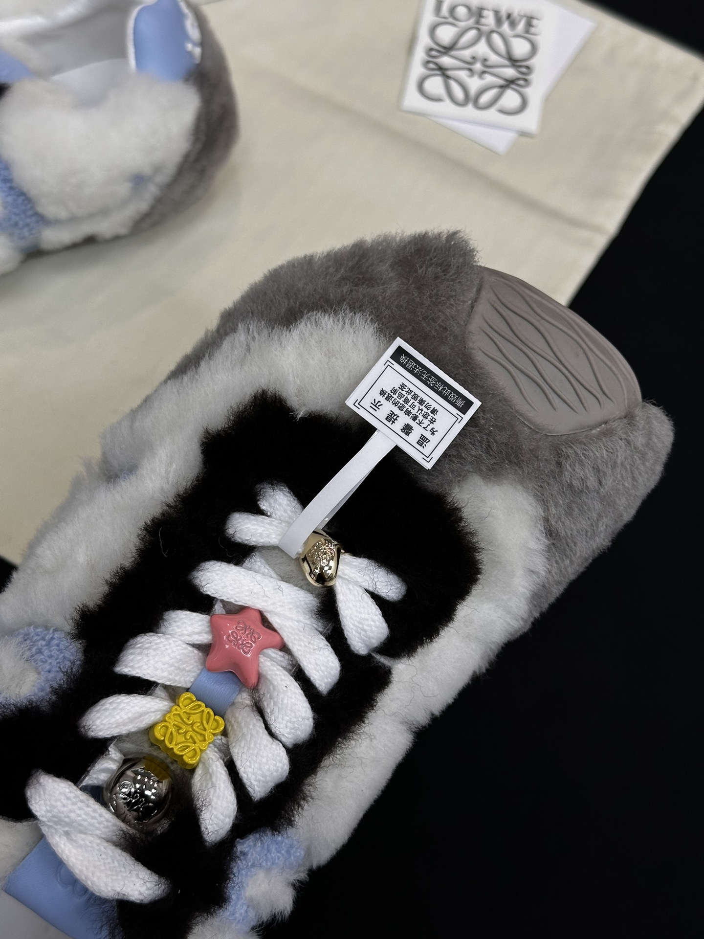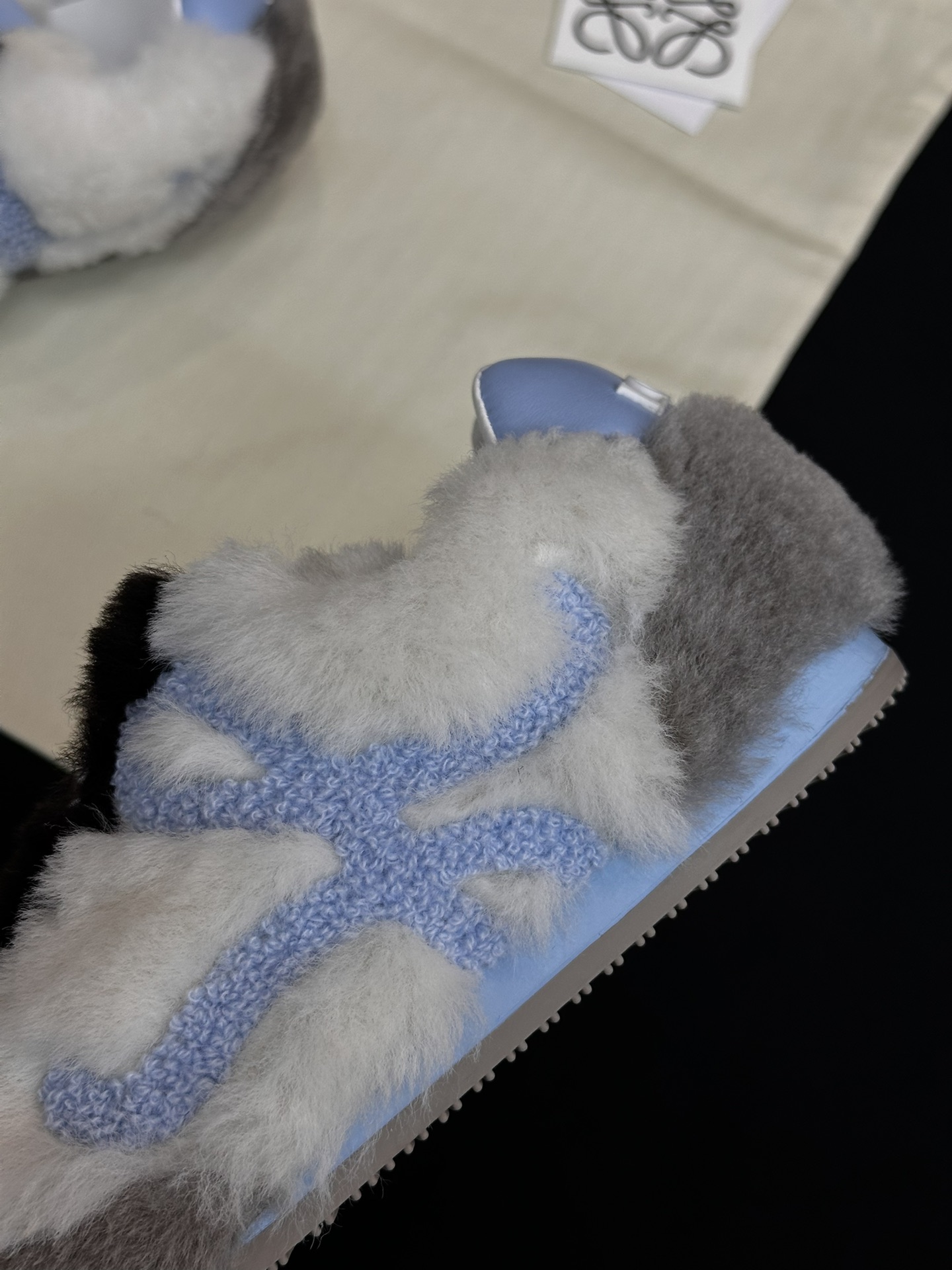 • Верх: цельная овечья кожа с пушистым овечьим ворсом на внешней поверхности — мягкая, объёмная текстура с контрастными панелями (серый, чёрный, белый, нежно-голубой).