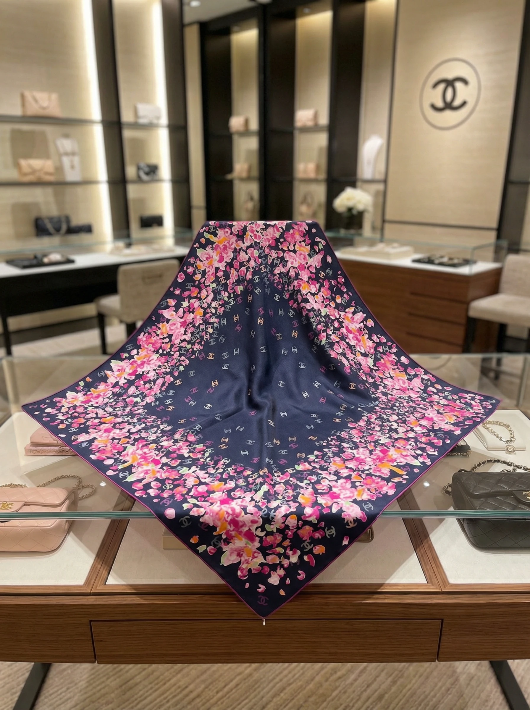 Элегантный женский платок Chanel из натурального шелка — воплощение утончённого стиля и роскоши. Глубокий тёмно-синий фон украшен изысканным цветочным узором в розовых, фиолетовых и оранжевых тонах, создающим эффект рассыпанных лепестков.
