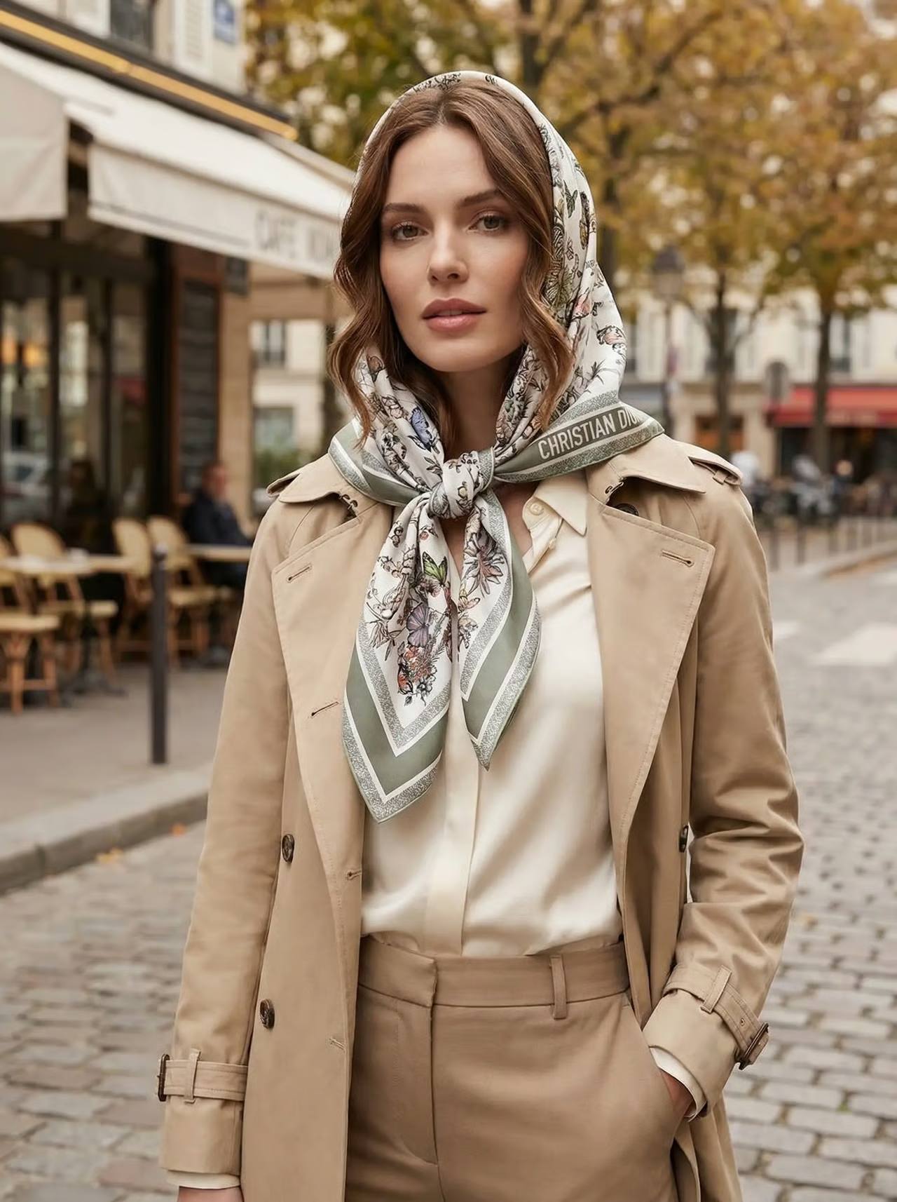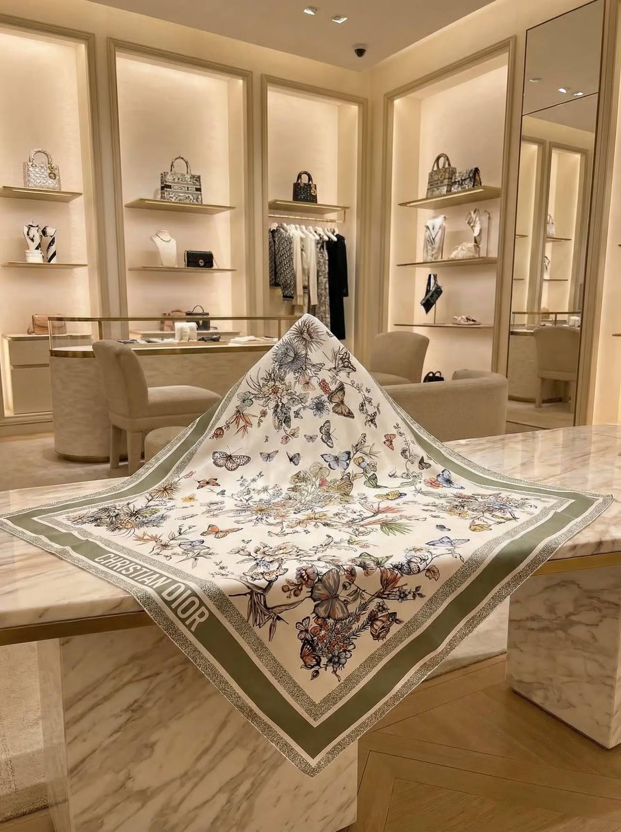 Элегантный женский платок из шелка от Christian Dior — это воплощение утончённого стиля и изысканности. Лёгкая и нежная ткань украшена изящным принтом, изображающим цветы и порхающих бабочек, создавая атмосферу свежести и романтики.