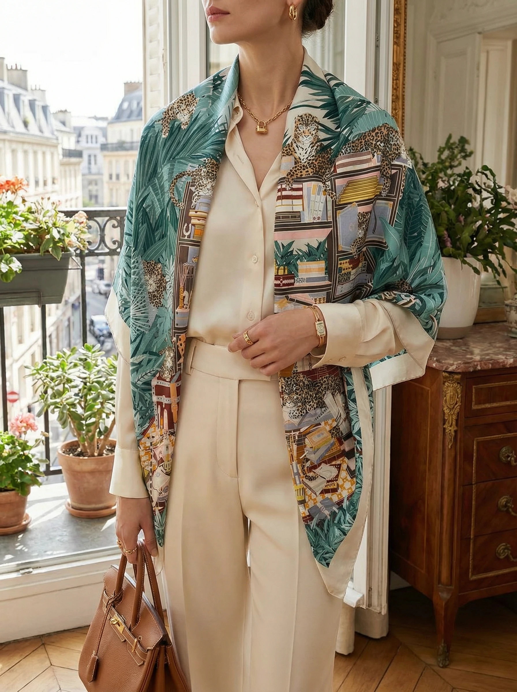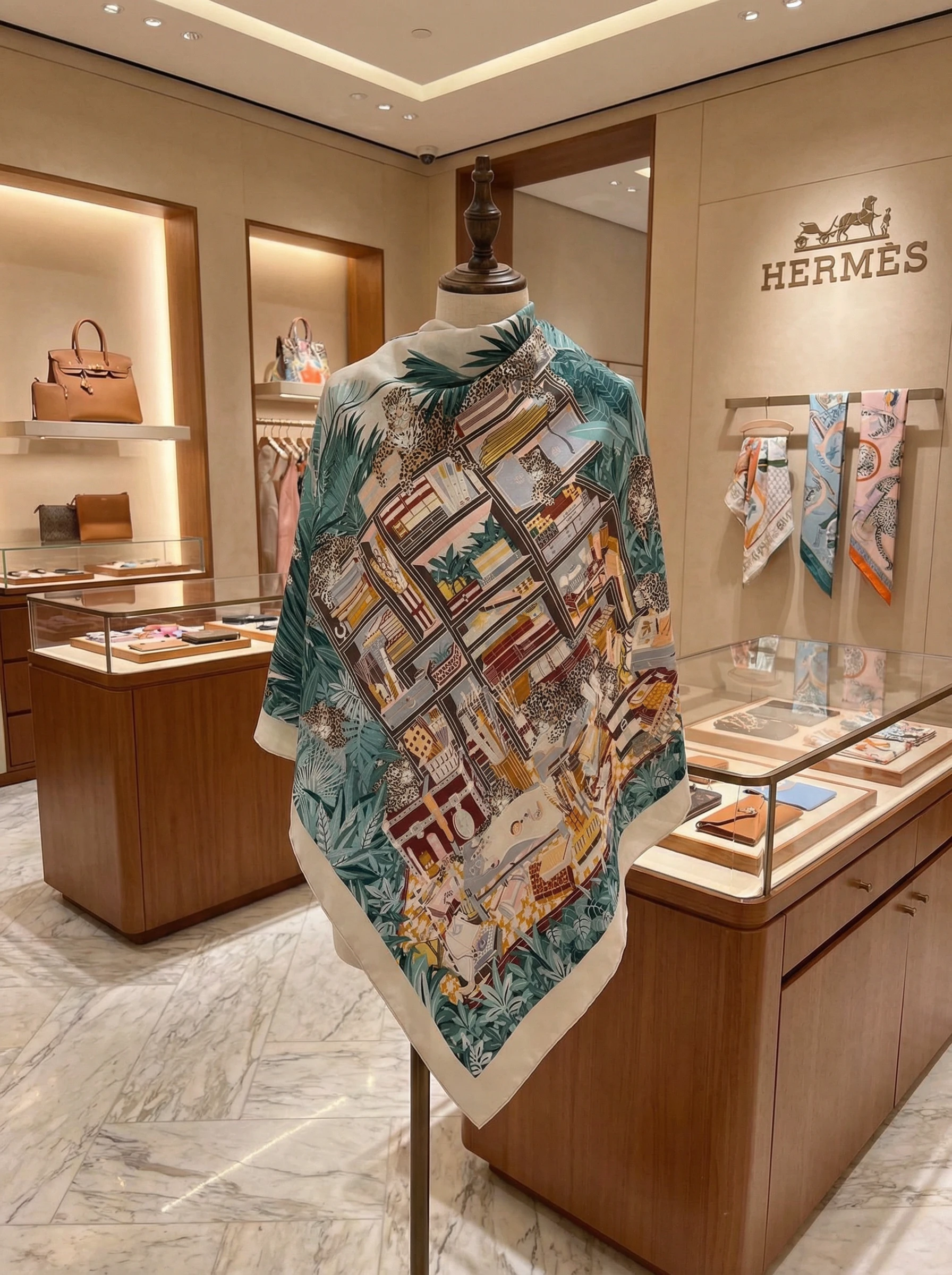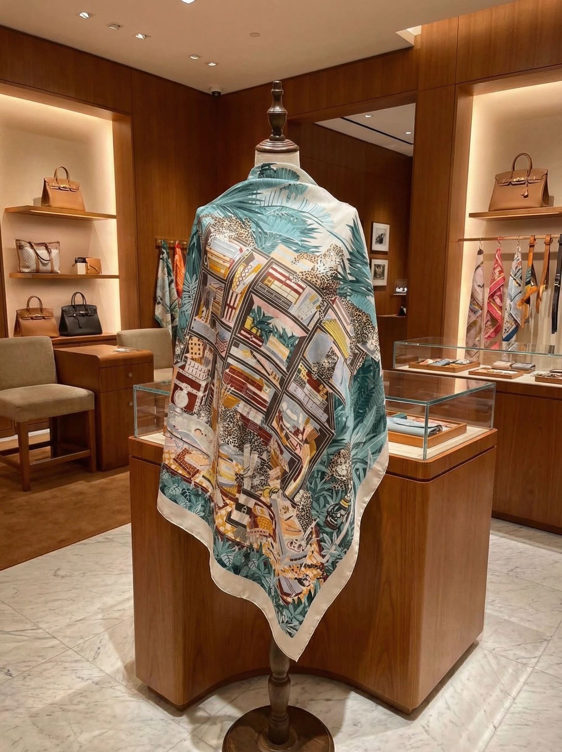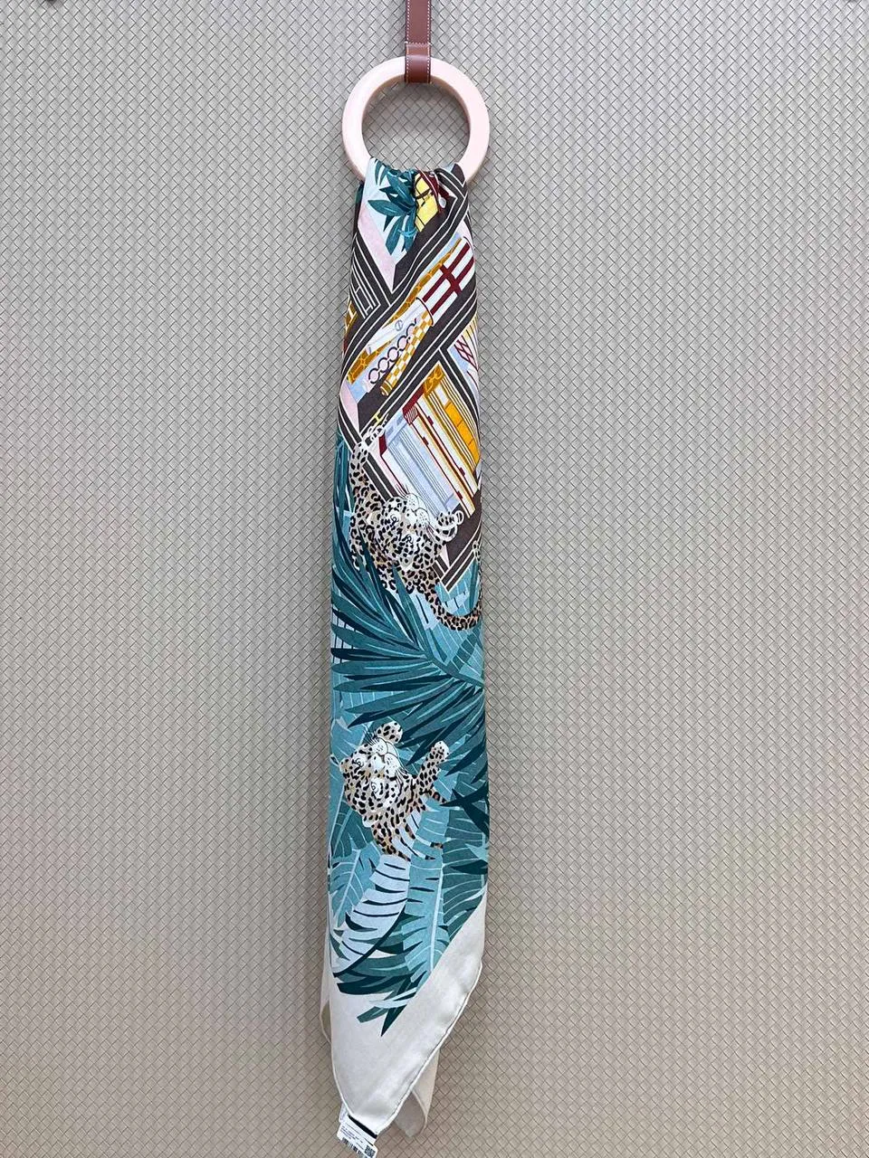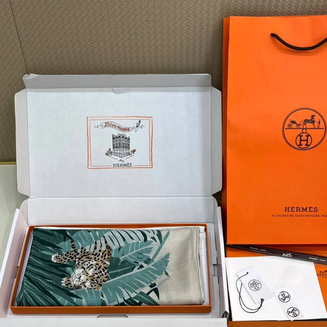 Этот роскошный платок Hermes азмером 140×140 см выполнен из смеси кашемира и шёлка, что обеспечивает одновременно тепло, лёгкость и мягкую, приятную на ощупь драпировку. Благодаря шелковистому отблеску и плотной структуре кашемира рисунок смотрится насыщенно и объёмно — мелкие детали сохраняются даже при сложенном ношении. Палитра — спокойные бирюзовые, зелёные и бежево-коричневые тона — легко комбинируется с как с нейтральной, так и с яркой одеждой.