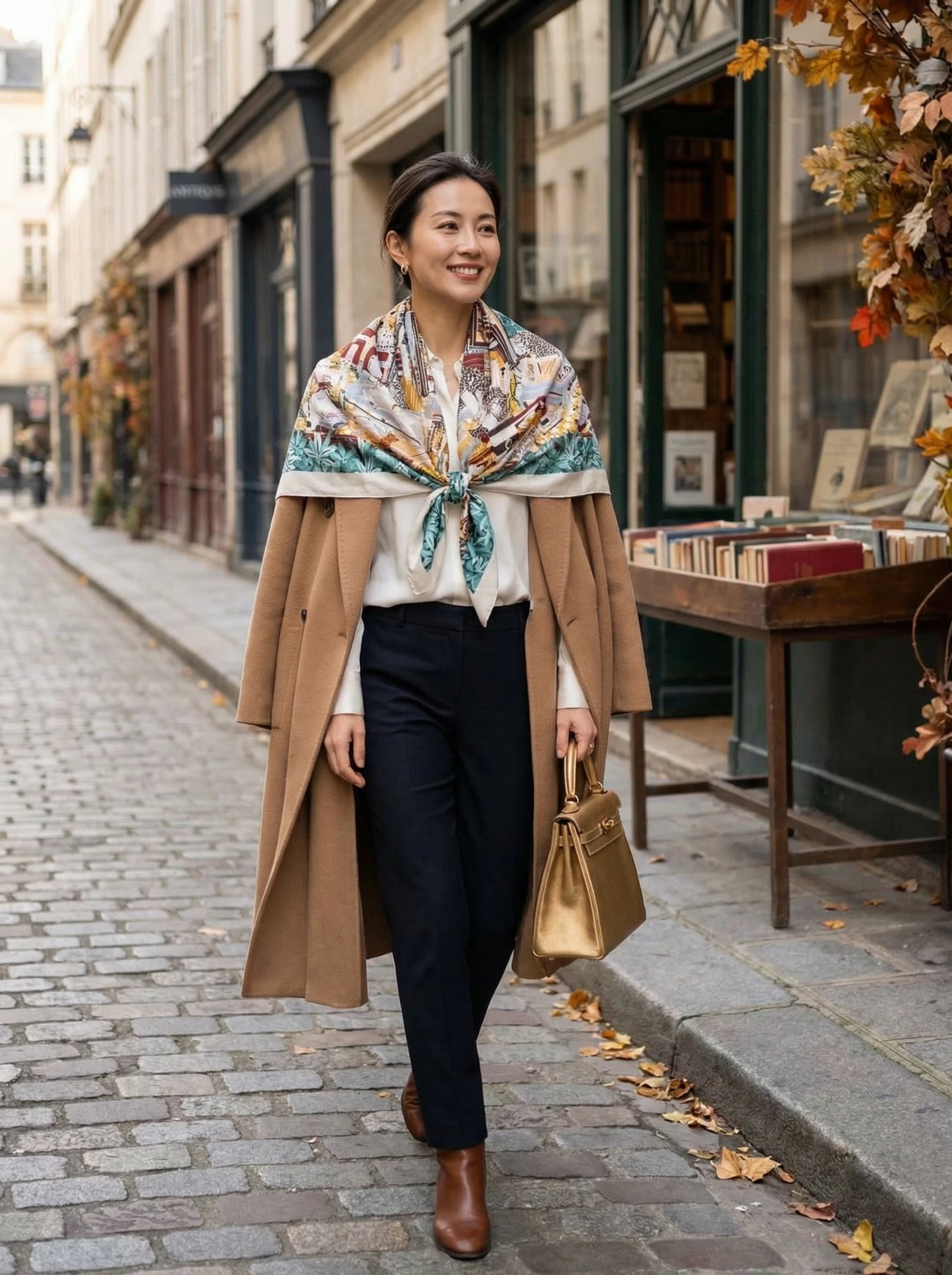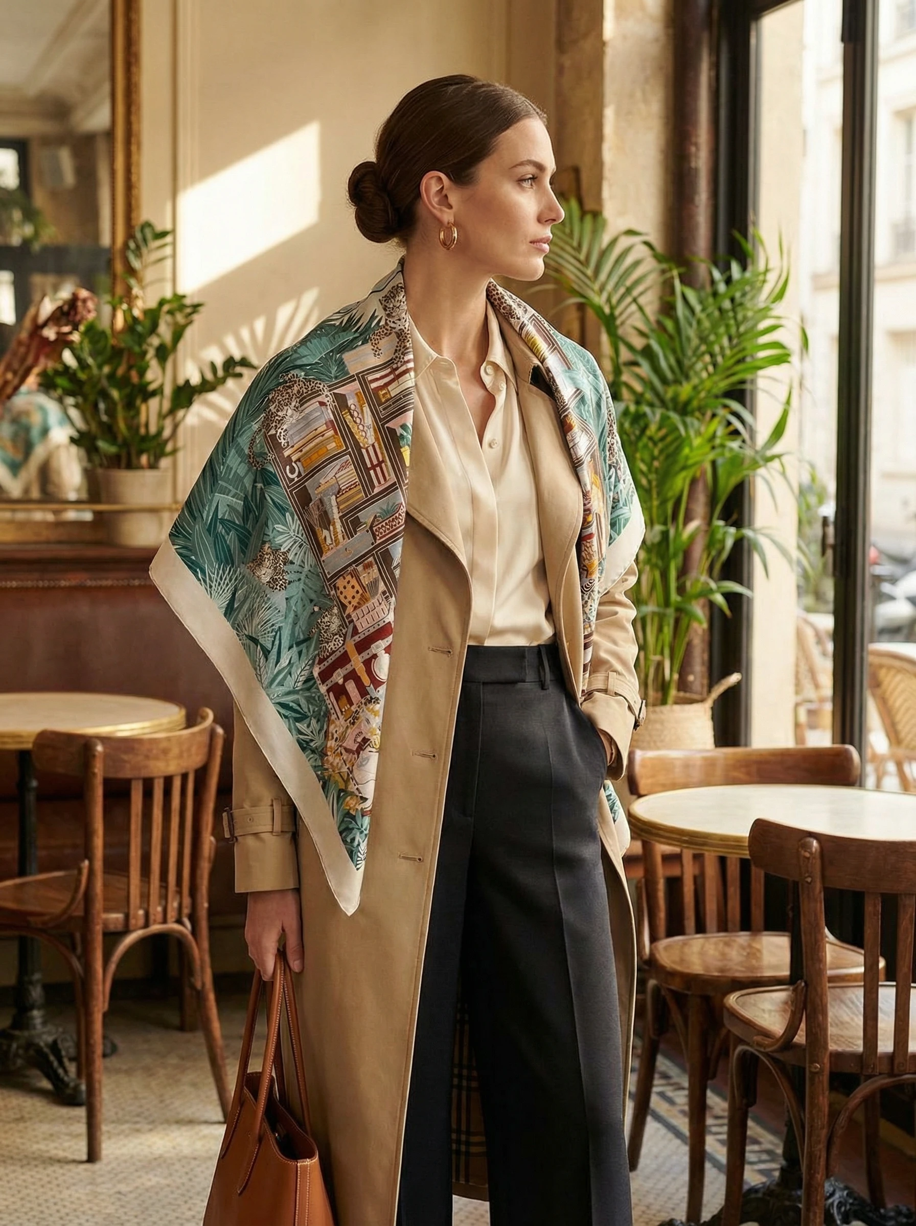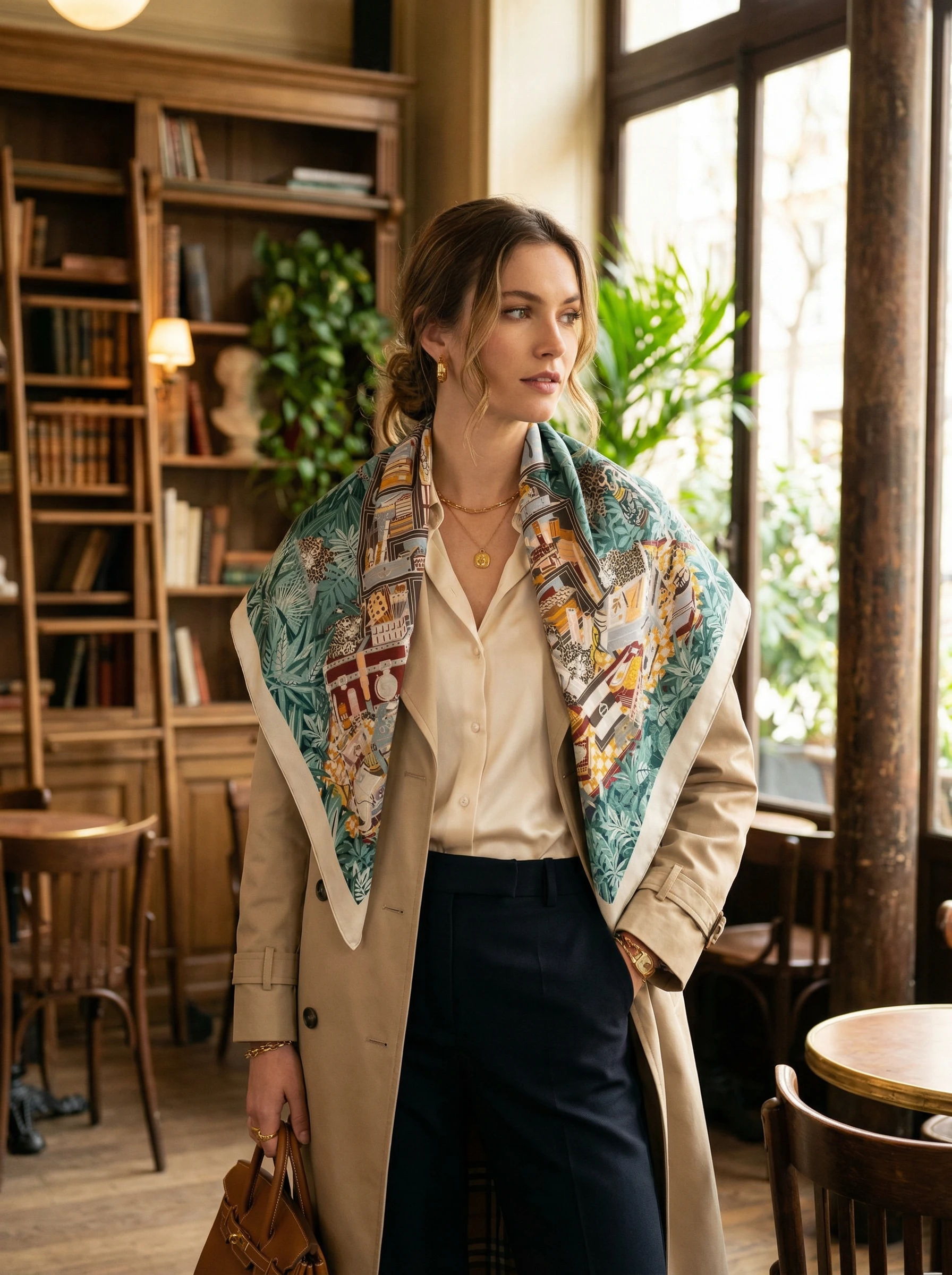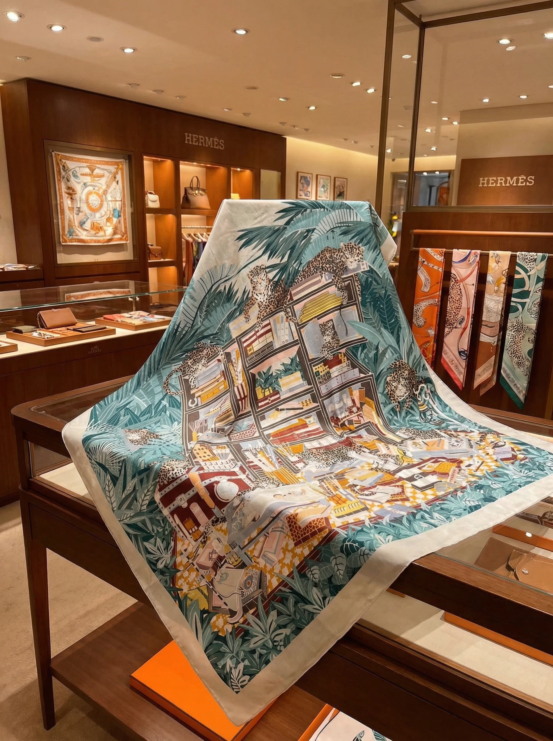 Этот роскошный платок Hermes азмером 140×140 см выполнен из смеси кашемира и шёлка, что обеспечивает одновременно тепло, лёгкость и мягкую, приятную на ощупь драпировку. Благодаря шелковистому отблеску и плотной структуре кашемира рисунок смотрится насыщенно и объёмно — мелкие детали сохраняются даже при сложенном ношении. Палитра — спокойные бирюзовые, зелёные и бежево-коричневые тона — легко комбинируется с как с нейтральной, так и с яркой одеждой.