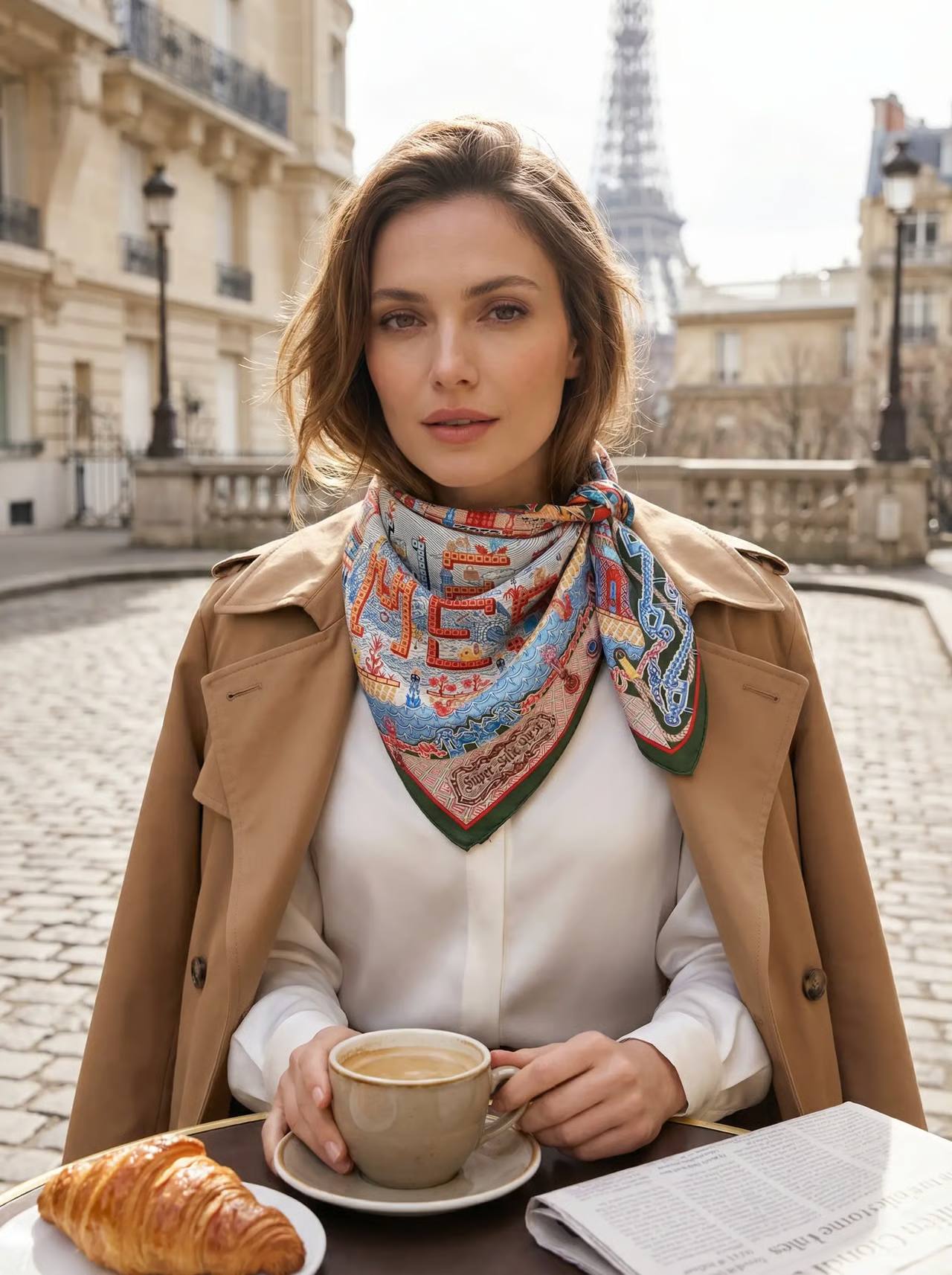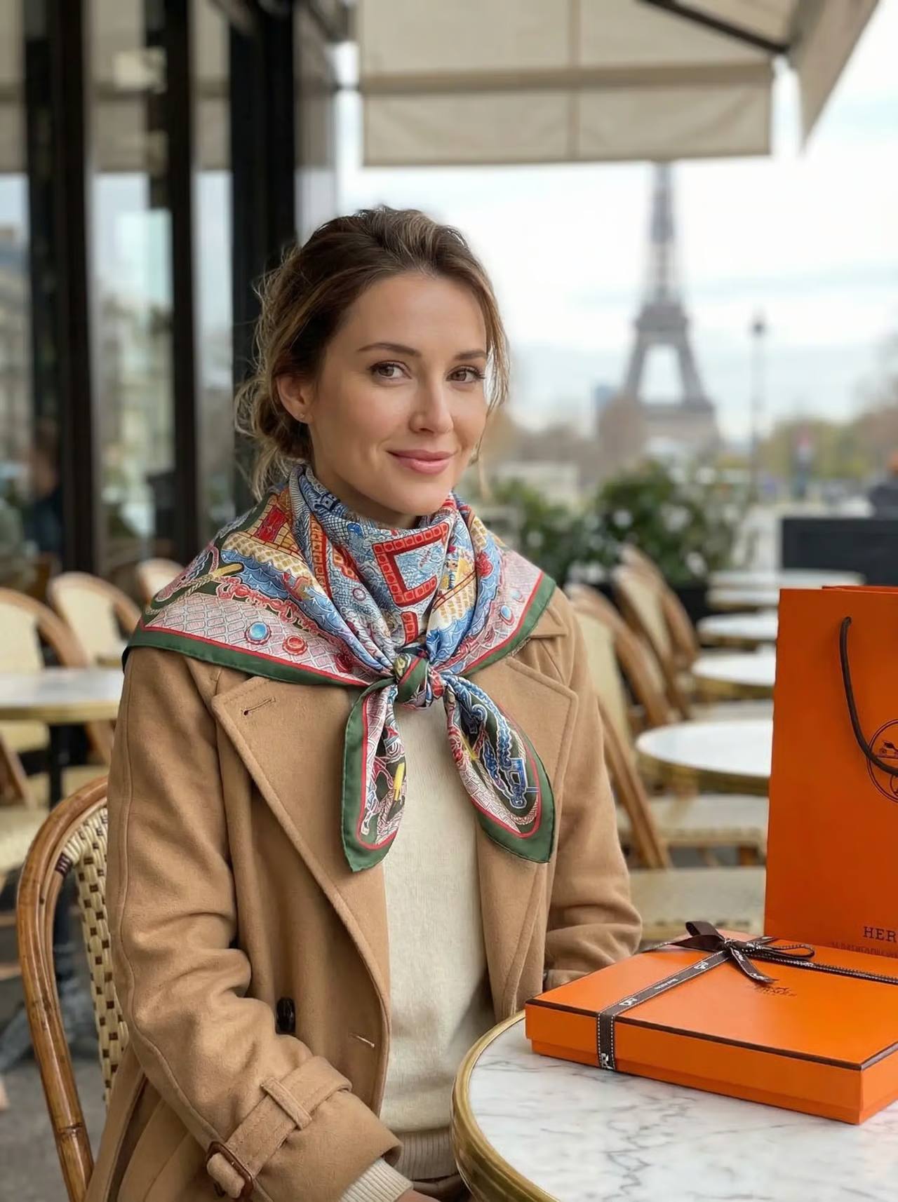 Шелковый платок Hermes — это воплощение утончённого стиля и высокого искусства французского дома моды. Яркий дизайн украшен сложным и детализированным орнаментом с фантазийными элементами: по бокам — мифические существа и сказочные мотивы, в центре — крупная графика с названием бренда.