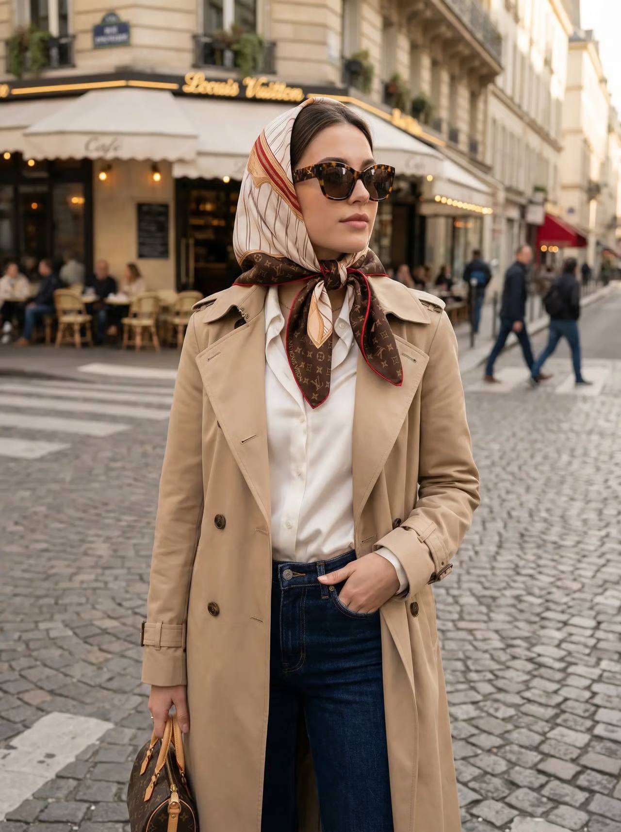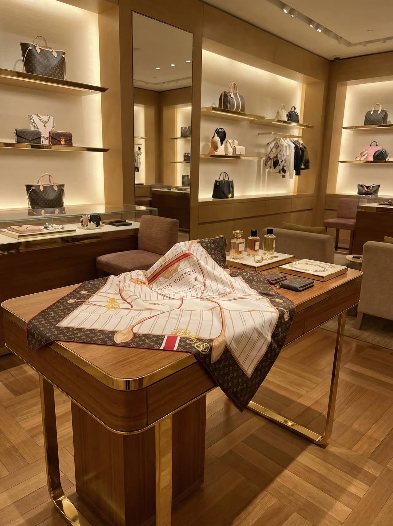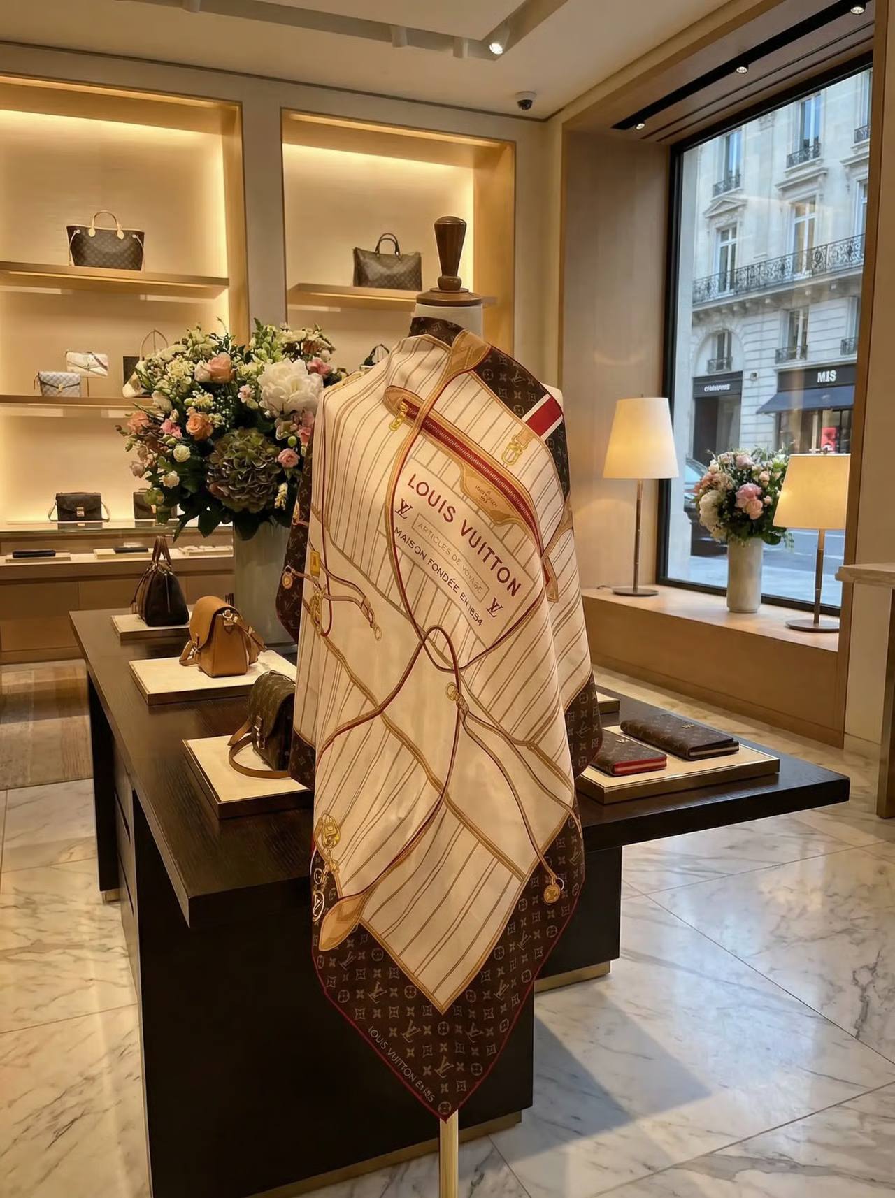 В центре размещён логотип Louis Vuitton и надпись «Maison fondée en 1854», подчёркивающие богатую историю бренда. Детальная прорисовка ремешков, металлических замков и декоративных элементов придаёт платку роскошный и утончённый вид. Этот аксессуар идеально дополнит любой образ, добавив ему нотки французского шика и статуса.