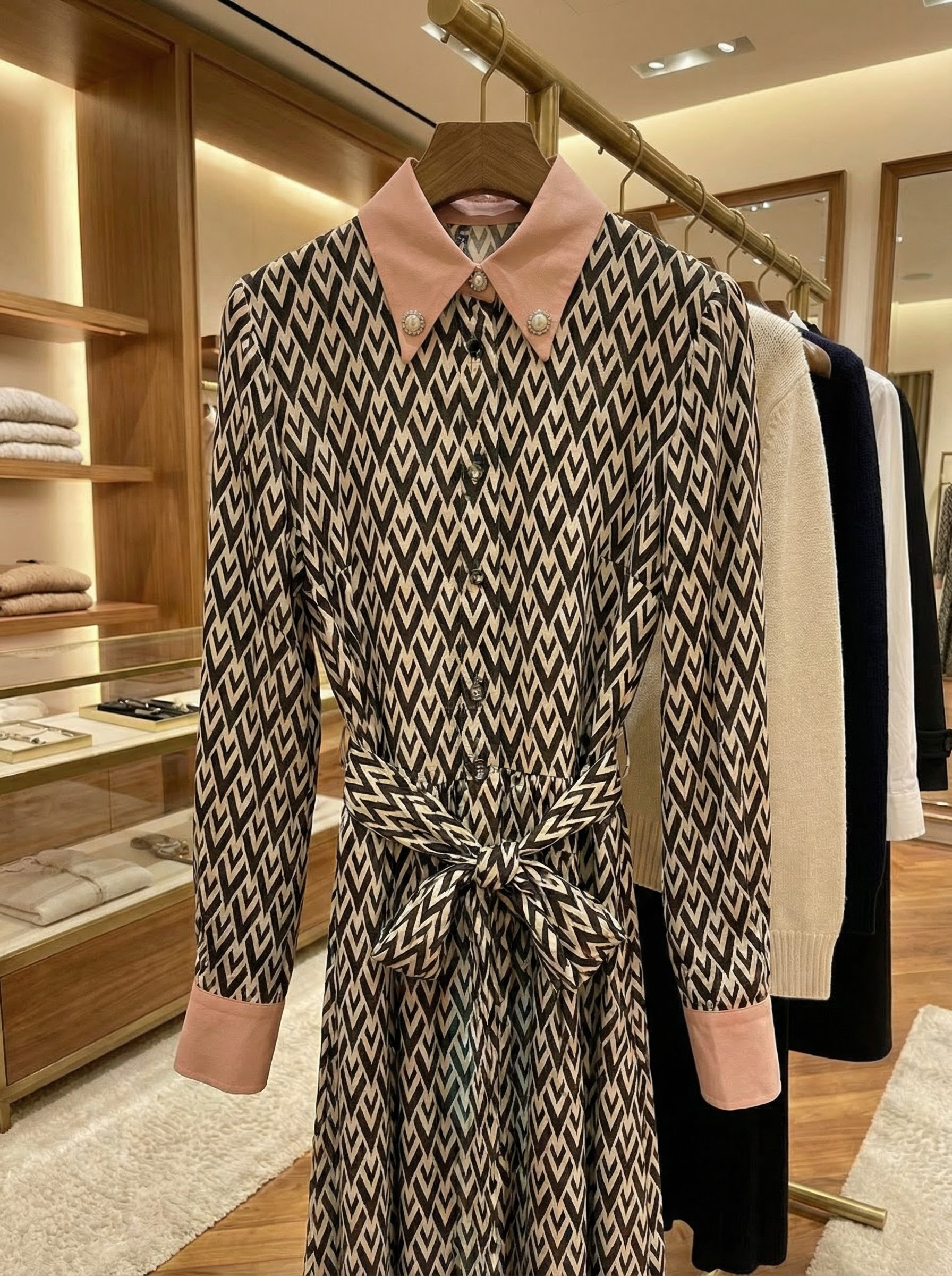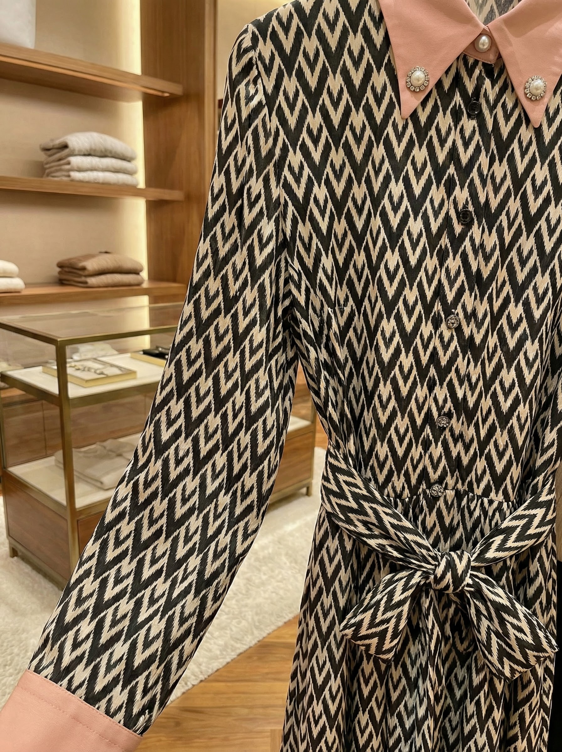 Роскошное платье от Valentino, выполненное из шелка и твила, представляет собой изысканное сочетание классического силуэта и смелого дизайна. Нежный цветочный узор изящно переплетается с золотыми и черными буквами Valentino, создавая эффектный и запоминающийся образ. Акцентные детали, такие как воротник и манжеты с пряжками, инкрустированными розовыми перламутровыми стразами, и пояс, подчеркивающий талию, добавляют платью завершенность и утонченность.