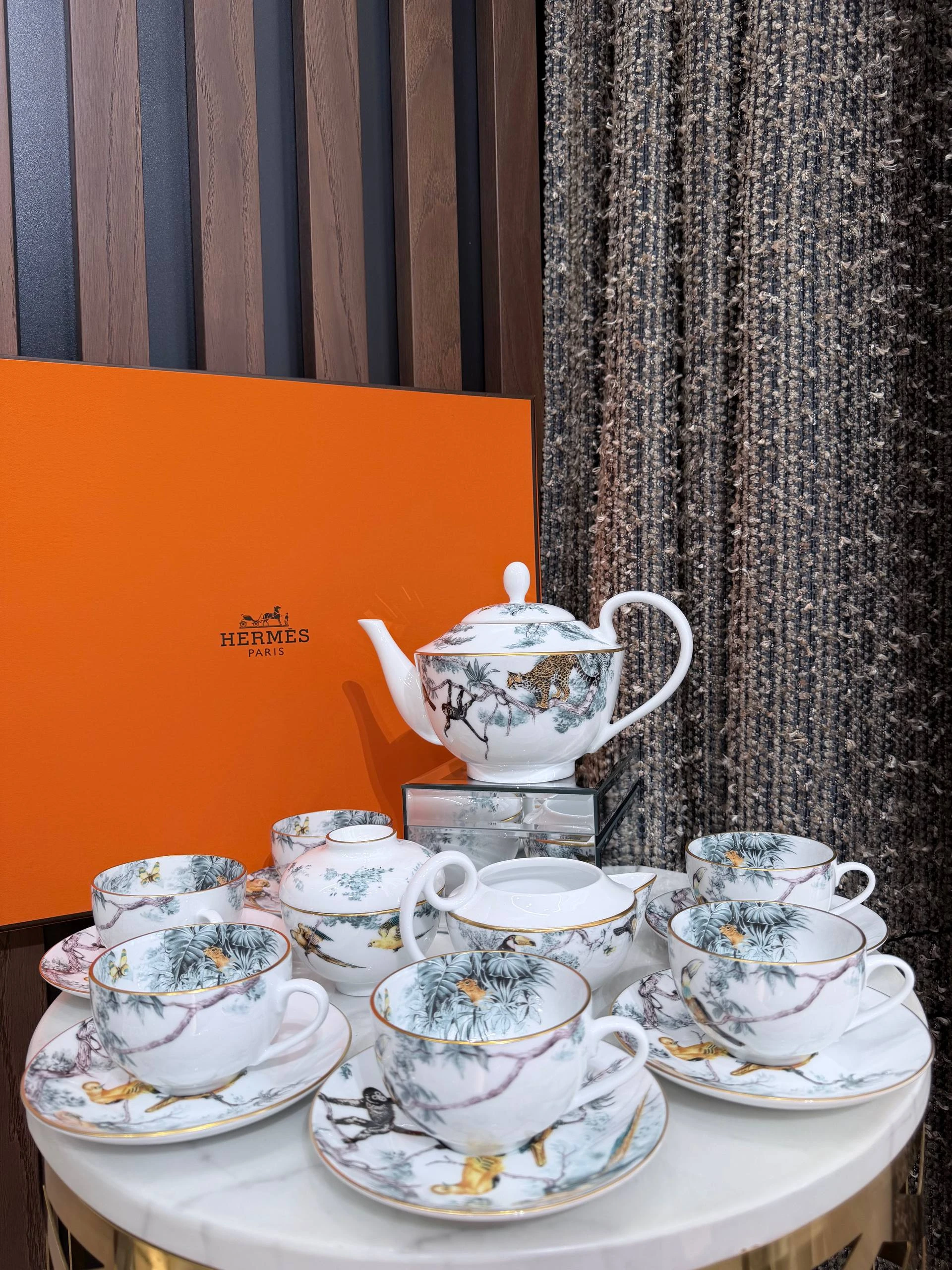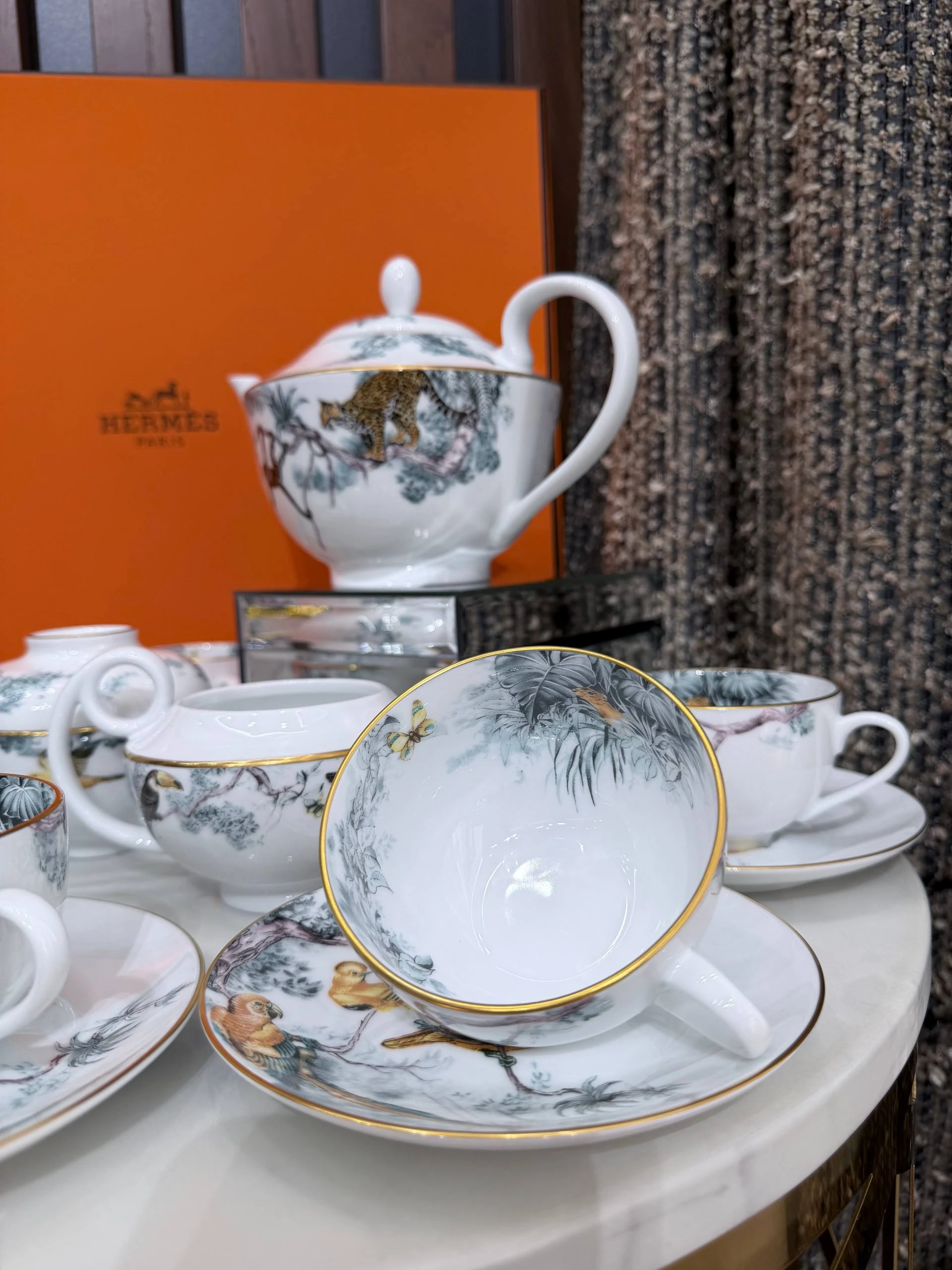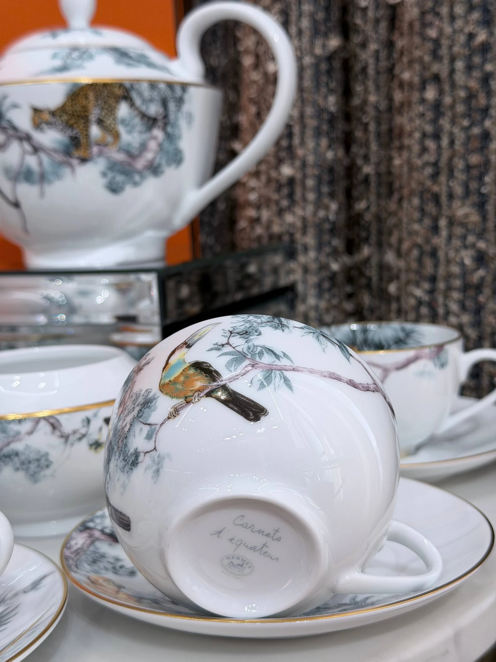 Изысканный комплект из тонкого фарфора от Hermès, коллекция Carnets d’Équateur. Нежная растительная и экзотическая фаунистическая роспись в пастельно‑бирюзовых и золотистых тонах с тонкой золочёной окантовкой придаёт сервизу утончённый и одновременно авантюрный характер. Идеально подойдёт для особых чаепитий или как коллекционная вещь и подарок.