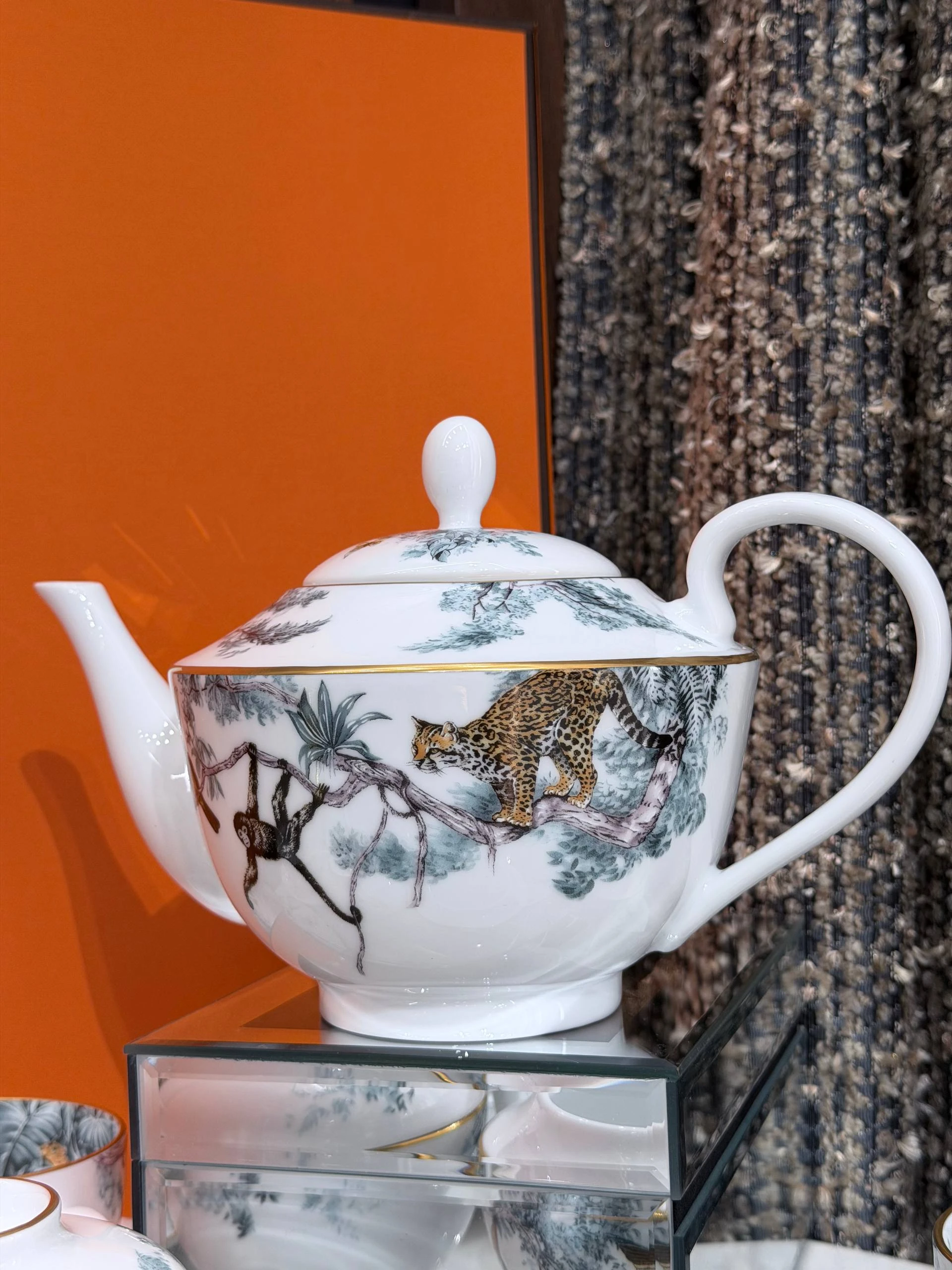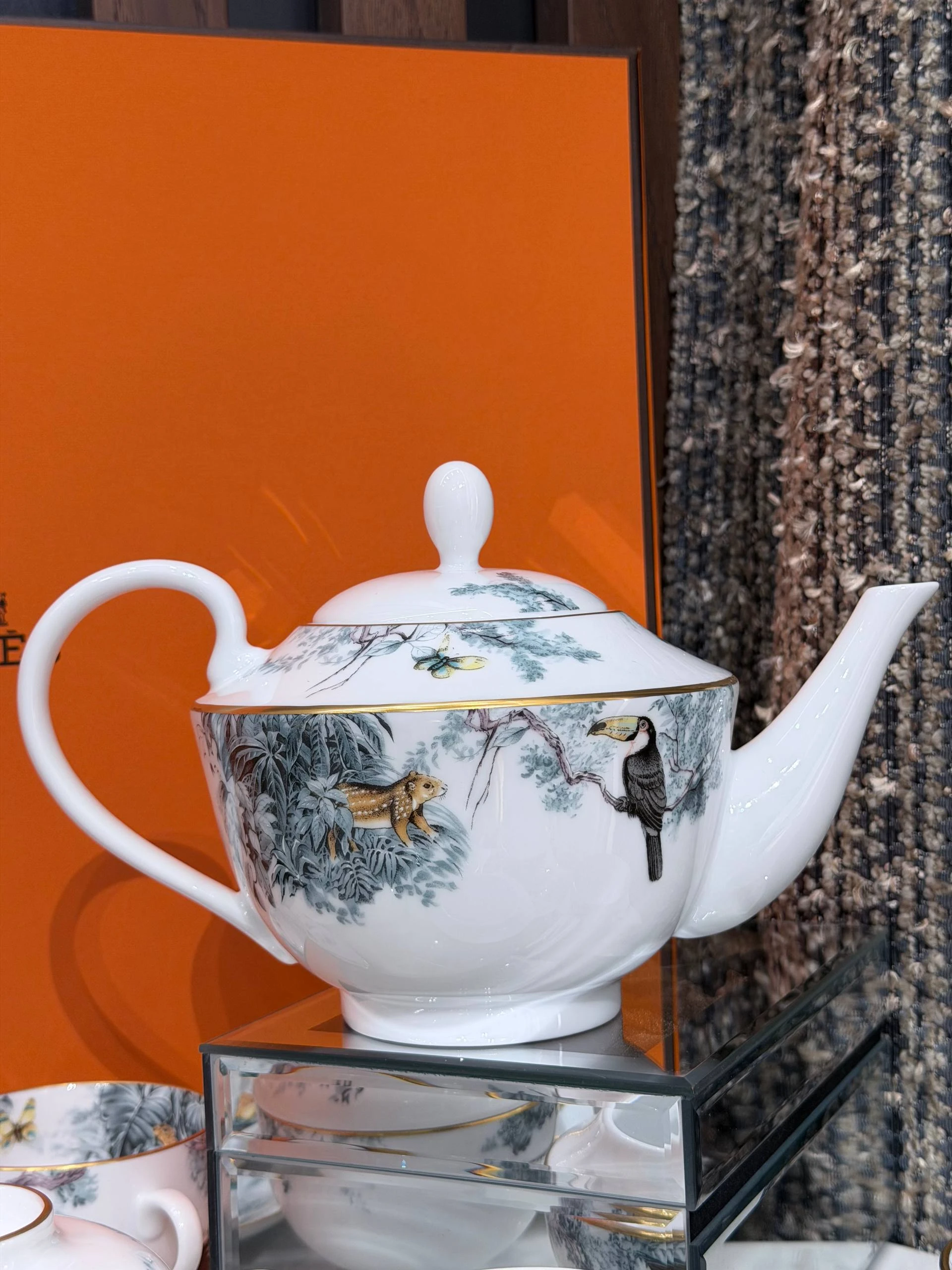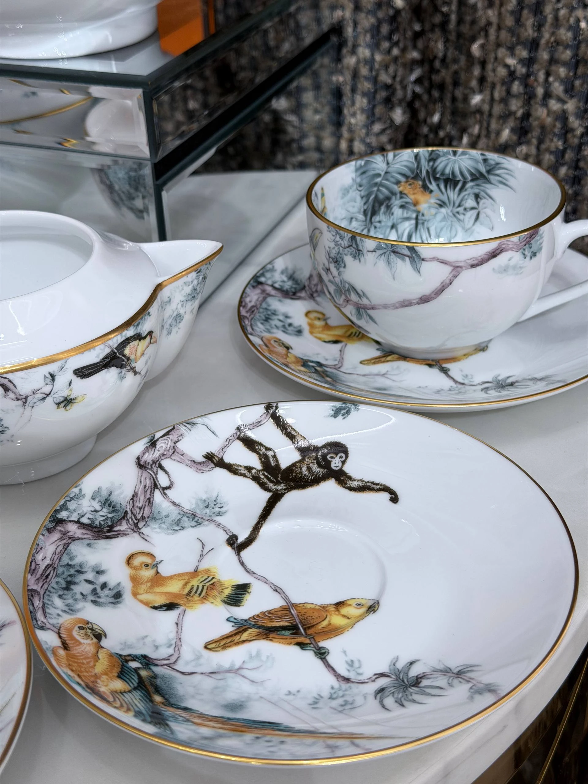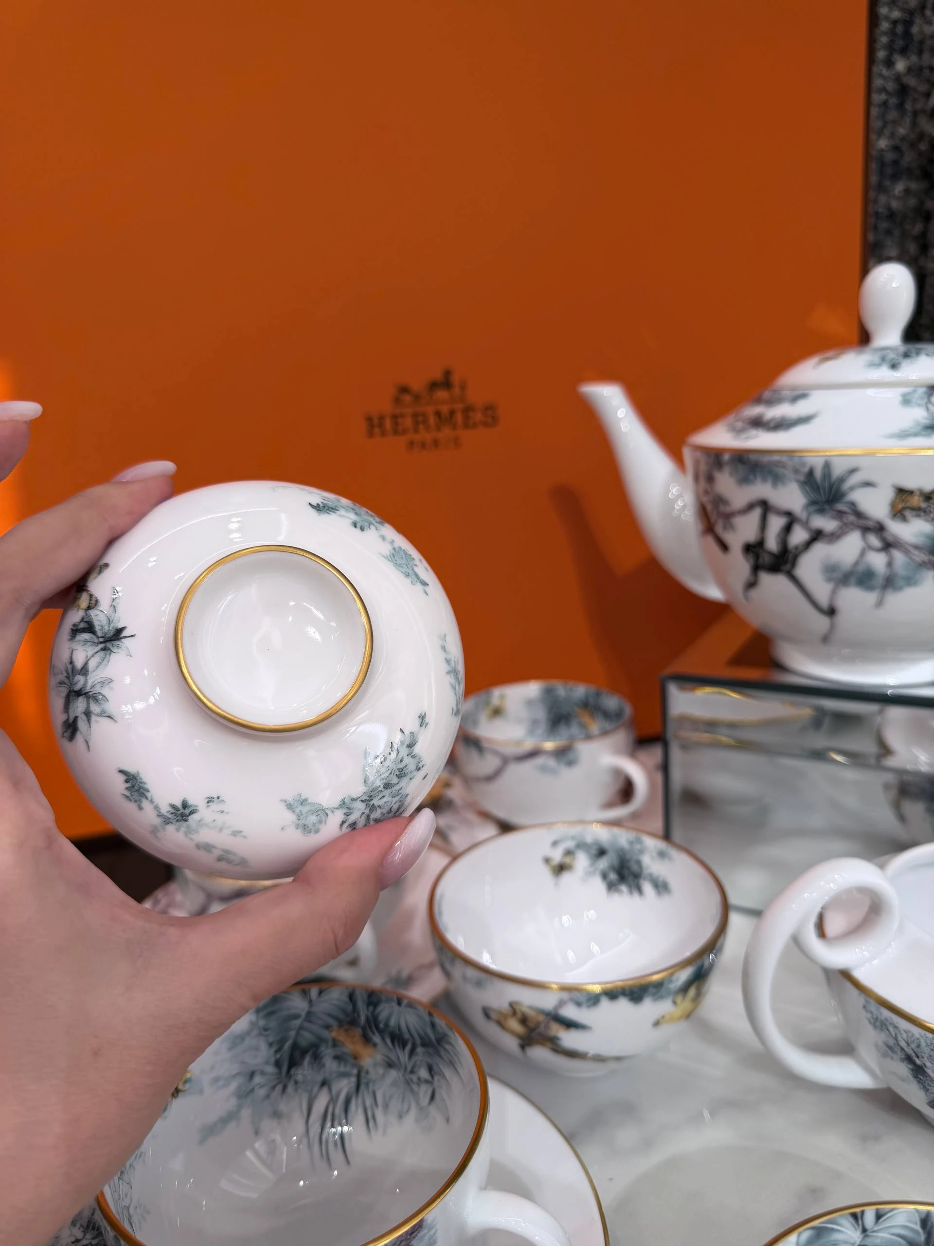 Изысканный комплект из тонкого фарфора от Hermès, коллекция Carnets d’Équateur. Нежная растительная и экзотическая фаунистическая роспись в пастельно‑бирюзовых и золотистых тонах с тонкой золочёной окантовкой придаёт сервизу утончённый и одновременно авантюрный характер. Идеально подойдёт для особых чаепитий или как коллекционная вещь и подарок.