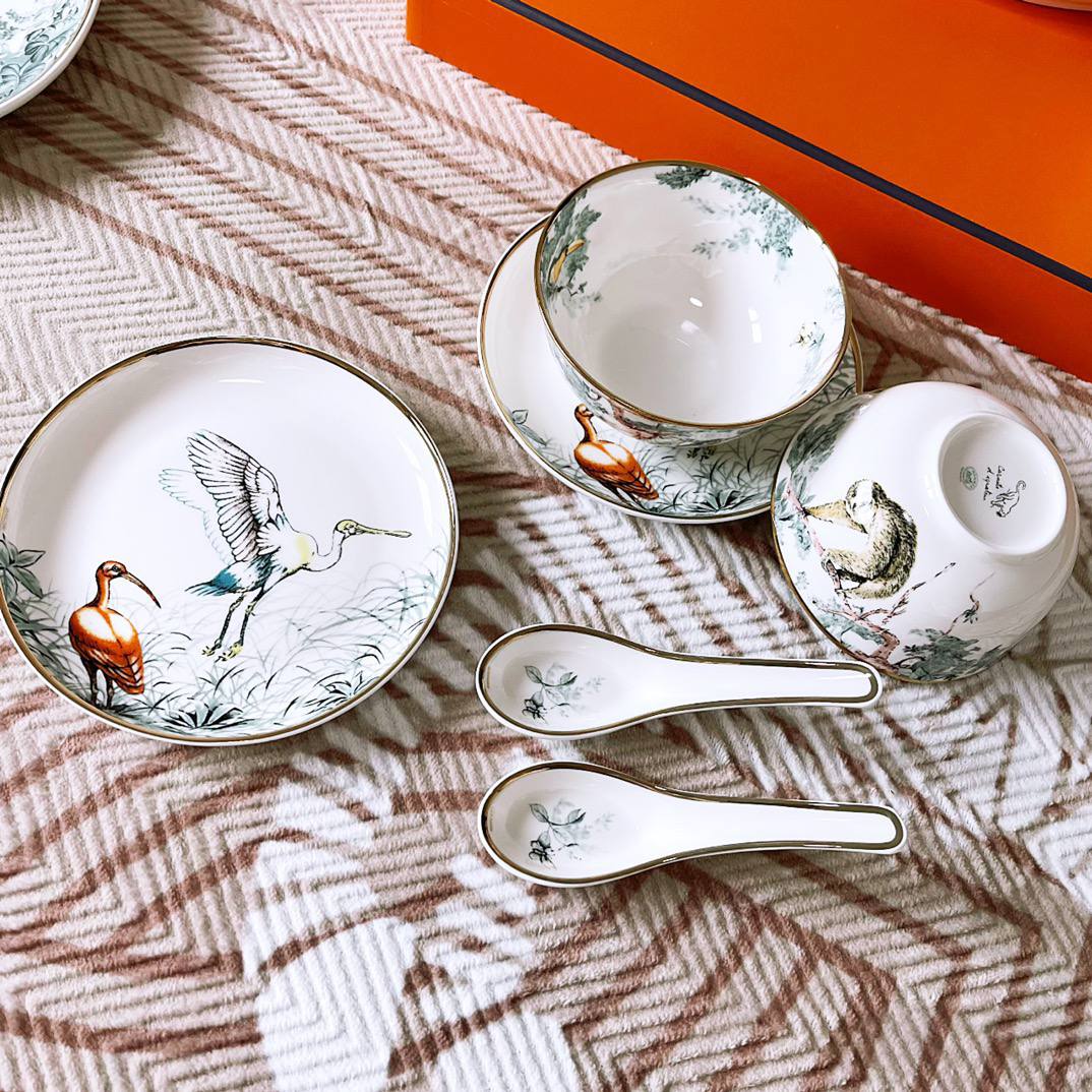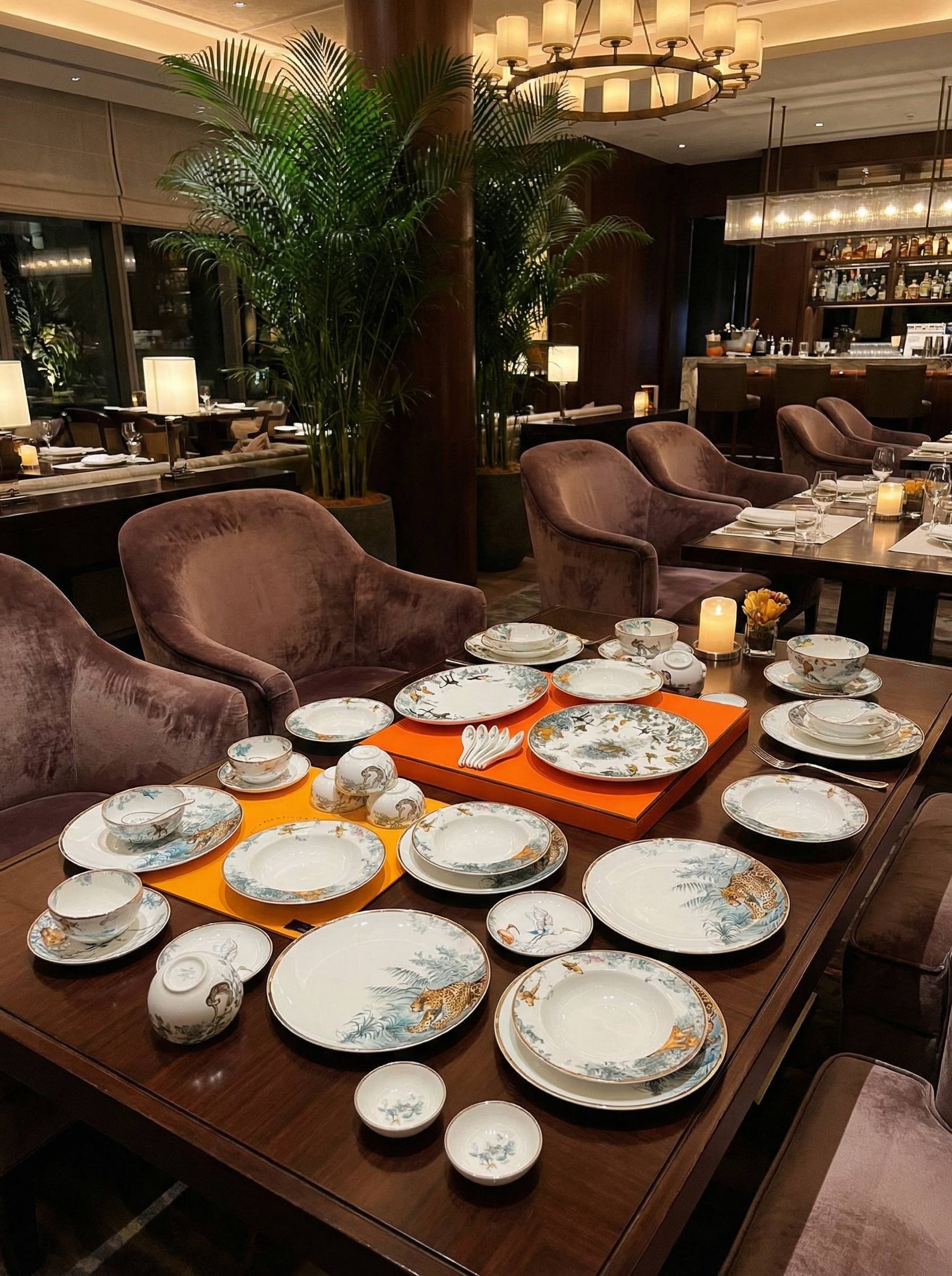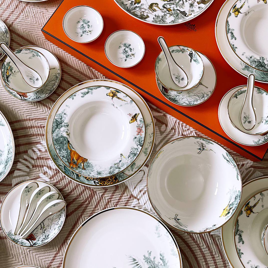 Набор посуды HERMES, 41 предмет — изысканный комплект из тончайшего костяного фарфора с авторским декоративным рисунком «сафари/саванна». Идеальное решение для праздничной сервировки и повседневного использования в стильной столовой или гостиной.