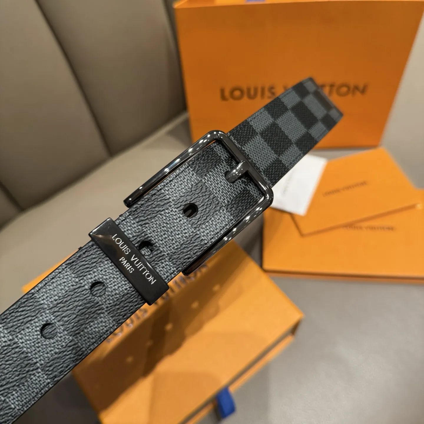 Ремень Louis Vuitton выполнен из высококачественной кожи с фирменным клетчатым принтом Damier Graphite. Элегантная металлическая пряжка доступна в нескольких оттенках — серебристом, золотистом и чёрном.