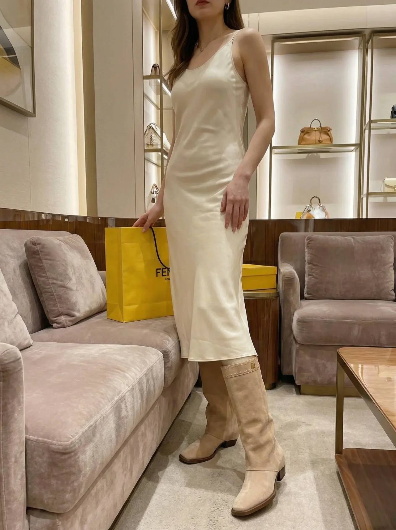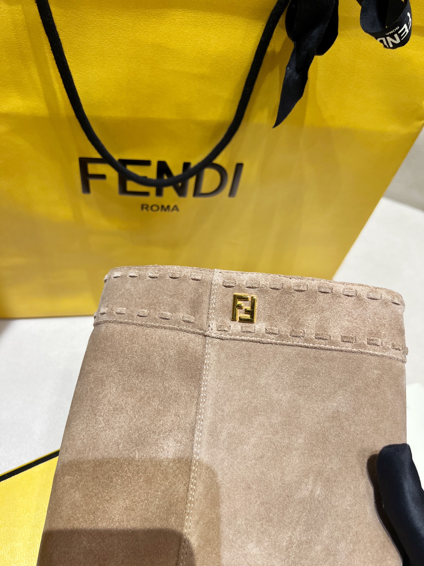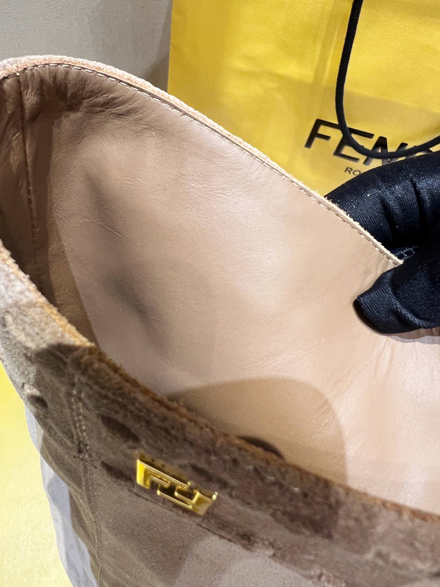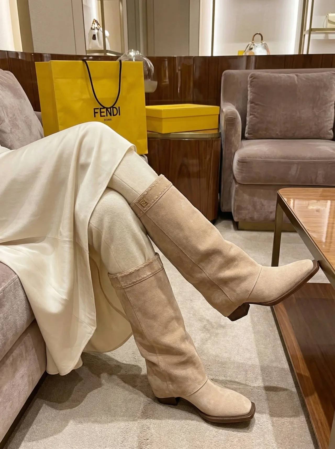 Элегантные женские сапоги FENDI Minerva из мягкой бежевой замши с прямым голенищем средней высоты, аккуратным декоративным кантованием у верхней кромки и квадратным носком. Идеальный выбор для осенне‑зимних образов в городском и вечернем стиле — комфортные, стильные и легко комбинируются с платьями, юбками и джинсами.