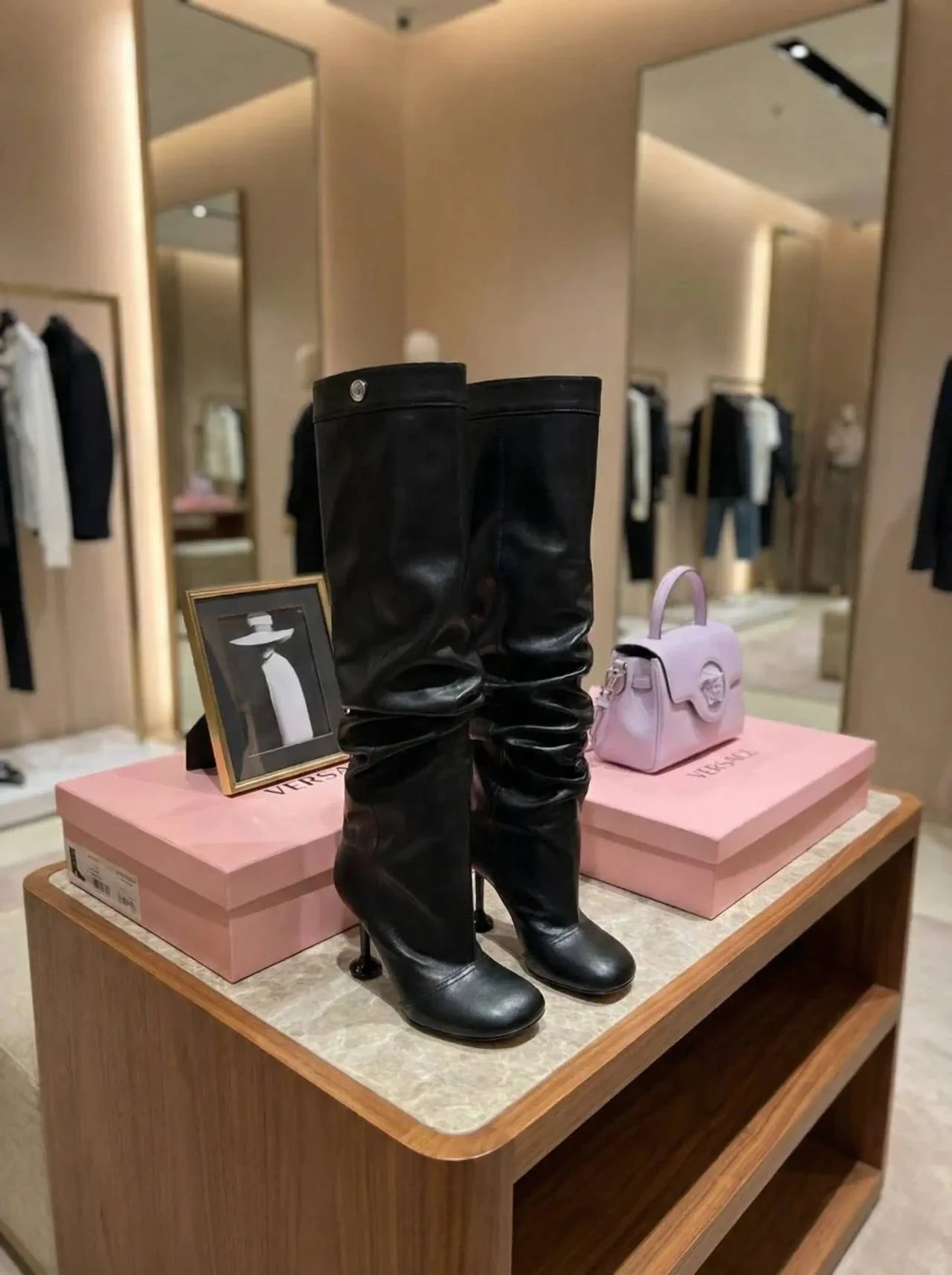 • Фасон: высокая голень (до середины/выше голенища), слегка собранный/слегка «сошитый» эффект в области голени для мягкой, естественной складки.