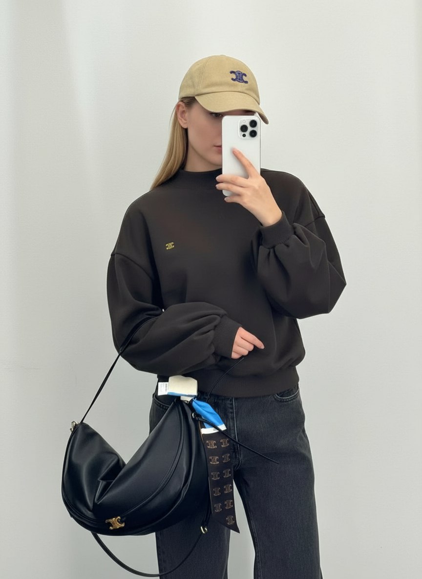 Модель в классическом чёрном цвете из гладкой кожи с аккуратной прошивкой по кромкам и полукруглым клапаном. Центральный акцент — фирменная металлическая эмблема Triomphe золотистого тона, которая придаёт изделию характерный люксовый штрих. Сумка закрывается клапаном, имеет тонкий регулируемый ремень через плечо/напре́кид, позволяющий носить её как на плече, так и кроссбоди. Конструктивно модель выглядит компактной, но достаточно просторной для ежедневных мелочей: кошелька, телефона, ключей и косметики.