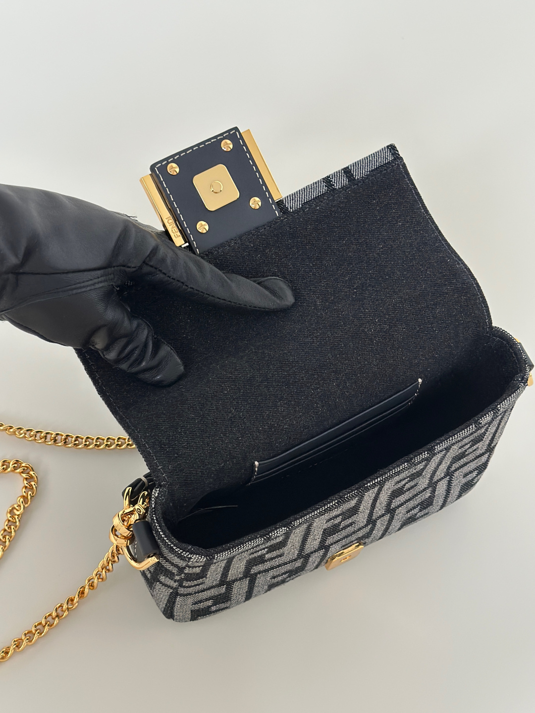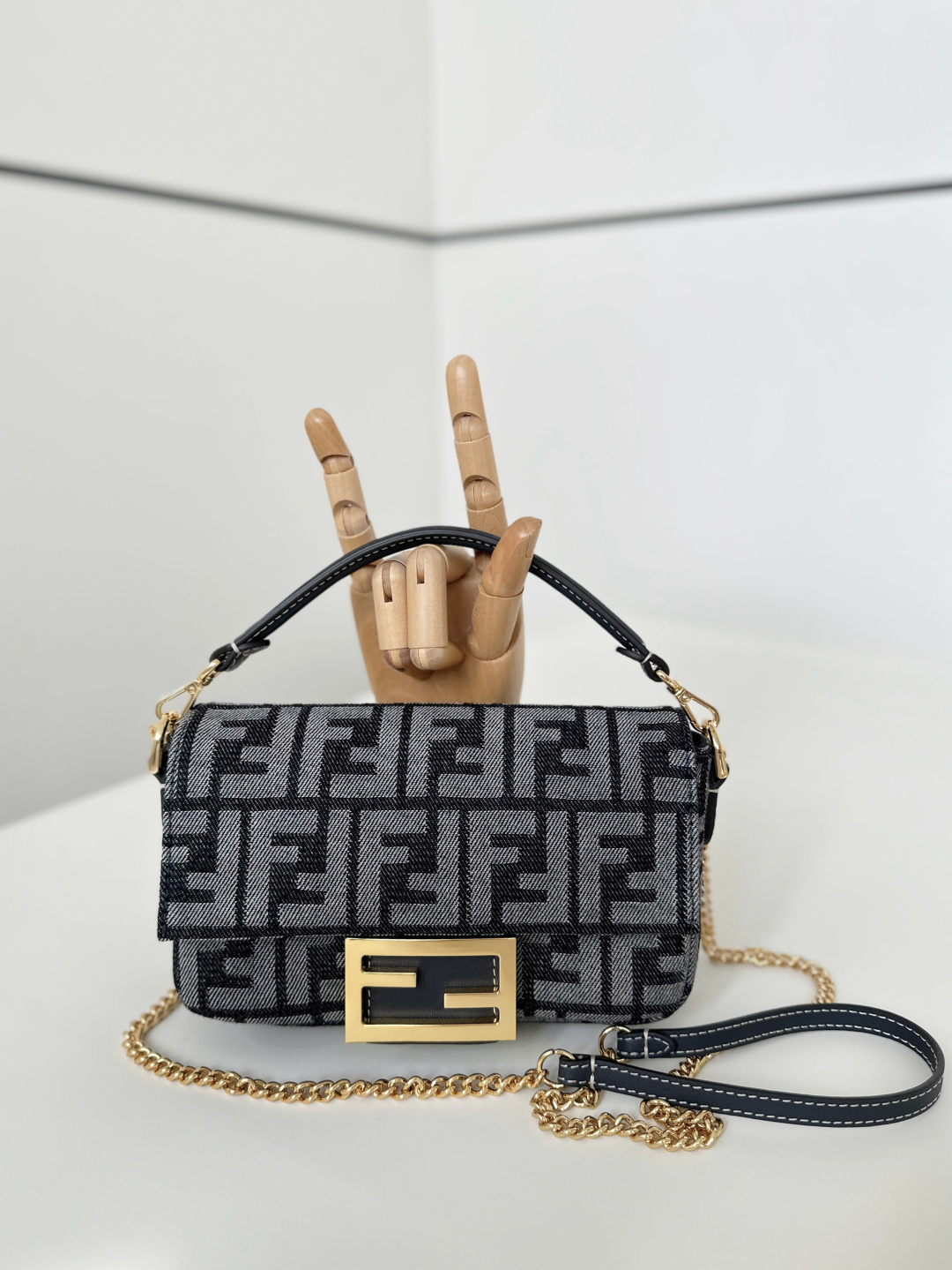 Представляем обновлённую модель Baguette от FENDI — классический прямоугольный силуэт с узнаваемым тканым логотипом «двойная F». Аккуратная клапанная конструкция и фирменная металлическая пряжка добавляют образу класса и лаконичности. Модель сочетает винтажную французскую эстетику и современную функциональность: лёгкая тканевая основа с кожаной отделкой, аккуратная строчка и тщательная проработка деталей.