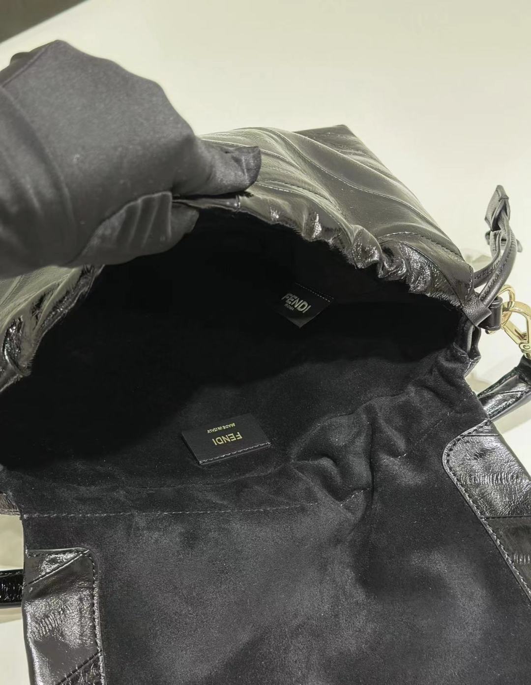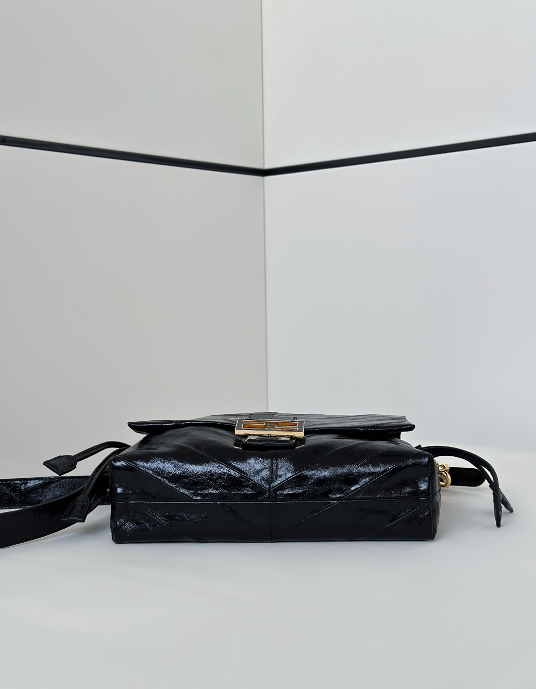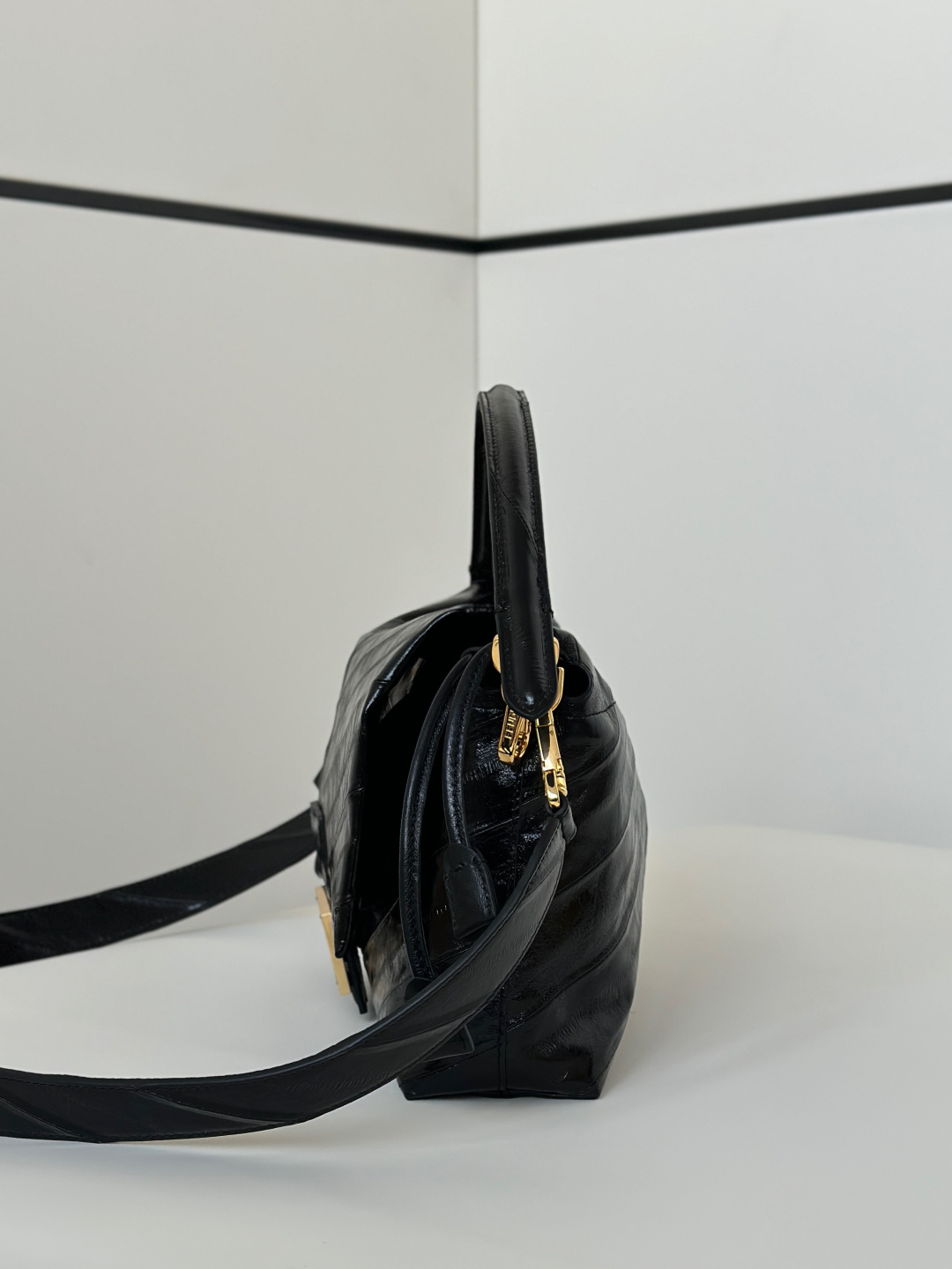 • Внешний вид: глубокий черный глянцевый лак с диагональной стёжкой/панелями, создающей структурный узор.