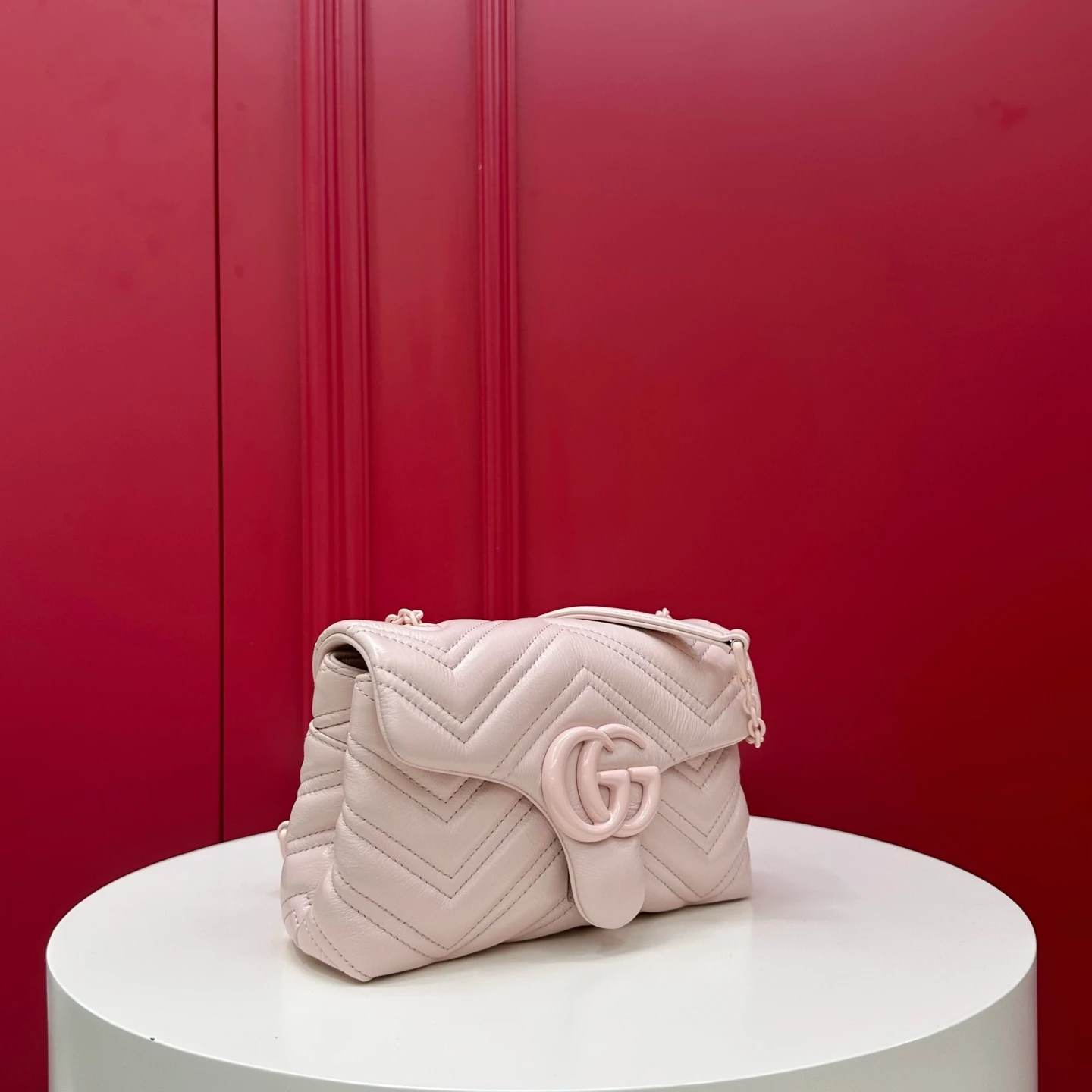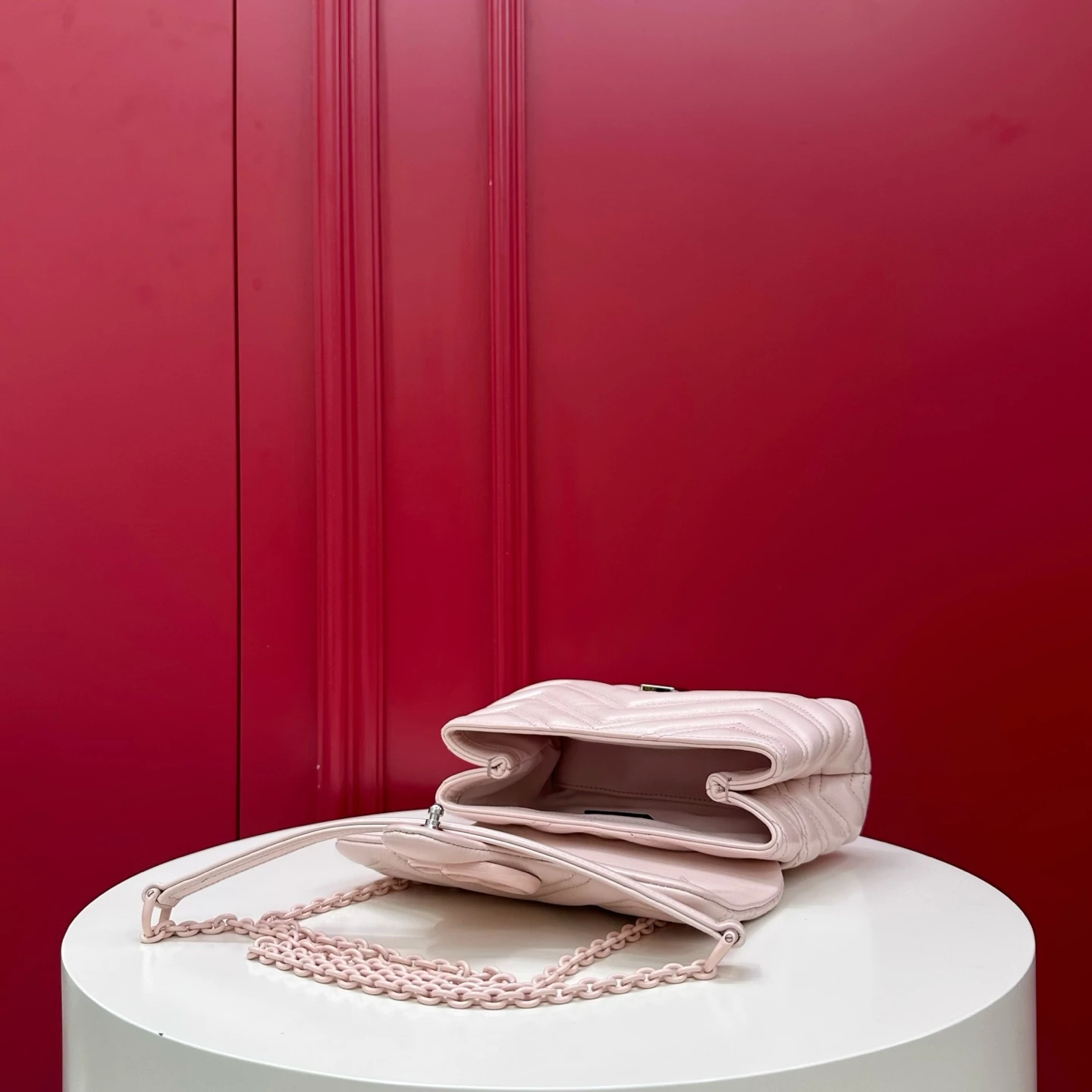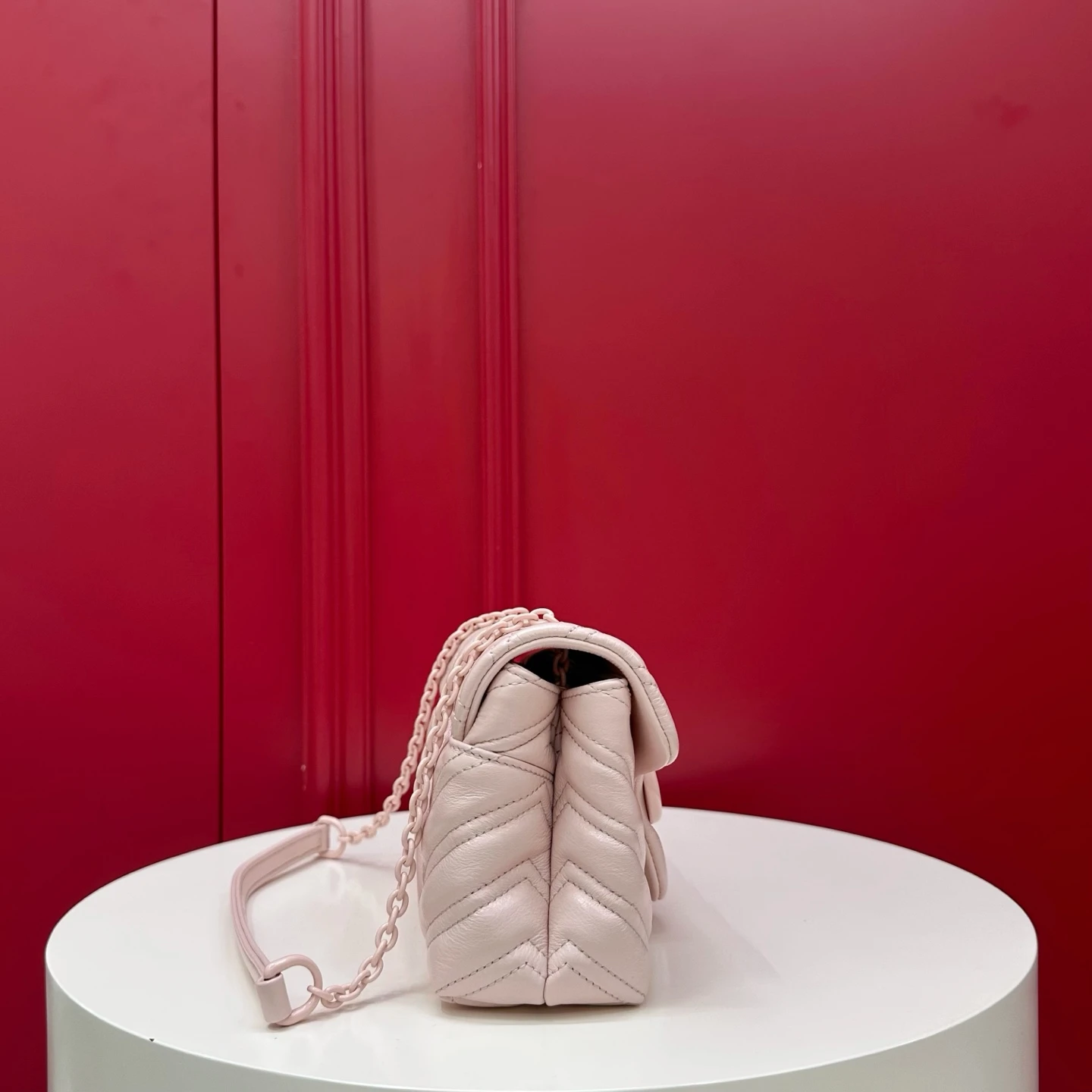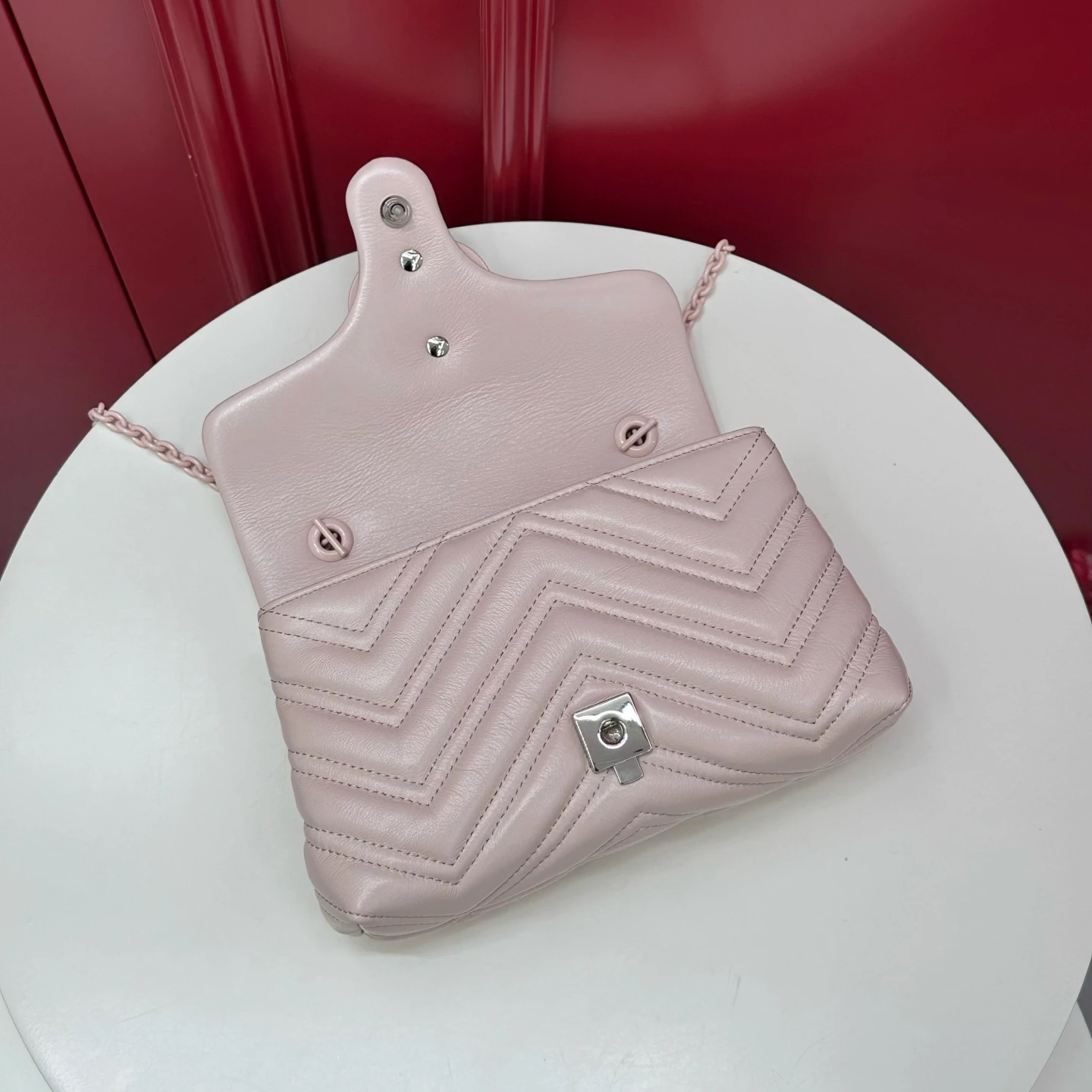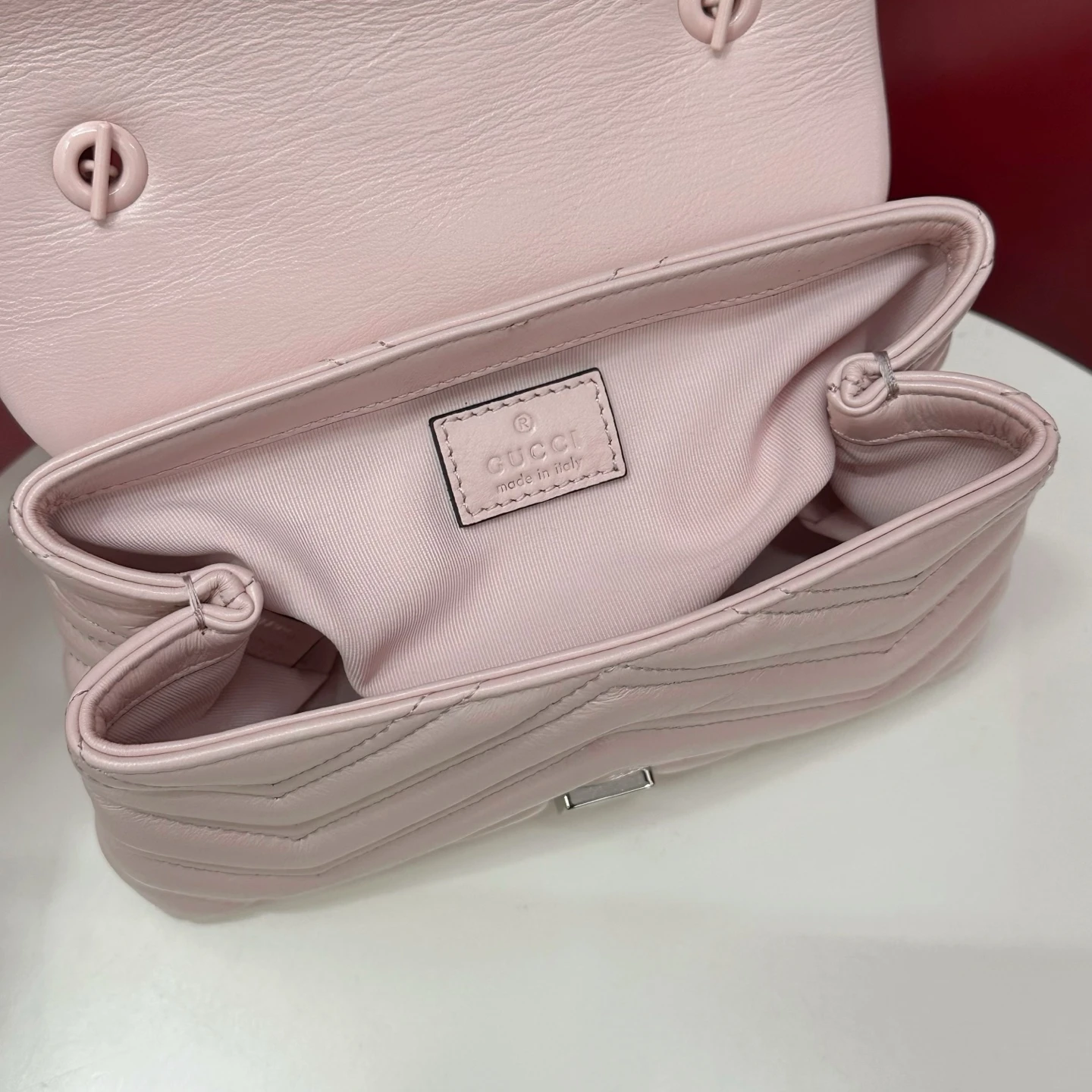 Изысканная GG Marmont Mini Shoulder Bag выполнена из мягкой кожи с фирменным шевронным узором, который придаёт модели узнаваемый и элегантный характер. Нежный розовый оттенок подчёркивает женственность и утончённый стиль аксессуара.