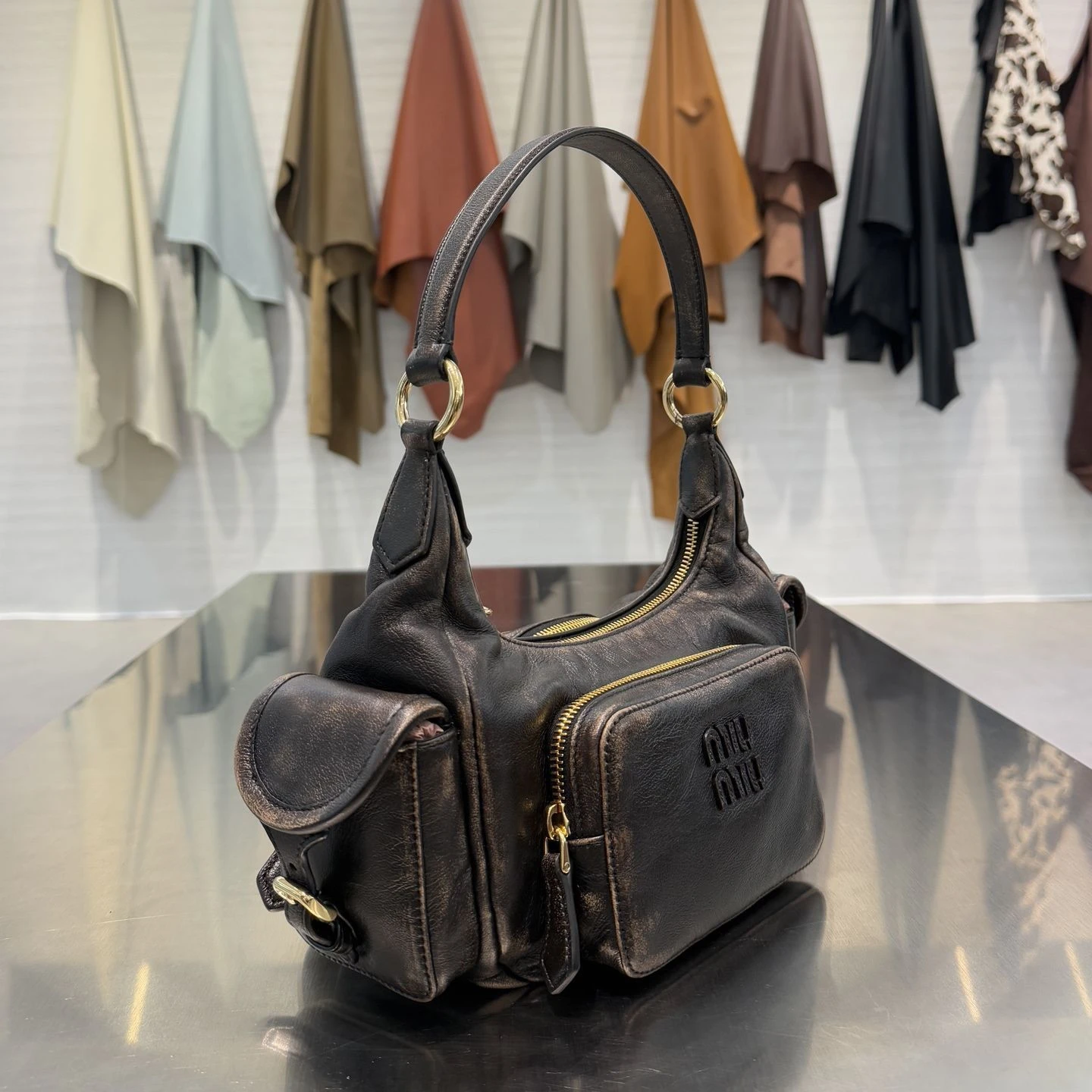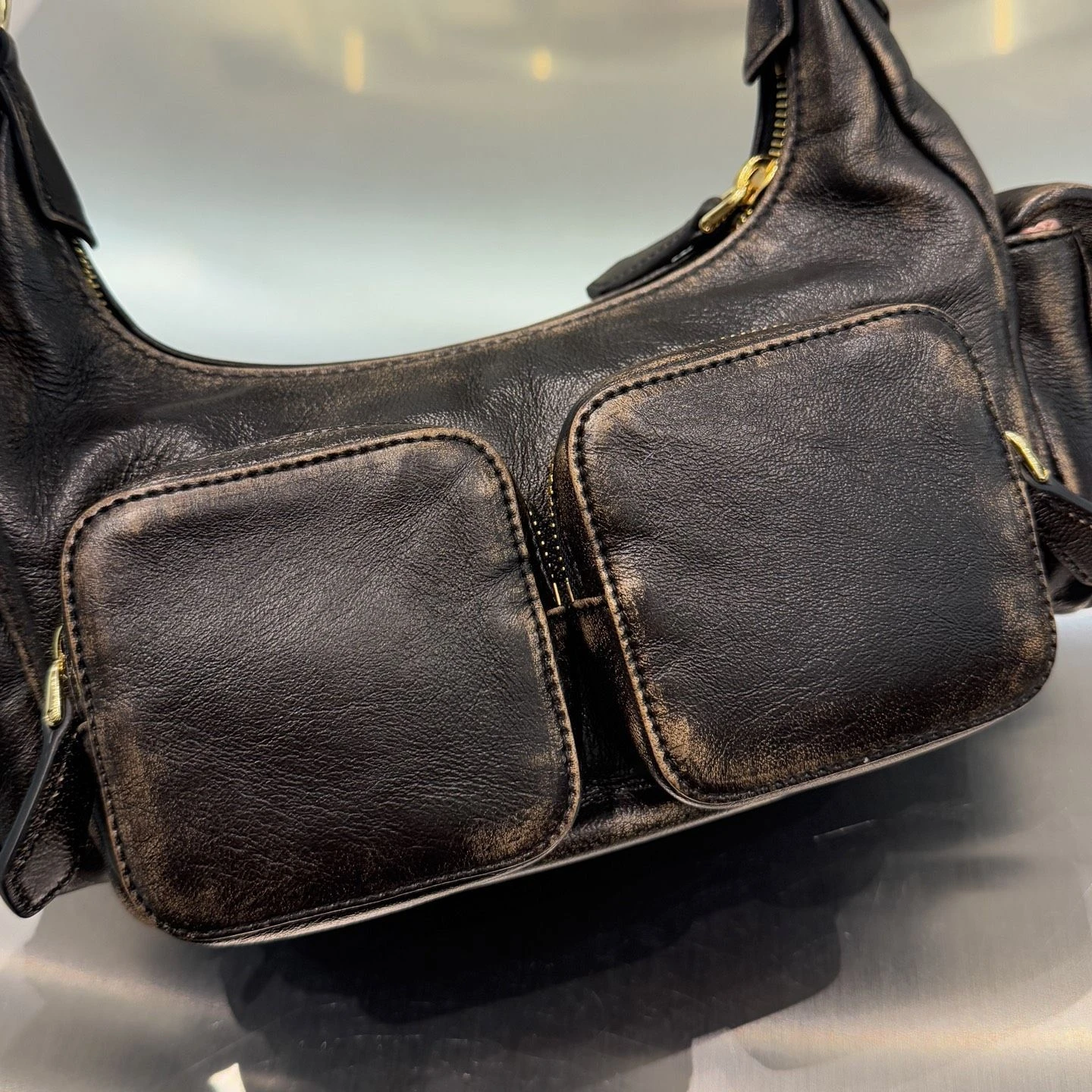 Сумка Pocket из кожи от Miu Miu — стильная модель с выразительным утилитарным дизайном, сочетающая практичность и фирменную женственность бренда. Она выполнена из мягкой натуральной кожи с лёгким винтажным эффектом, который придаёт аксессуару характерный роскошный и современный вид.