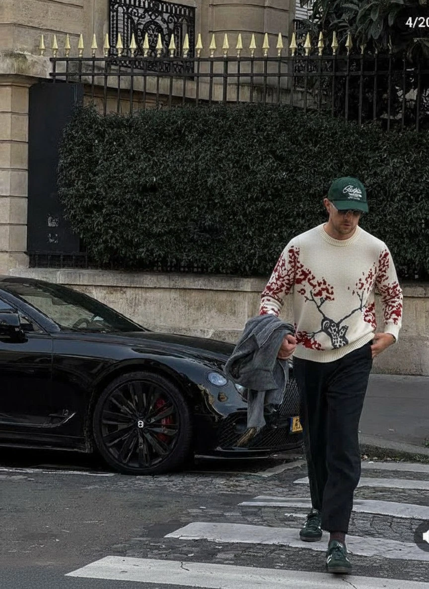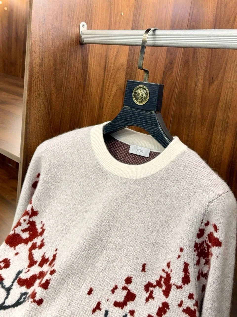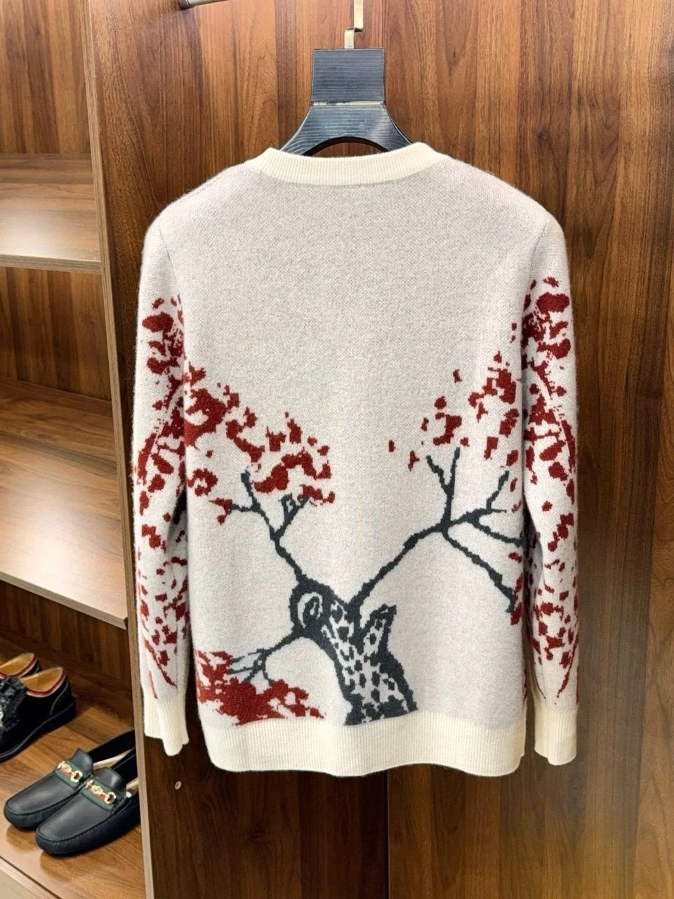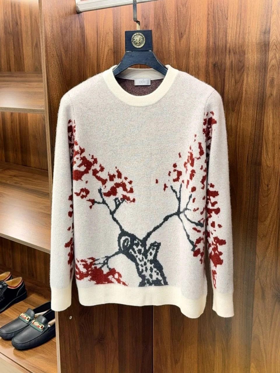 Изысканный кашемировый джемпер CHRISTIAN DIOR в мягкой кремовой гамме с художественным жаккардовым узором «ветвь с листьями» в глубоких красных и графитовых тонах. Минималистичный круглый вырез и аккуратная ребристая отделка делают модель универсальной и легко сочетаемой с повседневными и более нарядными образами.