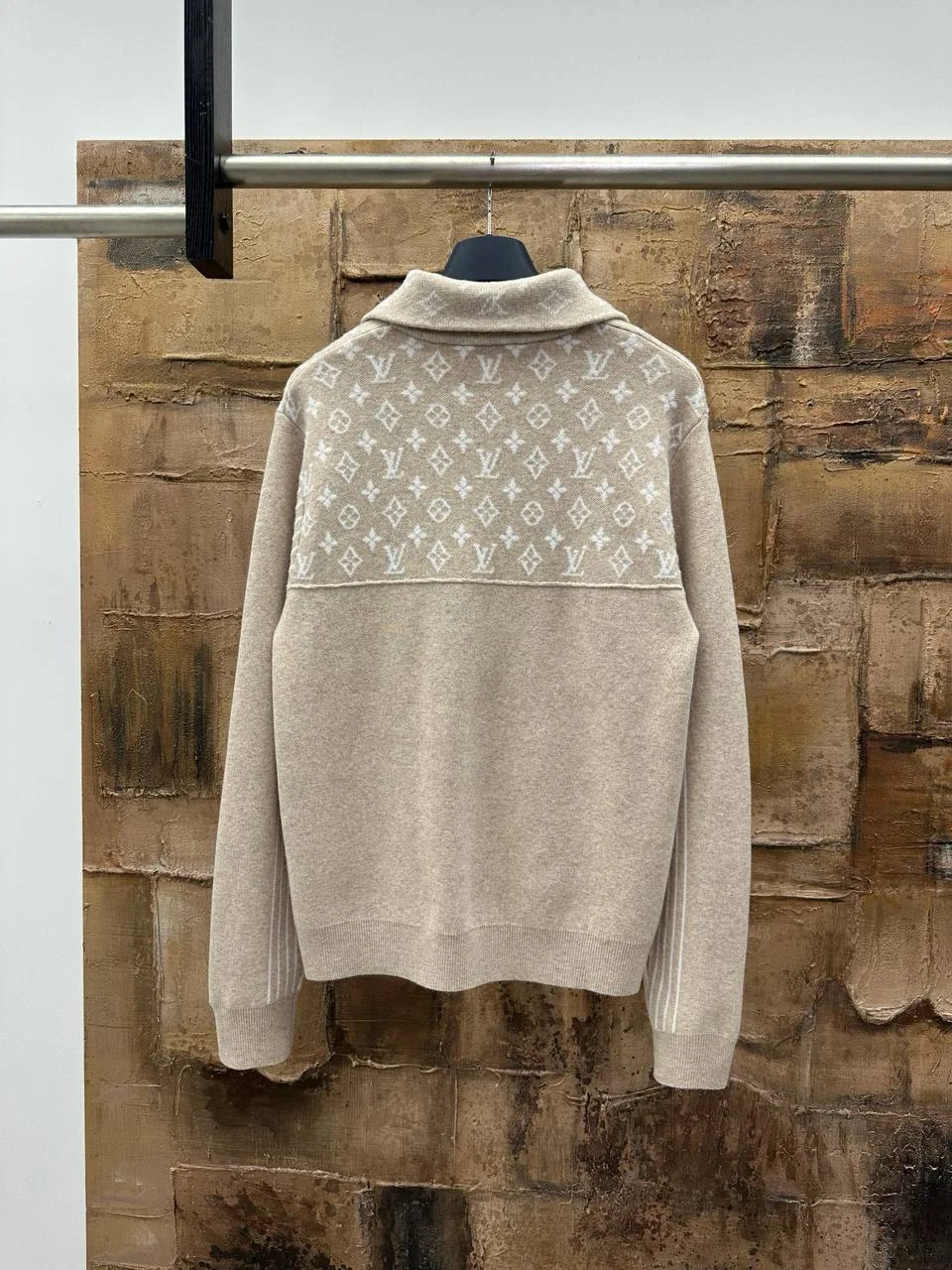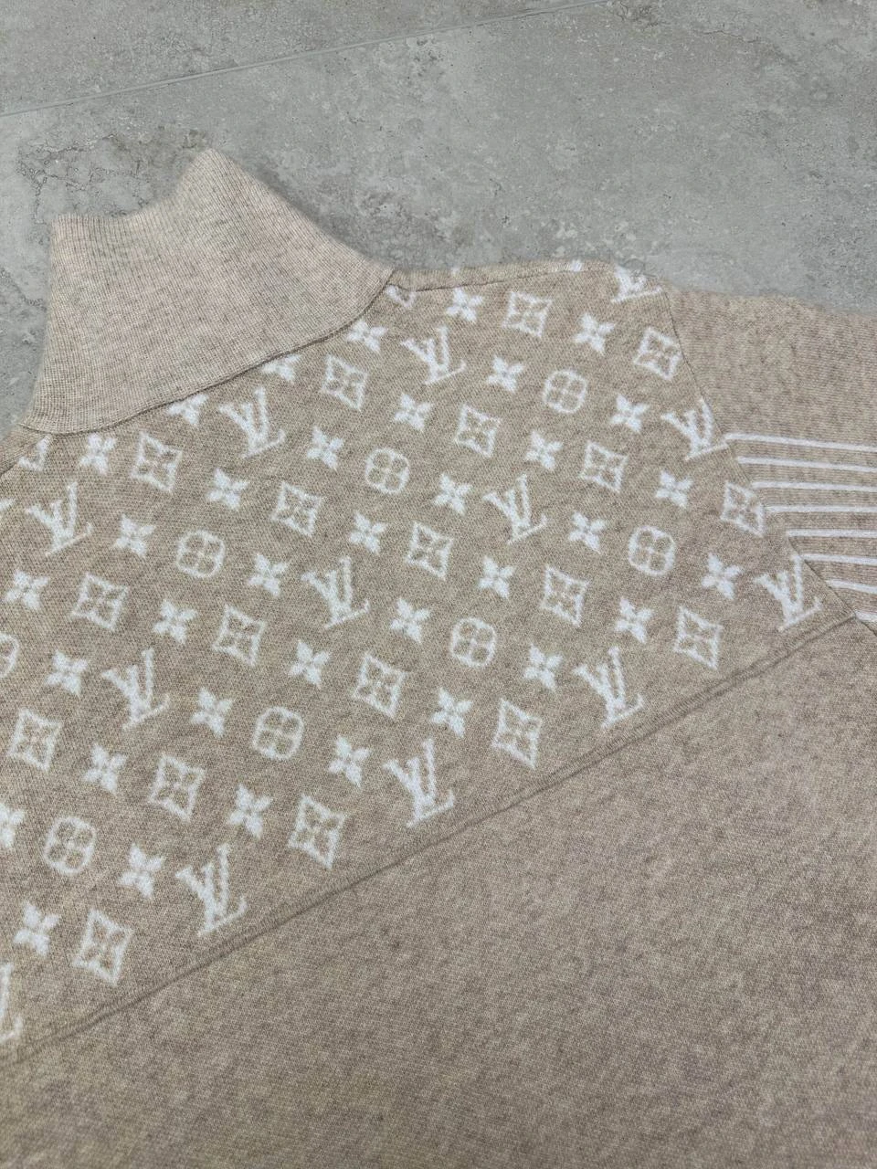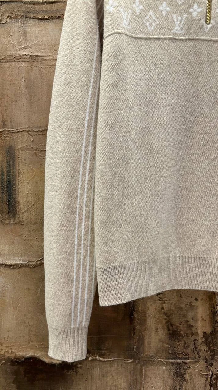 Элегантный мужской пуловер LOUIS VUITTON в светло‑бежевой гамме с узнаваемым жаккардовым узором Monogram в верхней части. Модель на короткой металлической молнии, сочетает в себе классическую сдержанность и современный спортивный характер, легко вписывается в городской гардероб.