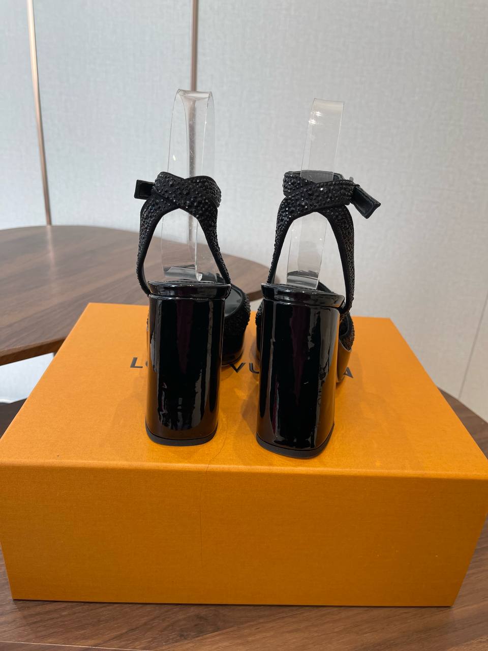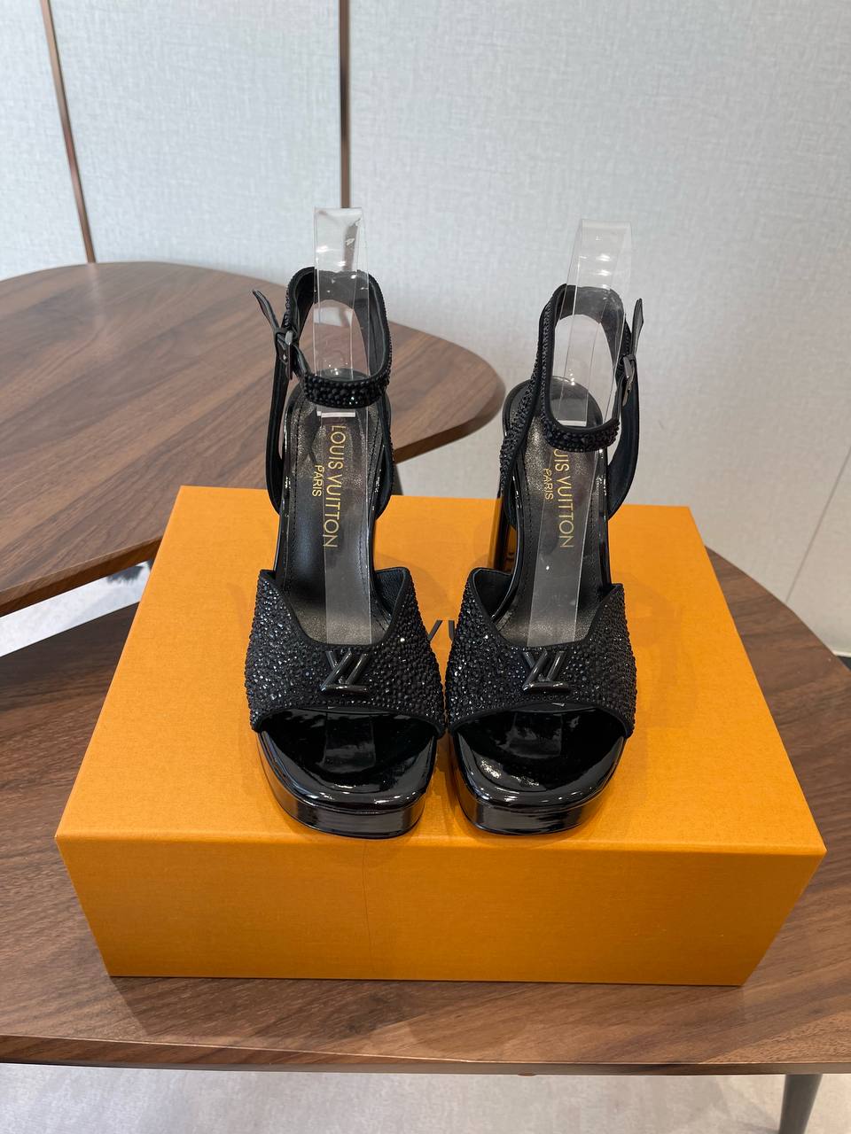 • Декор: объёмный LV‑логотип на передней части; мелкие кристаллы, равномерно покрывающие полосу над носком.
