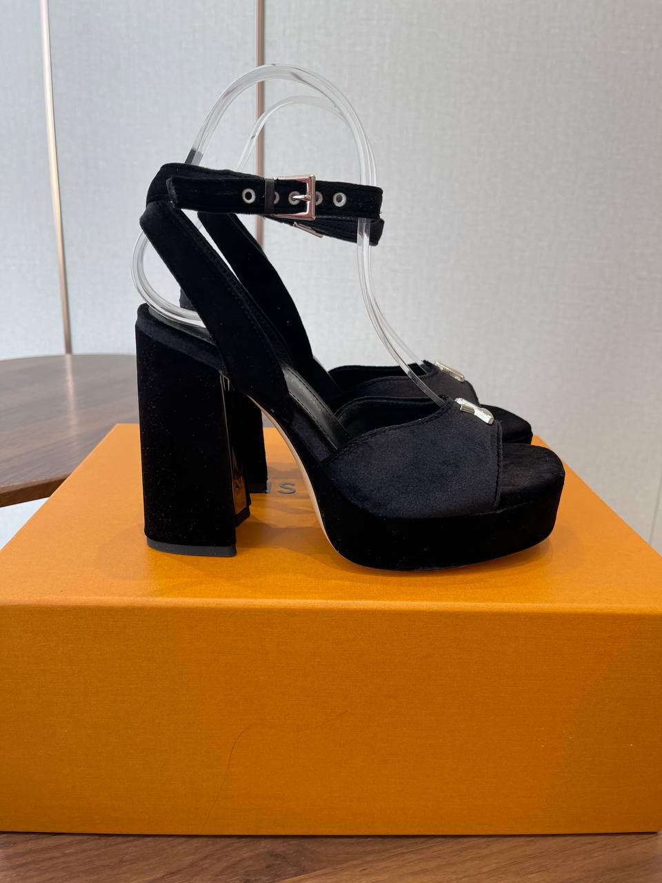 Элегантные вечерние босоножки LOUIS VUITTON в глубоком черном цвете — идеальное сочетание гламура и современной архитектуры каблука. Модель выполнена на высокой платформе с устойчивым подпятником, имеет открытый носок и изящную застёжку‑ремешок на щиколотке. Переднюю часть украшает фирменный LV‑логотип и тонкая россыпь чёрных кристаллов, создающих благородный блеск при любом освещении.