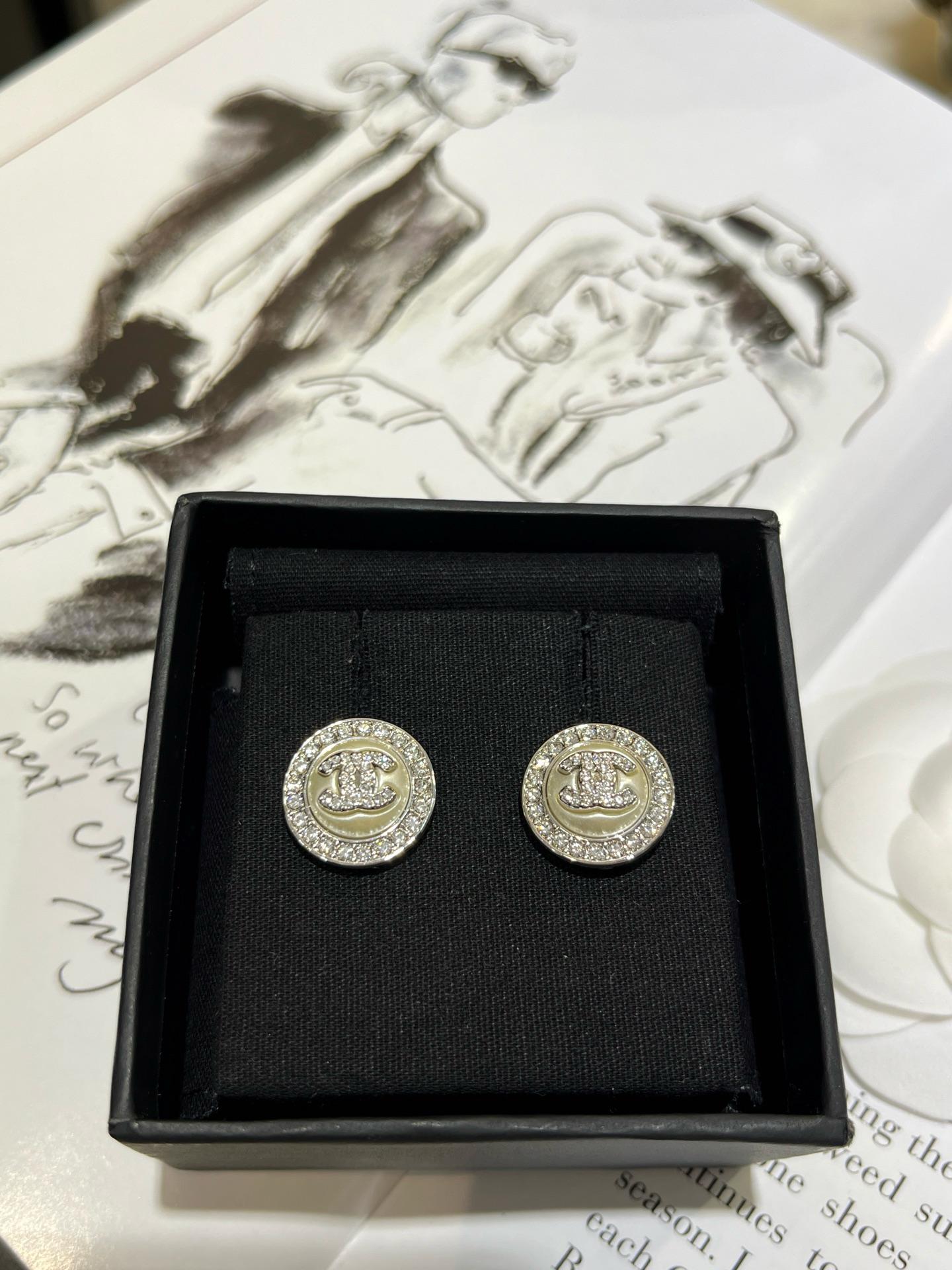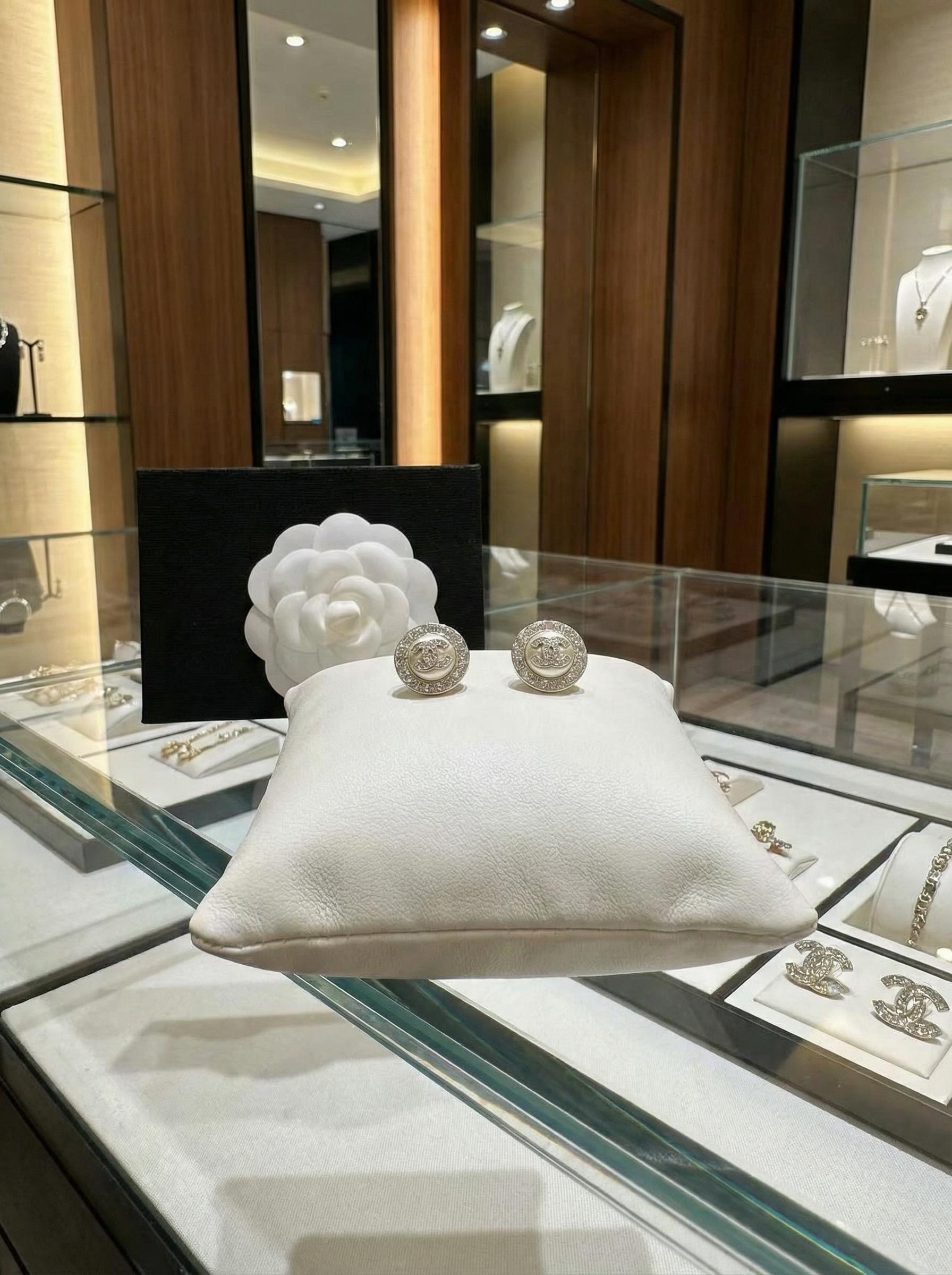 Классические серьги-пуссеты CHANEL объединяют лаконичный силуэт и ювелирную утонченность. Центральный элемент — фирменный логотип CC, покрытый бликующими кристаллами Swarovski, расположенный на нежном светлом фоне. Внешний круг украшен тонким рядом кристаллов, создающим эффект сияния и усиливающим игру света при движении. Корпус серег выполнен из латуни с благородным светлым покрытием, что придаёт аксессуару изысканный металлический блеск и долговечность. Этот дизайн гармонично дополняет как вечерние наряды, так и сдержанные деловые ансамбли, становясь универсальным и запоминающимся аксессуаром.
