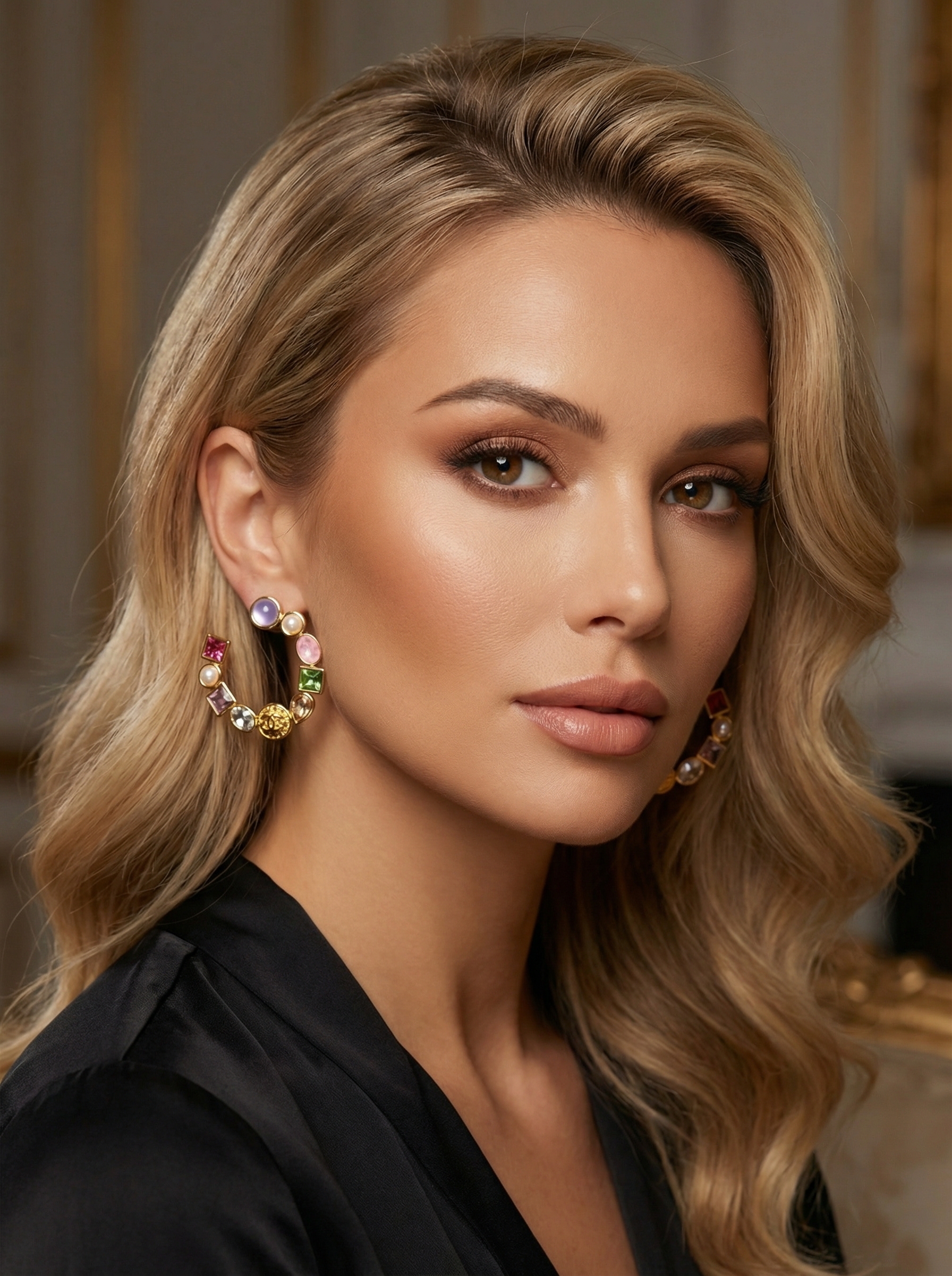 Лаконичная форма колец гармонично сочетается с богатым декором, делая серьги стильным акцентом как для вечерних, так и для повседневных образов.