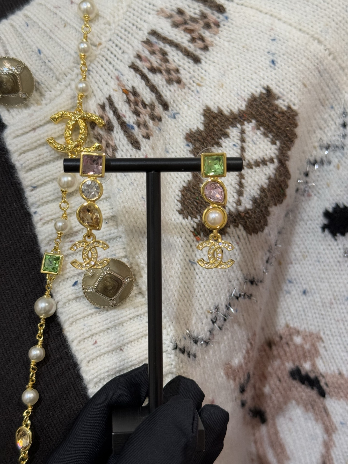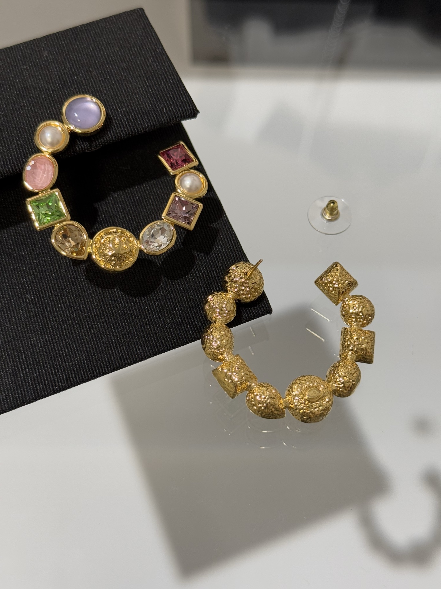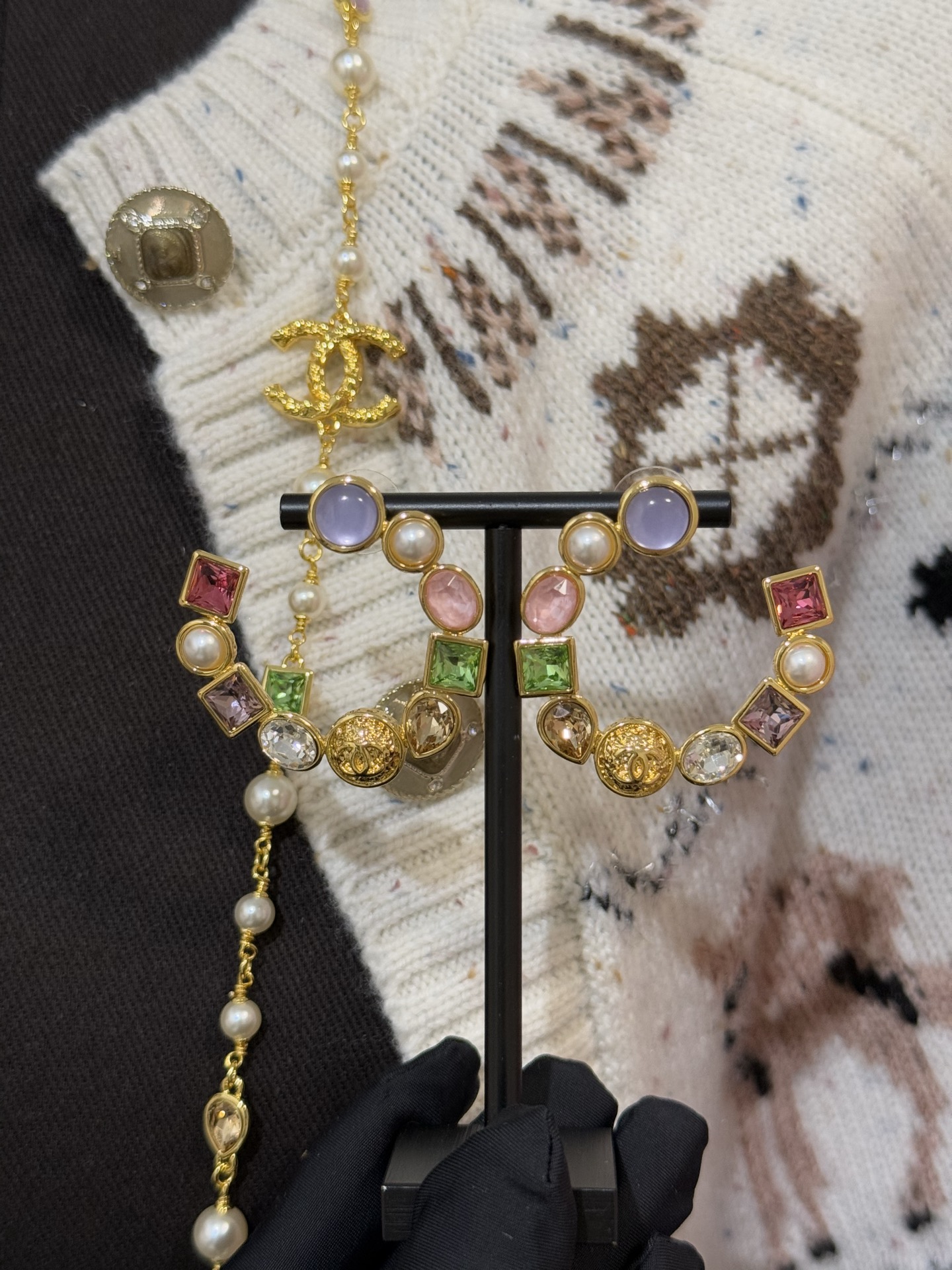 Серьги-кольца CHANEL из коллекции Cruise 2025/26 — эффектное украшение, выполненное из золотистого металла и декорированное стеклянными бусинами и сверкающими кристаллами. Разноцветные элементы создают мягкое переливающееся сияние и придают модели выразительный, праздничный характер.