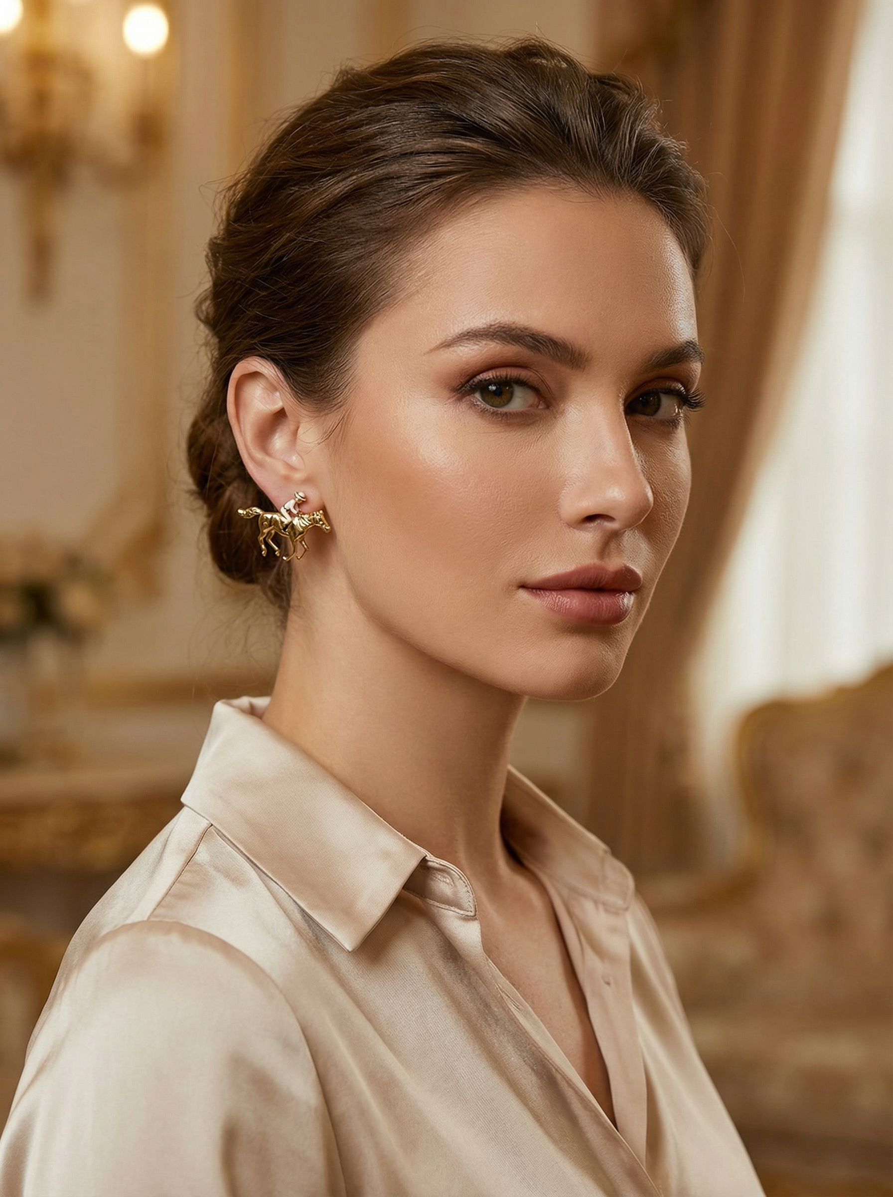 Эти изящные серьги привлекут взгляды благодаря детализированным фигуркам наездников верхом на лошадях. Золотистое покрытие придаёт украшению роскошный вид, а аккуратная проработка деталей делает его утончённым акцентом любого образа — от классического костюма до вечернего платья.