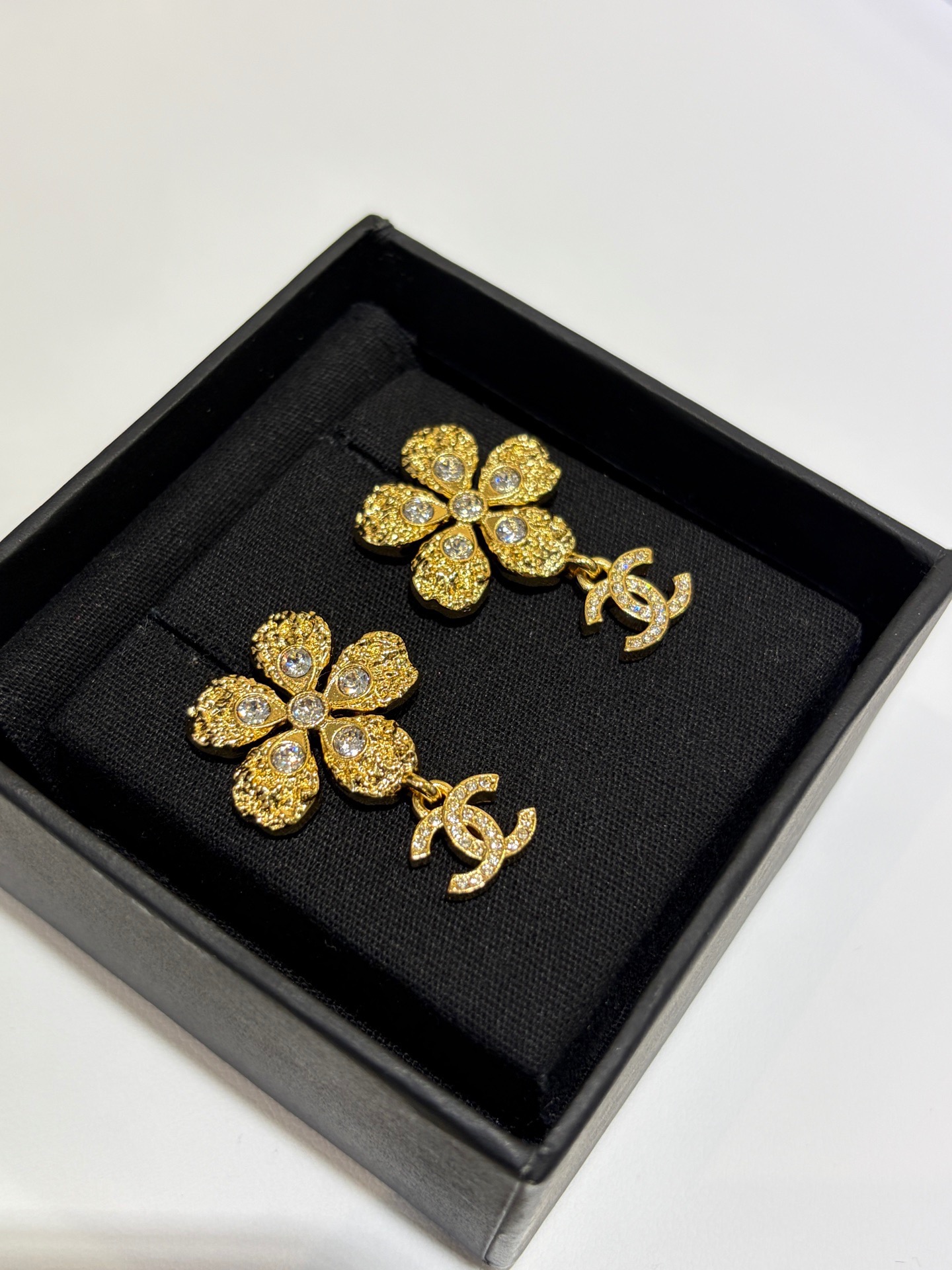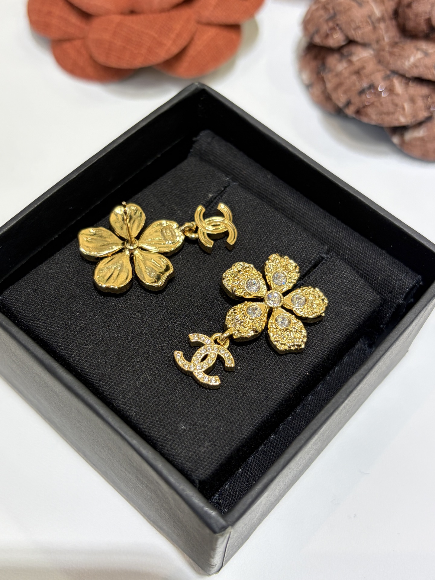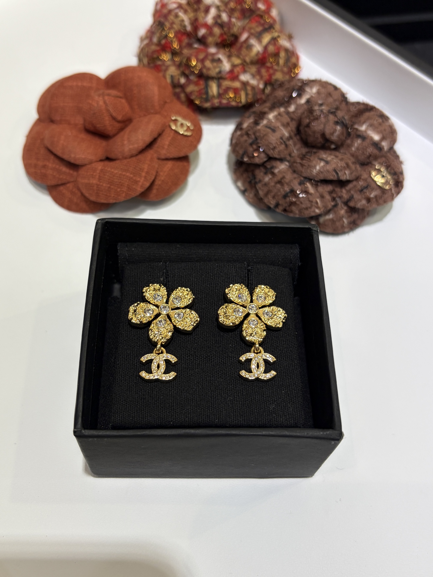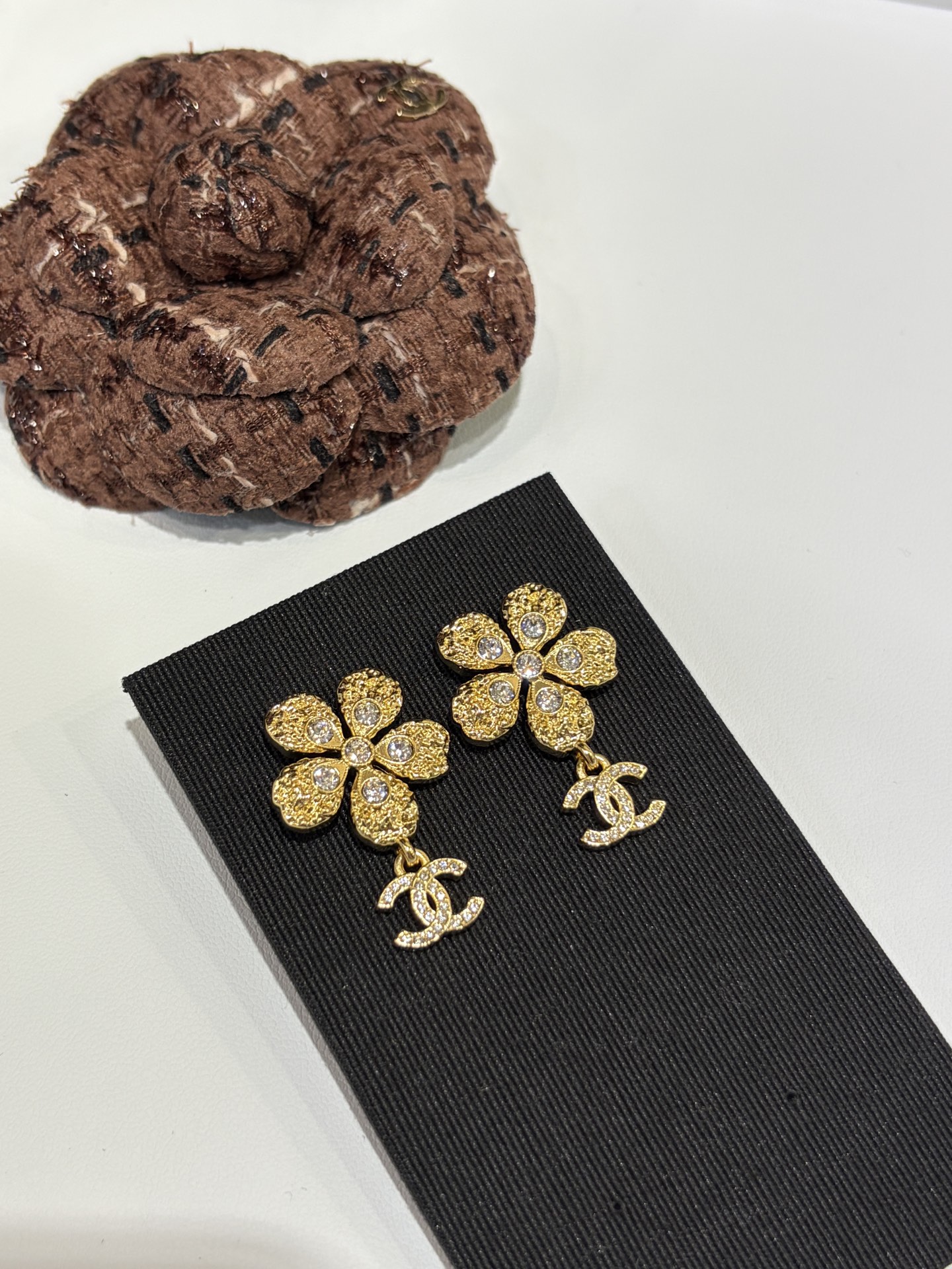 Эти изящные серьги‑пусеты сочетает женственная цветочная форма с культовым мотивом CC. Выполненные в теплых золотистых тонах и украшенные сверкающими кристаллами, они добавляют сияния и изящества любому образу — от делового до вечернего. Компактный размер и классическая застежка‑пусет делают украшение удобным для ежедневной носки, а подарочная коробка придаёт завершённый вид при вручении.