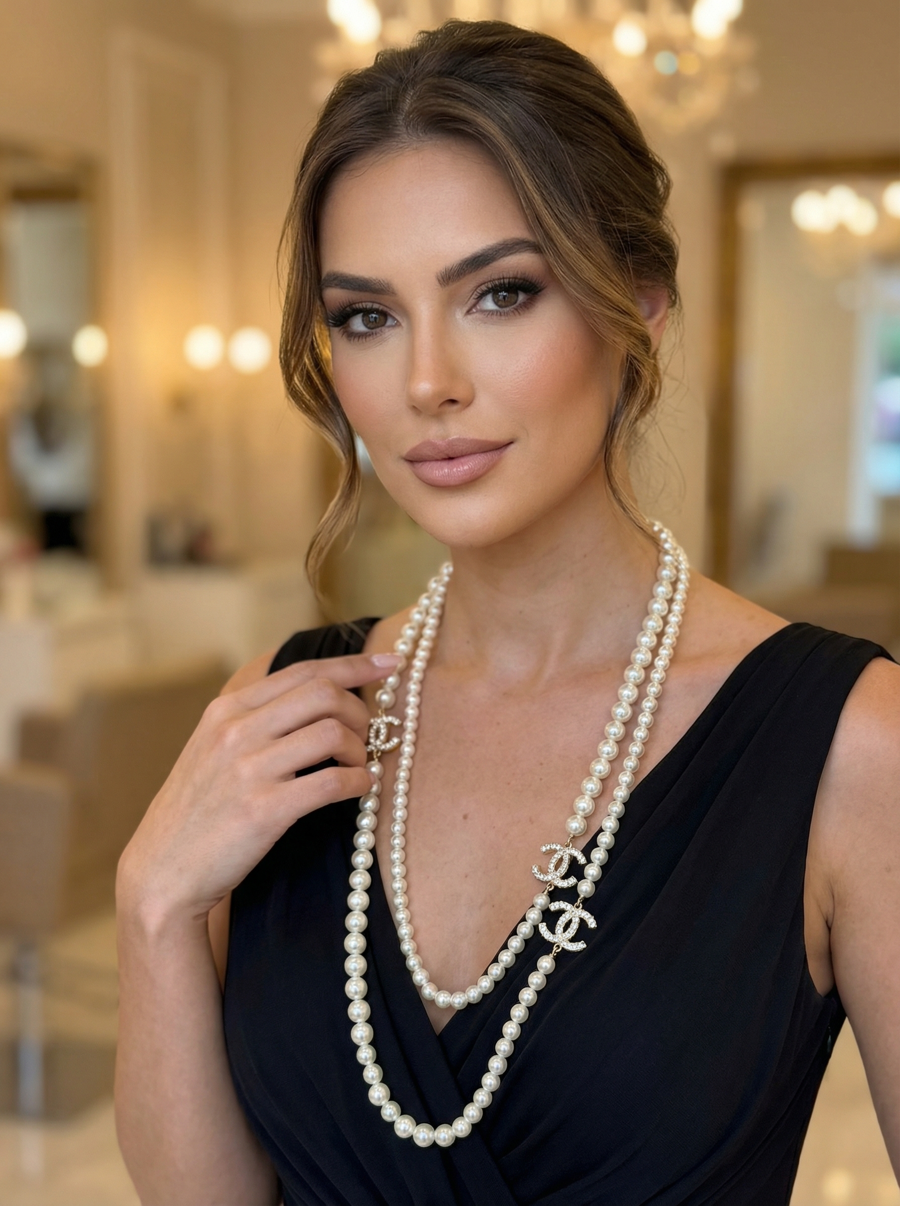 Изысканное колье Chanel в духе классики — двухрядное украшение из жемчужных бусин с декоративными элементами в виде логотипа CC, инкрустированными кристаллами Swarovski. Корпус и фурнитура выполнены из латуни с тёплым золотистым оттенком, украшение снабжено удлинительной цепочкой для регулировки посадки.
