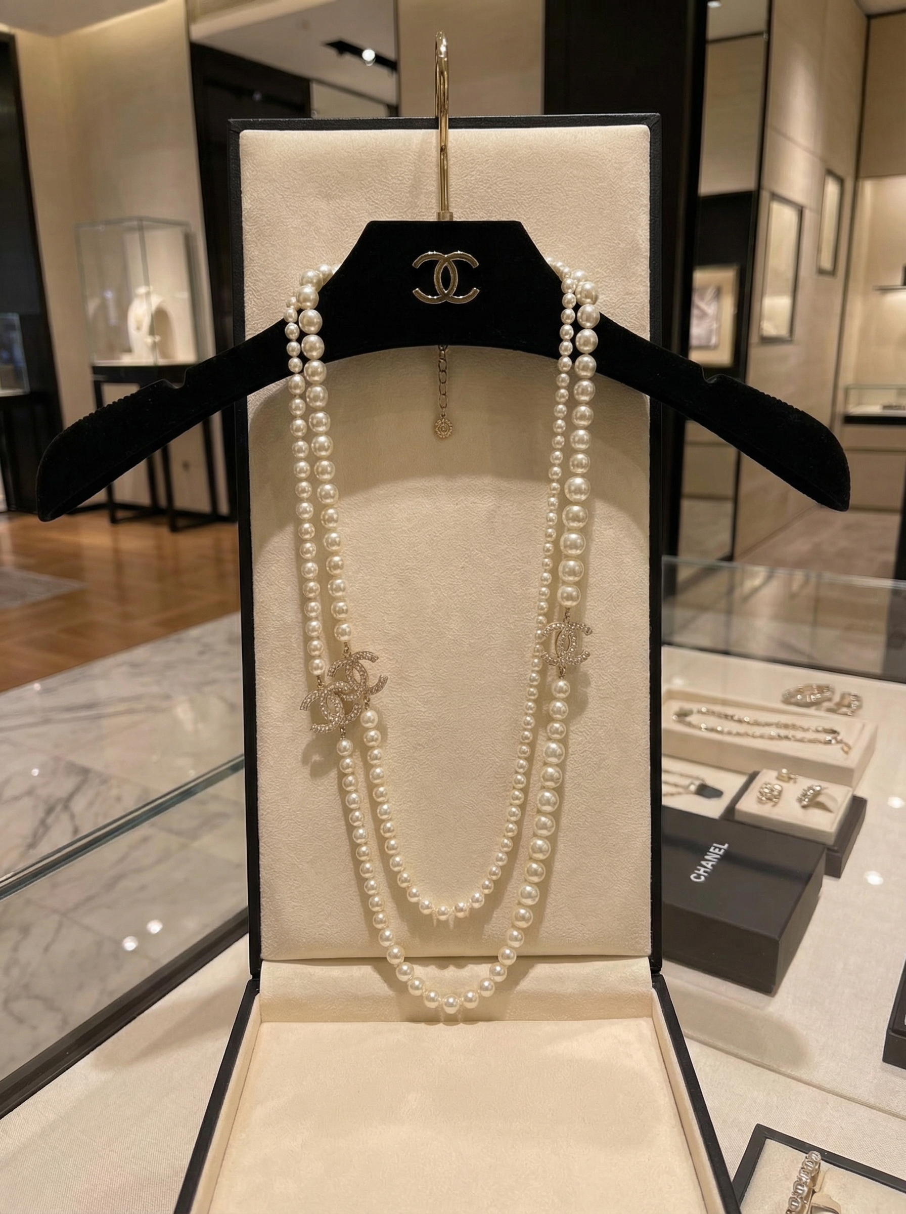 • Конструкция: два яруса бус — более длинный и укороченный — с декоративными подвесками в виде переплетённых букв CC, украшенных прозрачными кристаллами.