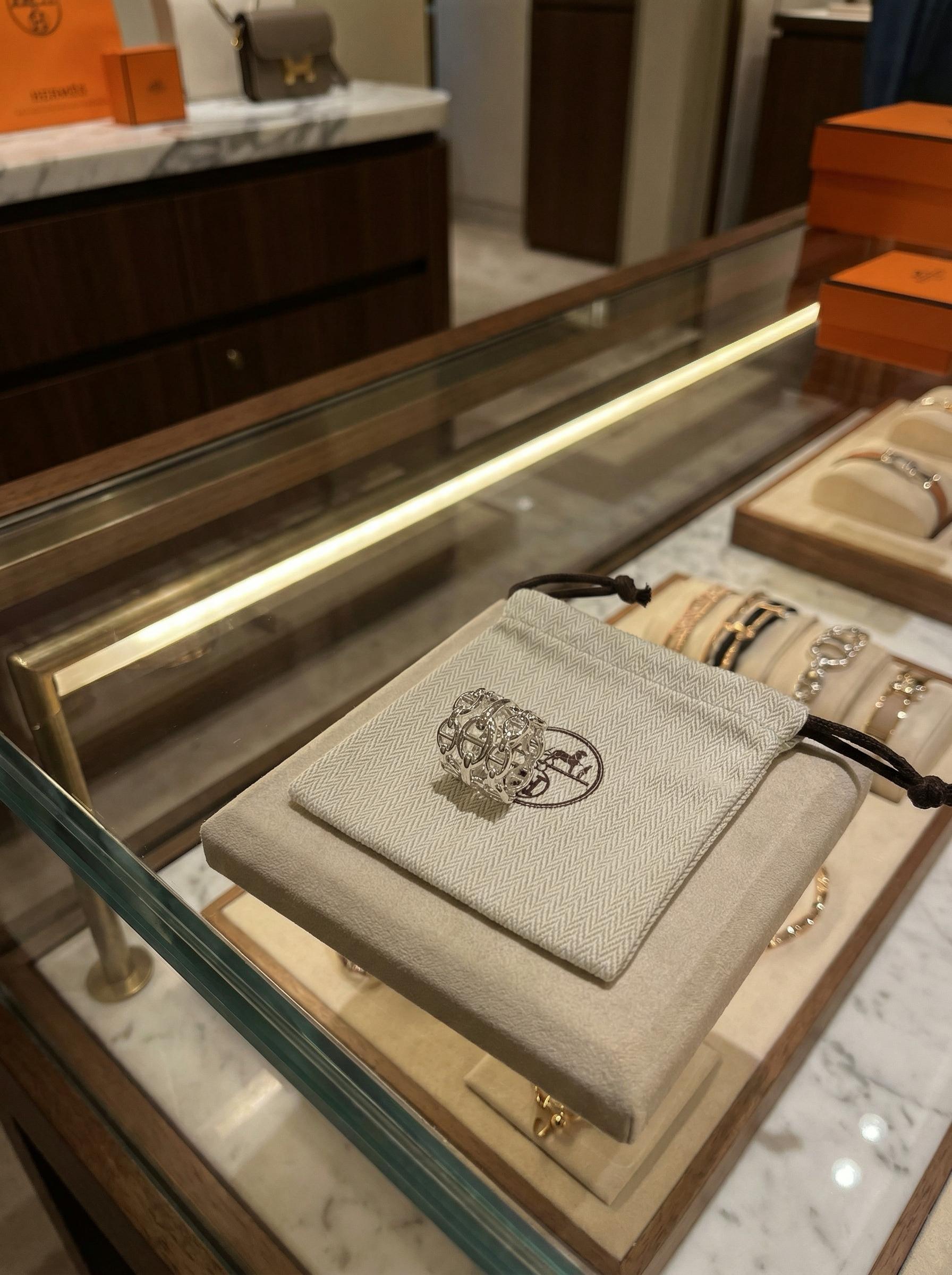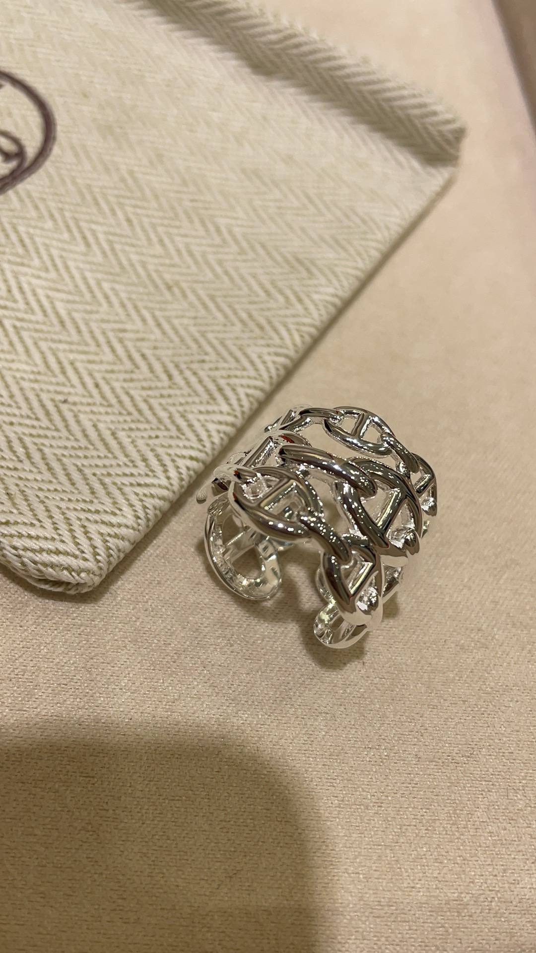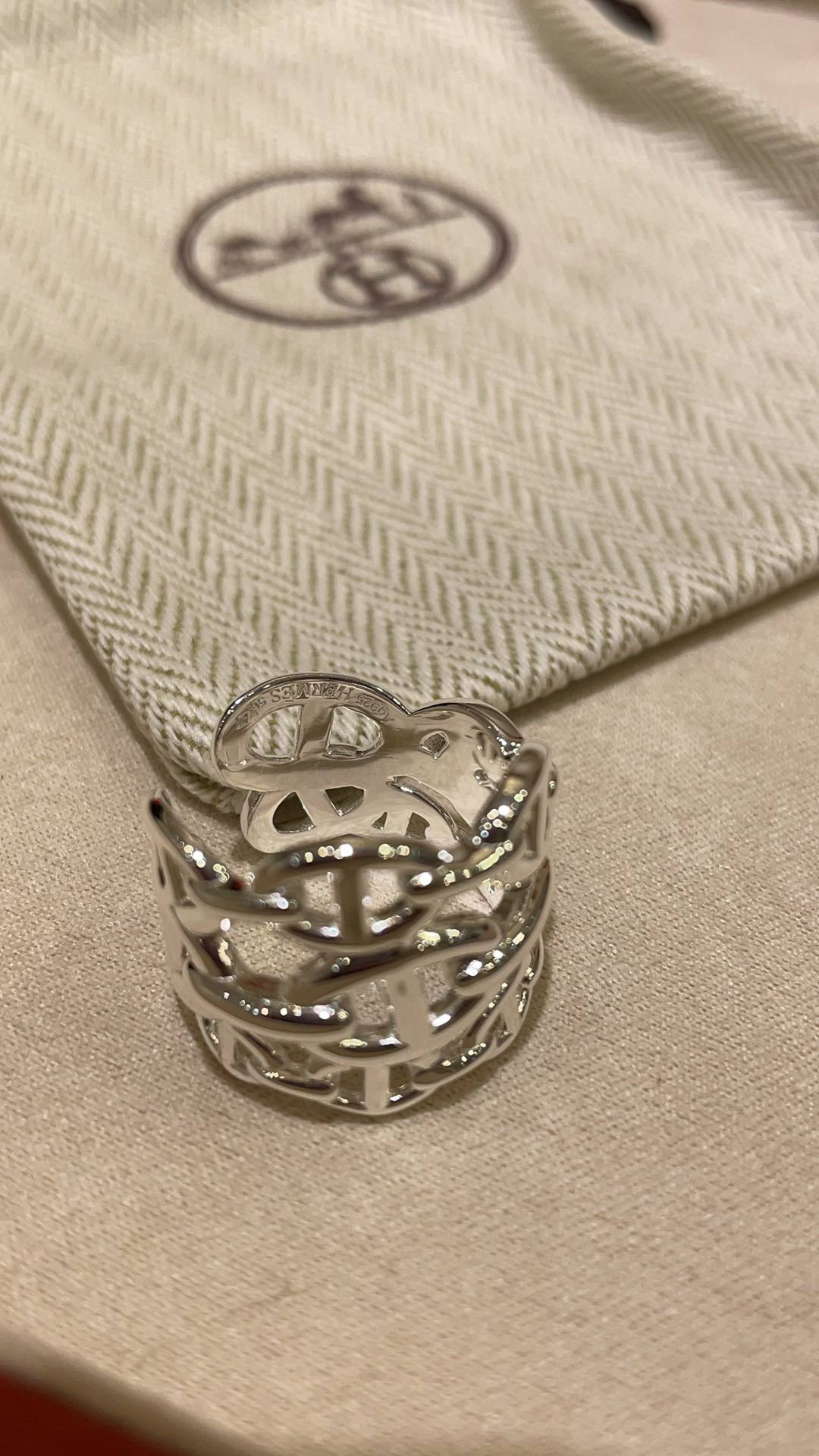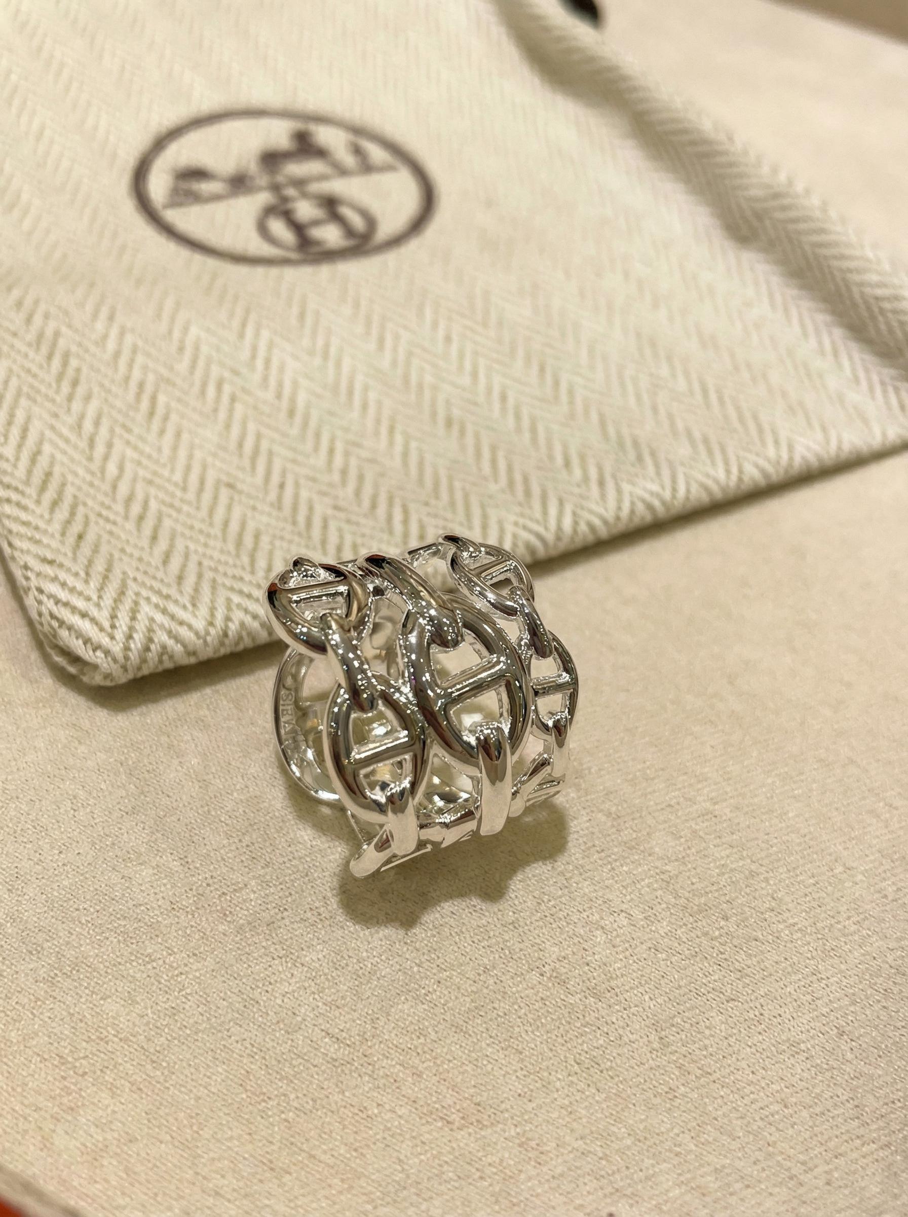 Стильное широкое кольцо Hermès Farandole, размер 56. Броский открытый орнамент из повторяющихся арочных/подковообразных элементов, зеркальная полировка — эффектный акцент как на каждый день, так и для вечернего образа.