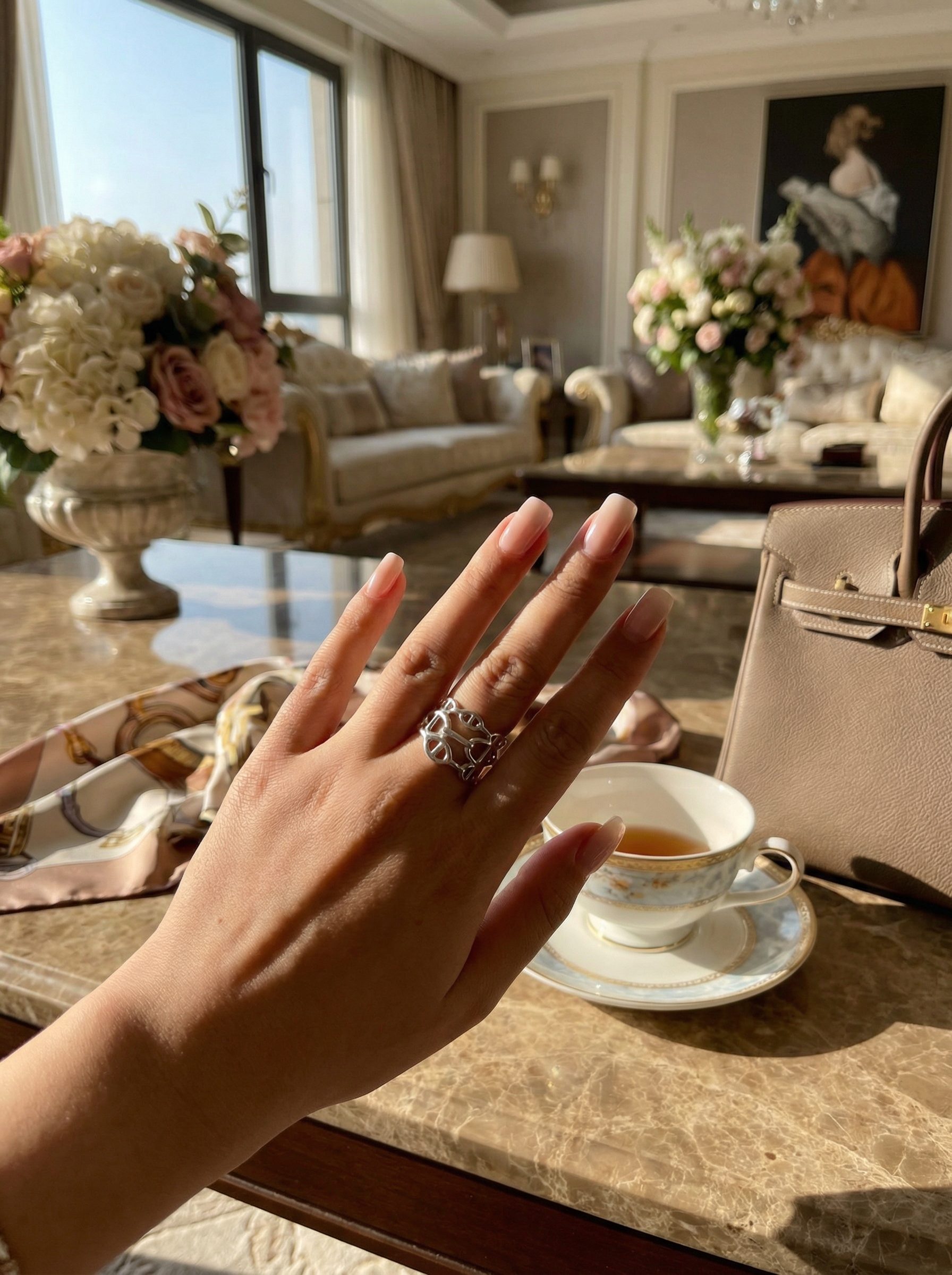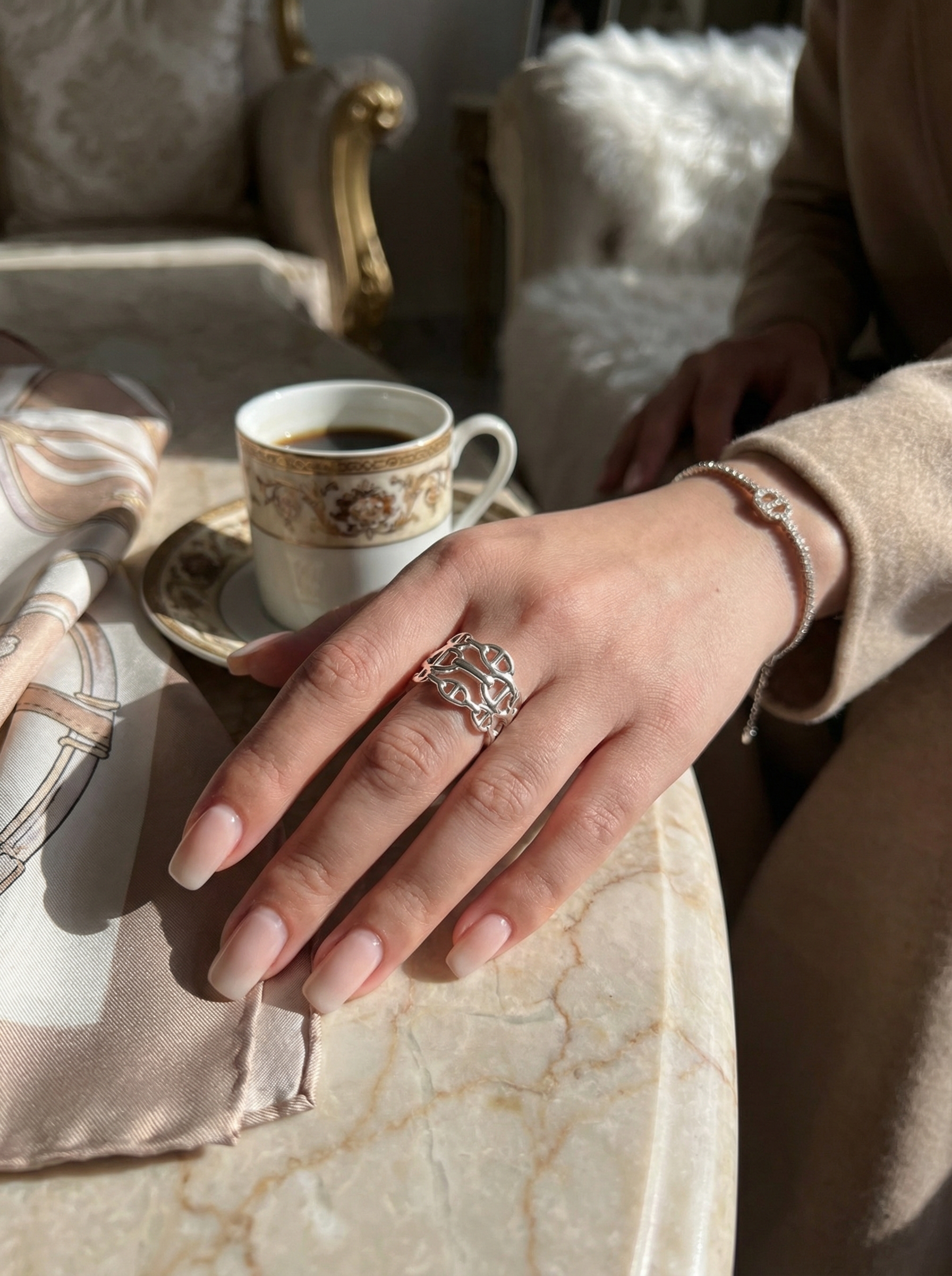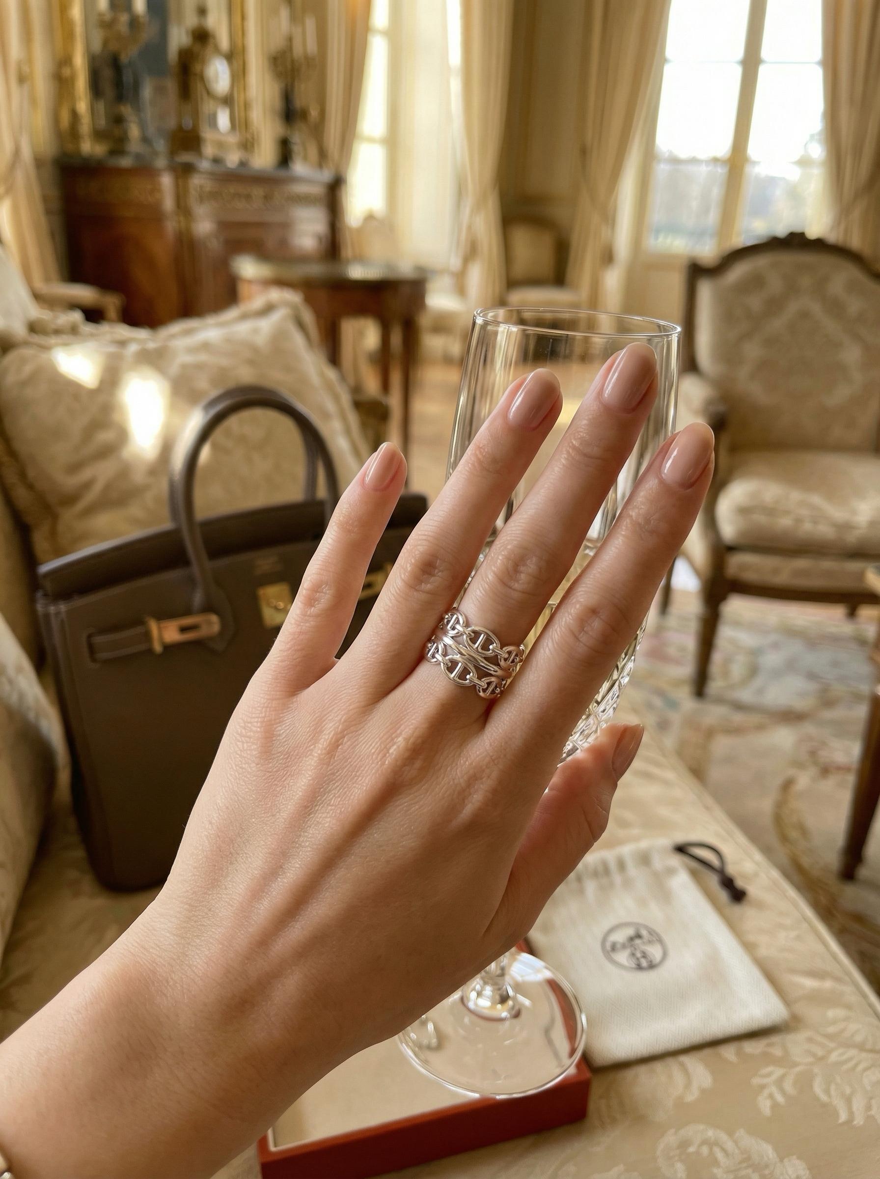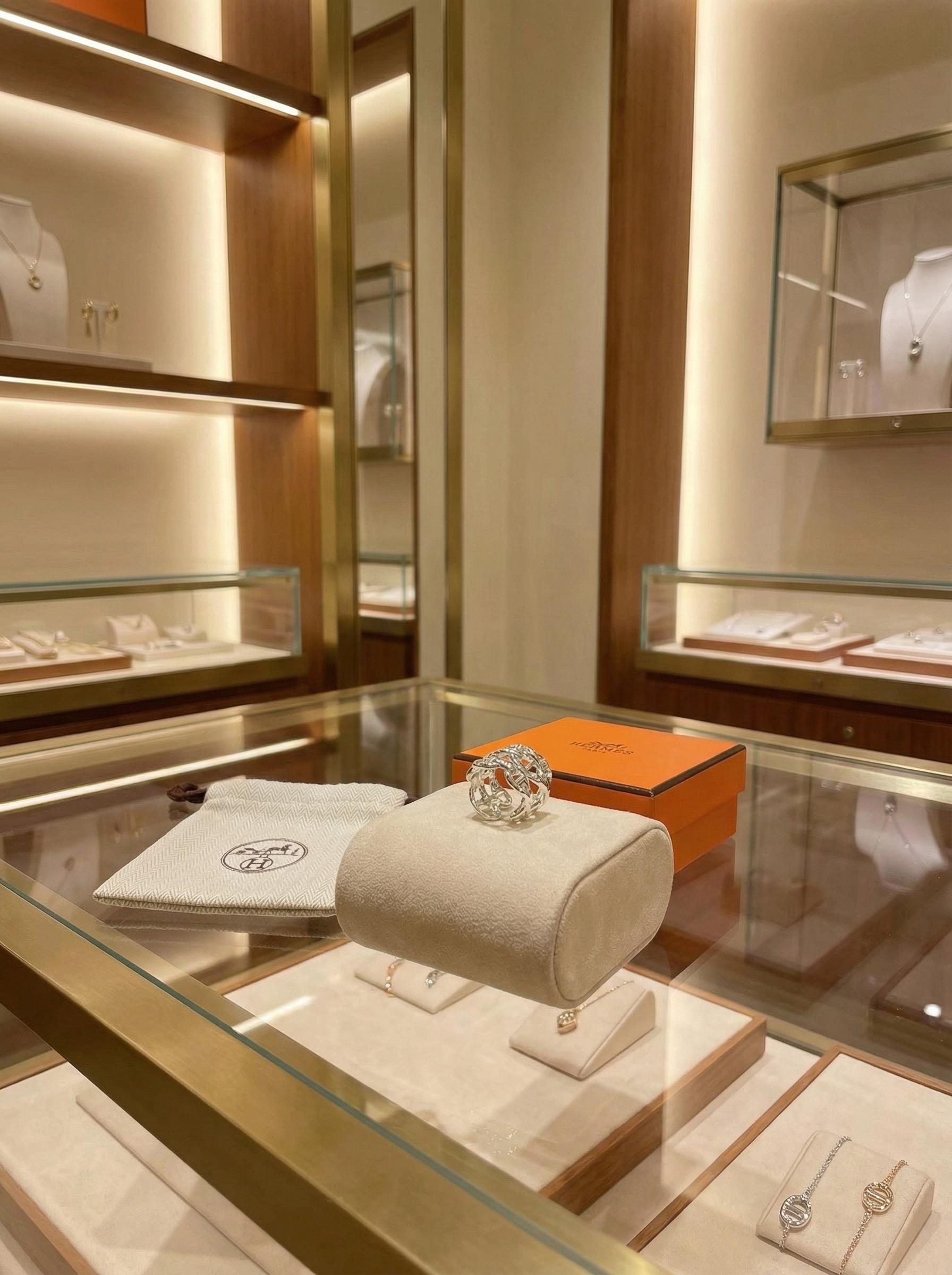 Стильное широкое кольцо Hermès Farandole, размер 56. Броский открытый орнамент из повторяющихся арочных/подковообразных элементов, зеркальная полировка — эффектный акцент как на каждый день, так и для вечернего образа.