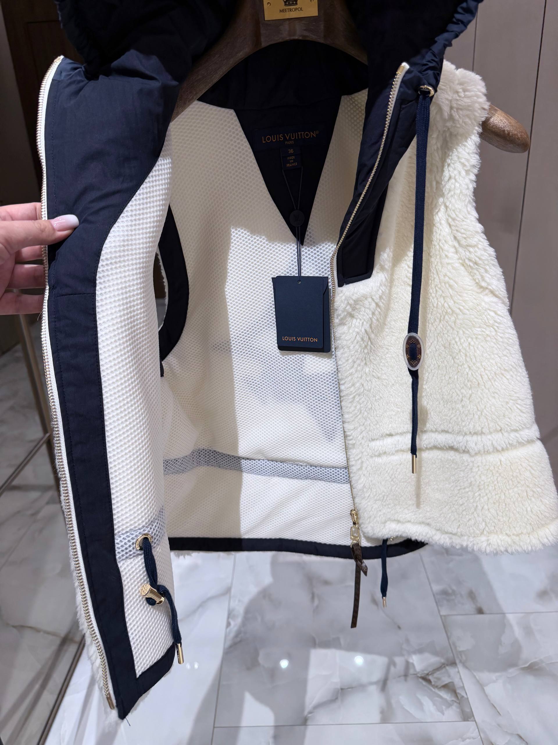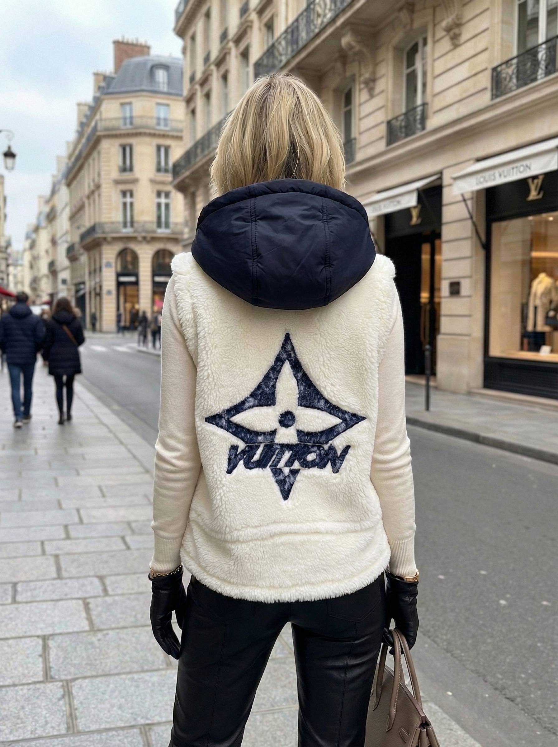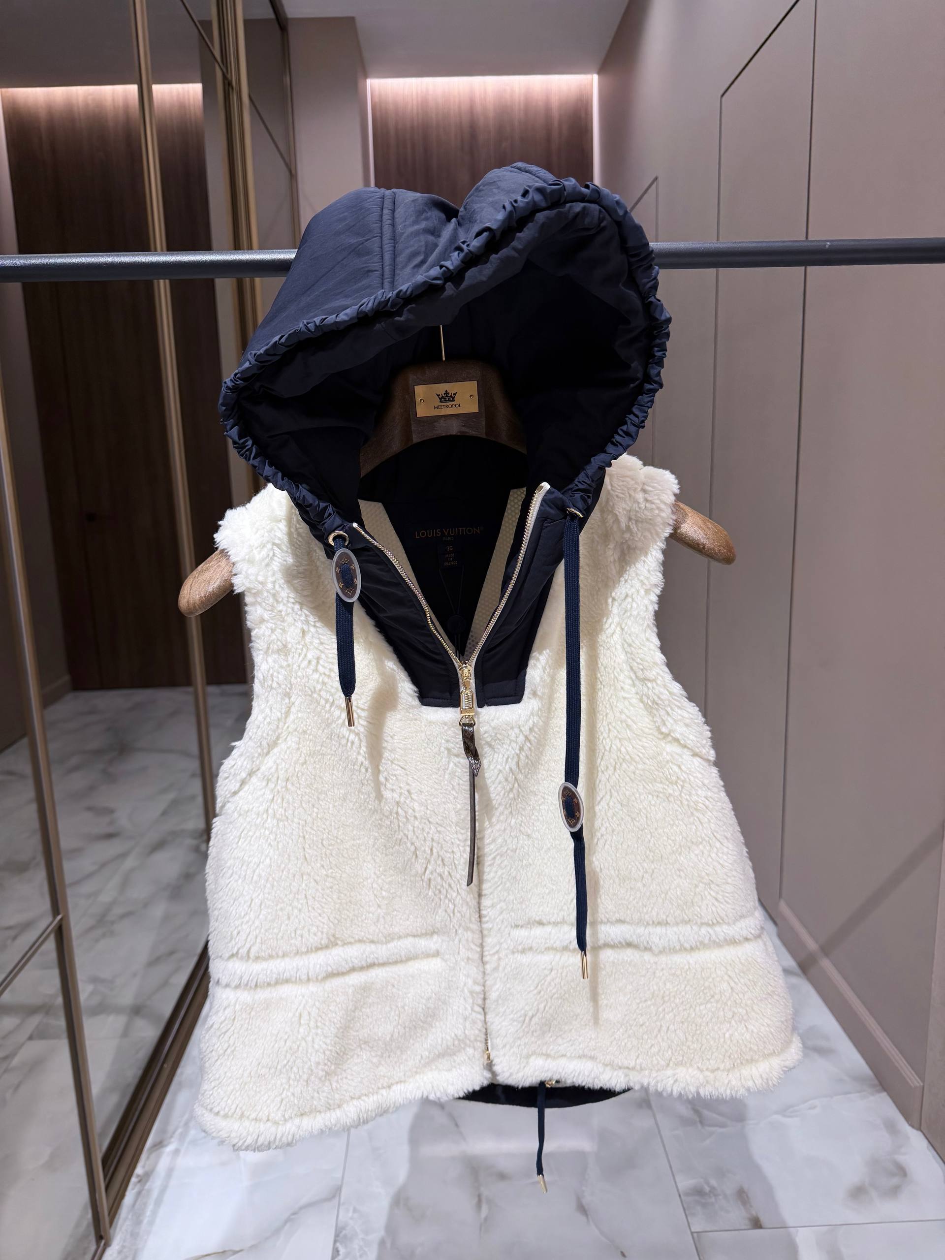 Элегантный и уютный жилет в контрастной цветовой гамме: мягкая кремовая поверхность с эффектом шерпа сочетается с тёмно‑синим стёганым капюшоном. Модель отличается лаконичным силуэтом, продуманной фурнитурой и деталями, которые подчеркивают премиальный характер изделия.