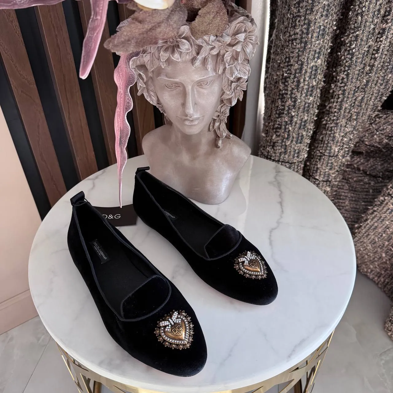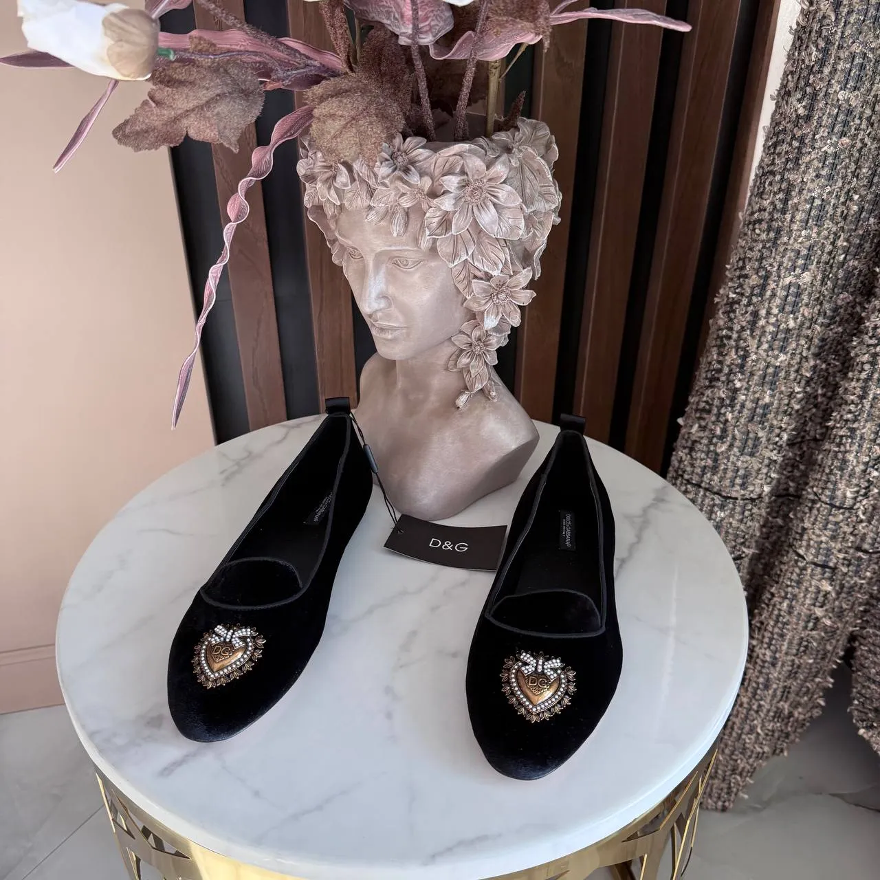 Бархатные балетки DG с металлическим логотипом в форме сердца — это стильная и элегантная обувь от бренда Dolce & Gabbana. Балетки обладают шикарным дизайном и высоким качеством исполнения, что отражает основные ценности бренда. Бархатный материал придает обуви особую мягкость и роскошь, а металлический логотип в форме сердца добавляет яркий акцент и демонстрирует принадлежность к известному модному дому.