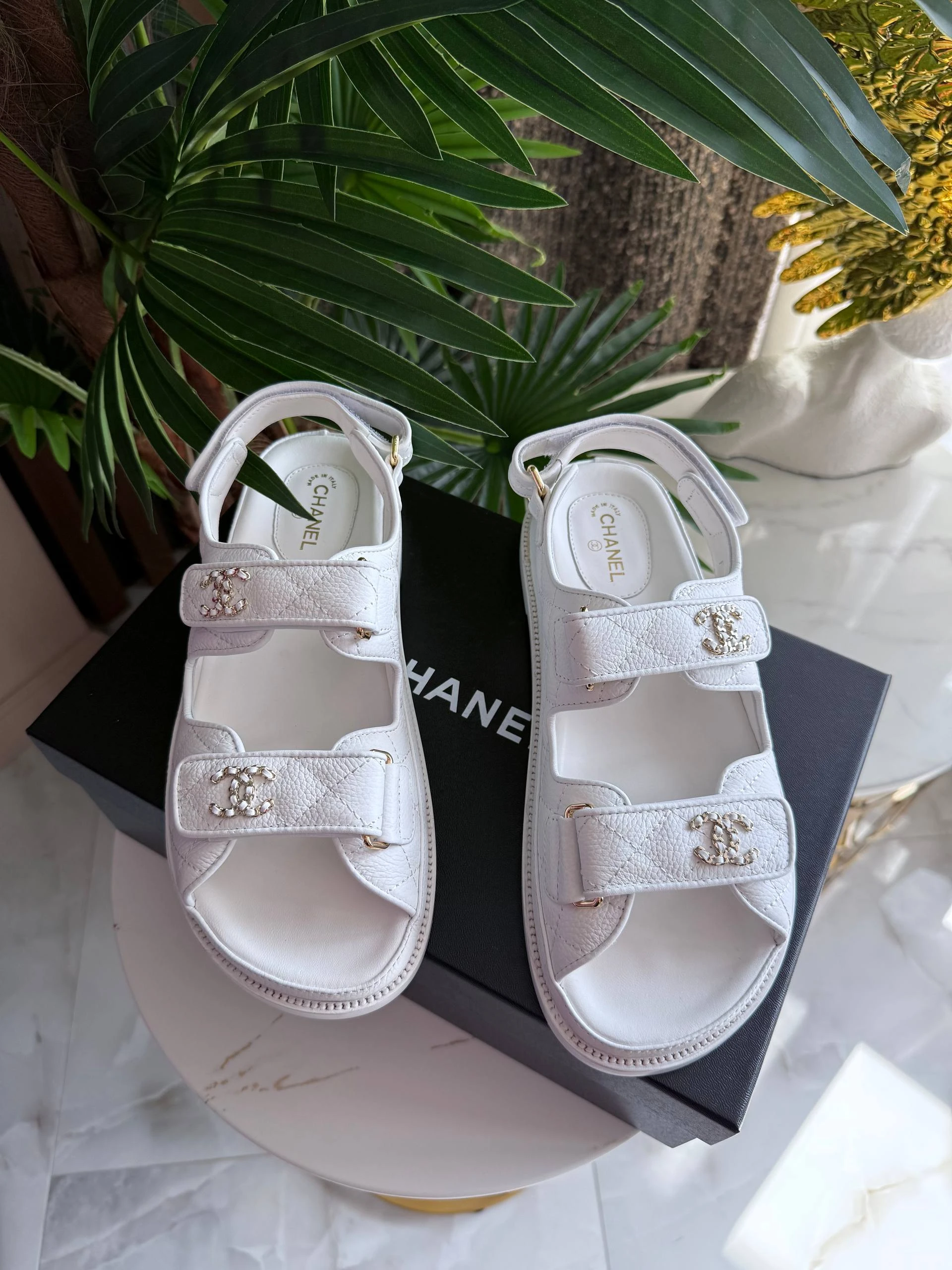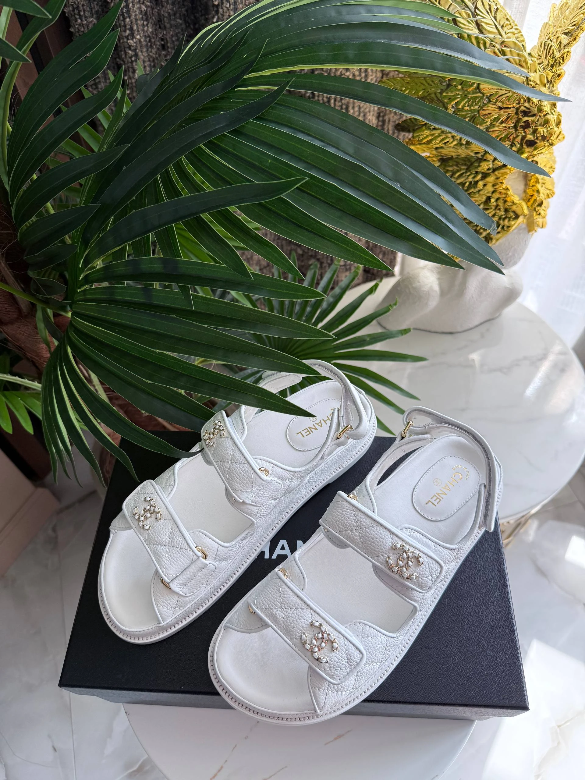 Элегантные женские сандалии Chanel выполнены из мягкой белой кожи и декорированы фирменной золотистой пряжкой с логотипом в виде двойной С, украшенной кристаллами.