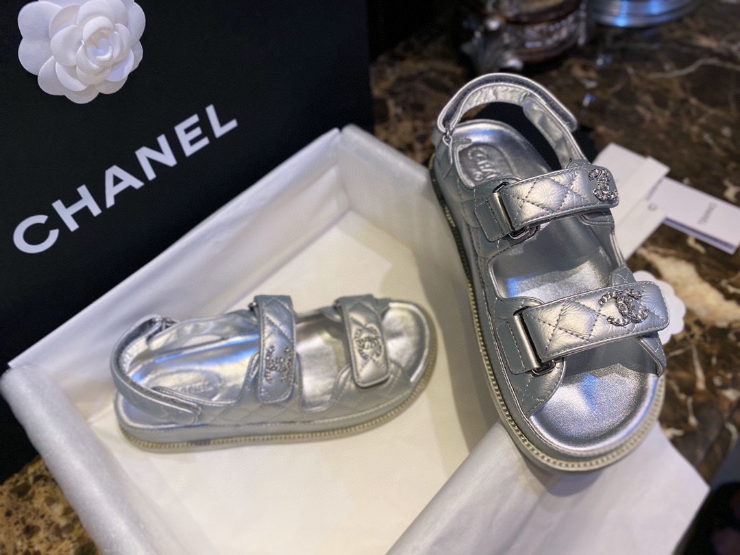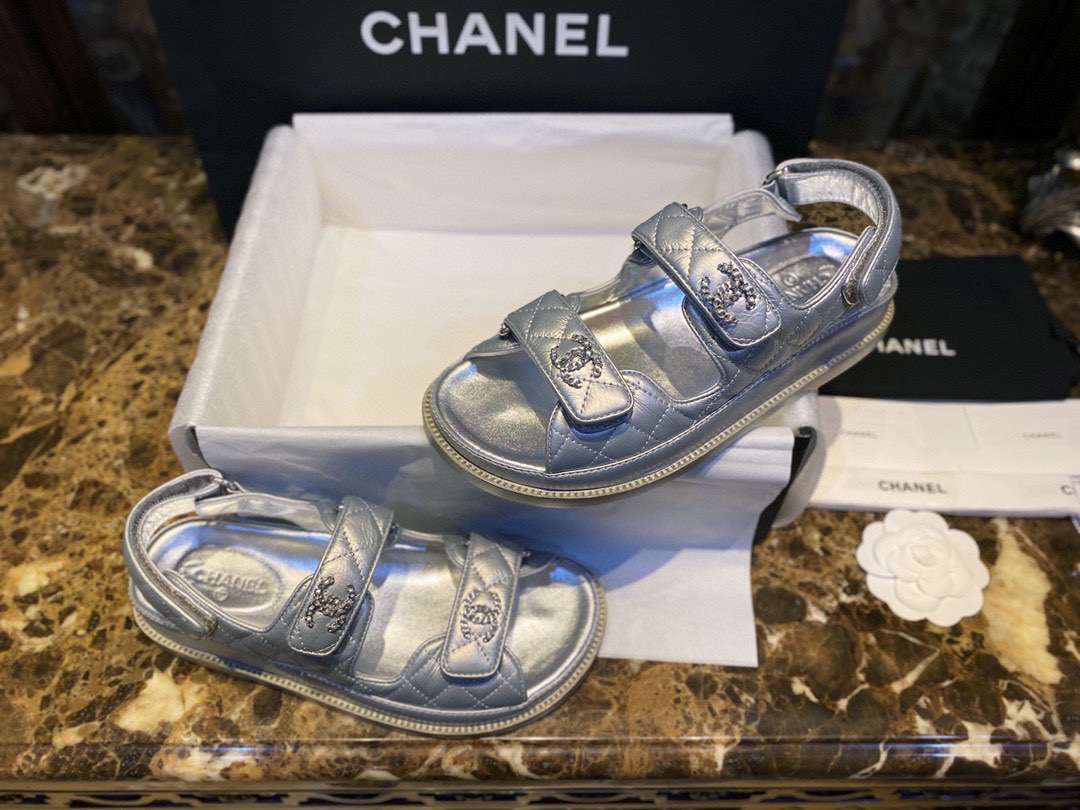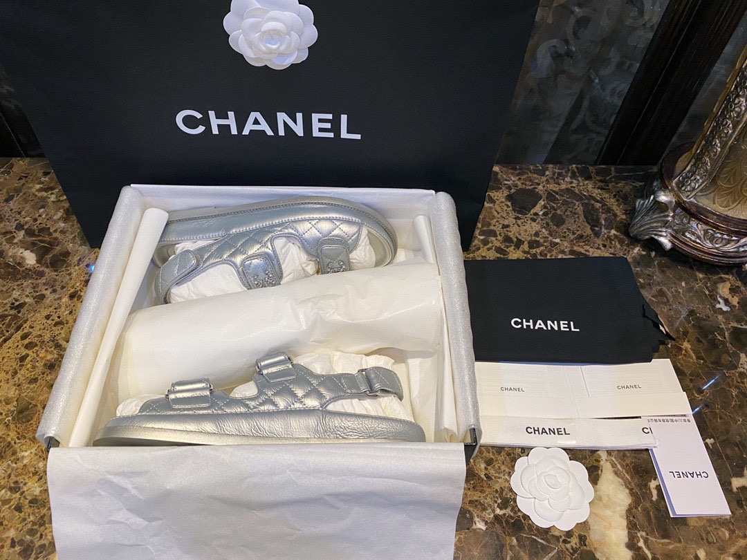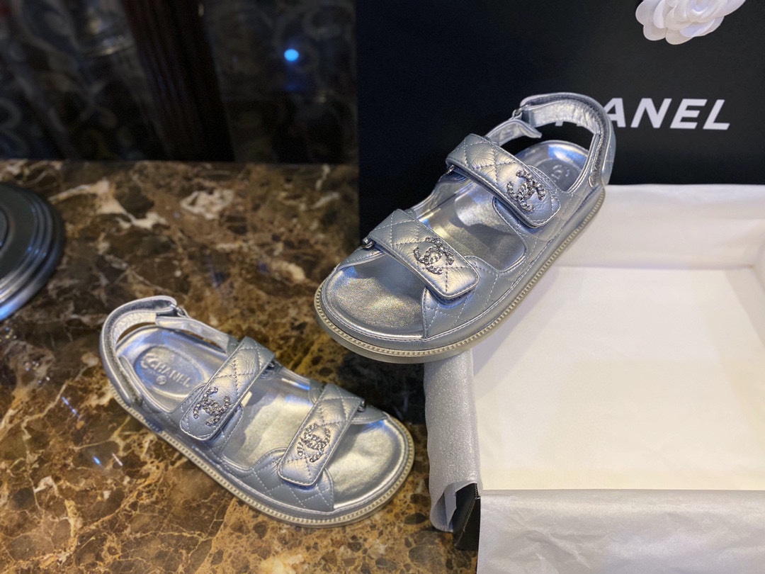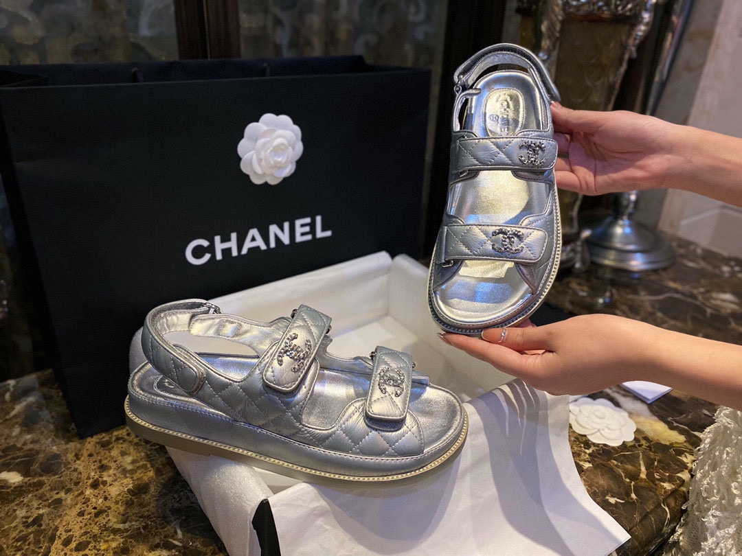 Женские серебряные сандалии Chanel из овечьей кожи — стильная и элегантная обувь, идеально подходящая для летних образов.