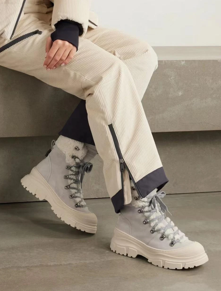 Женские ботинки из овчины от BRUNELLO CUCINELLI — это идеальное сочетание утонченного стиля и максимального комфорта для холодного сезона. Верхняя часть выполнена из мягкой натуральной овчины светло-серого оттенка, которая обеспечивает тепло и уют даже в самые суровые зимние дни. Внутренняя отделка из пушистой овчины гарантирует дополнительную защиту от холода и приятные тактильные ощущения.