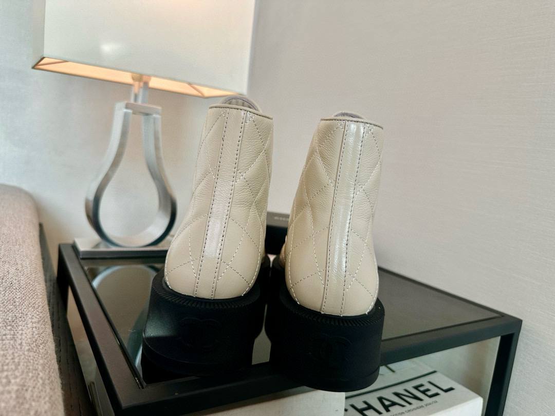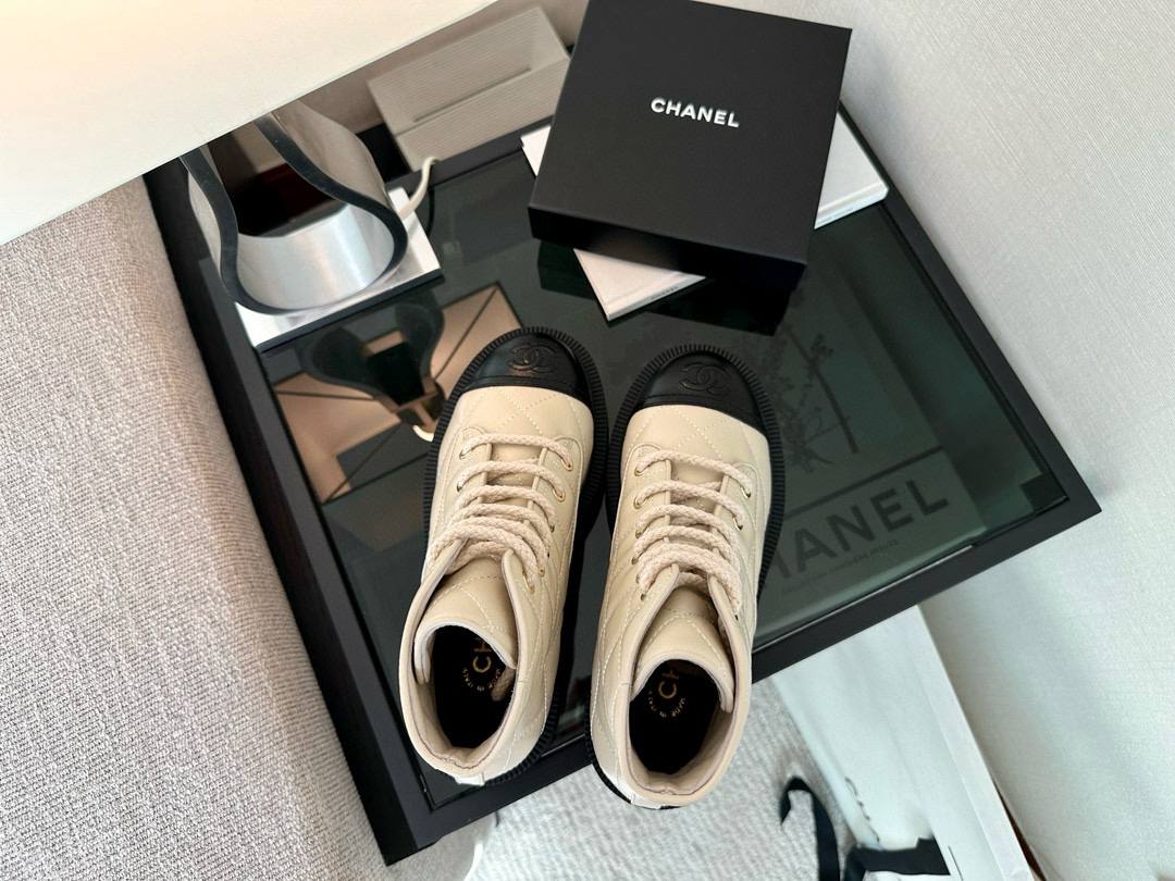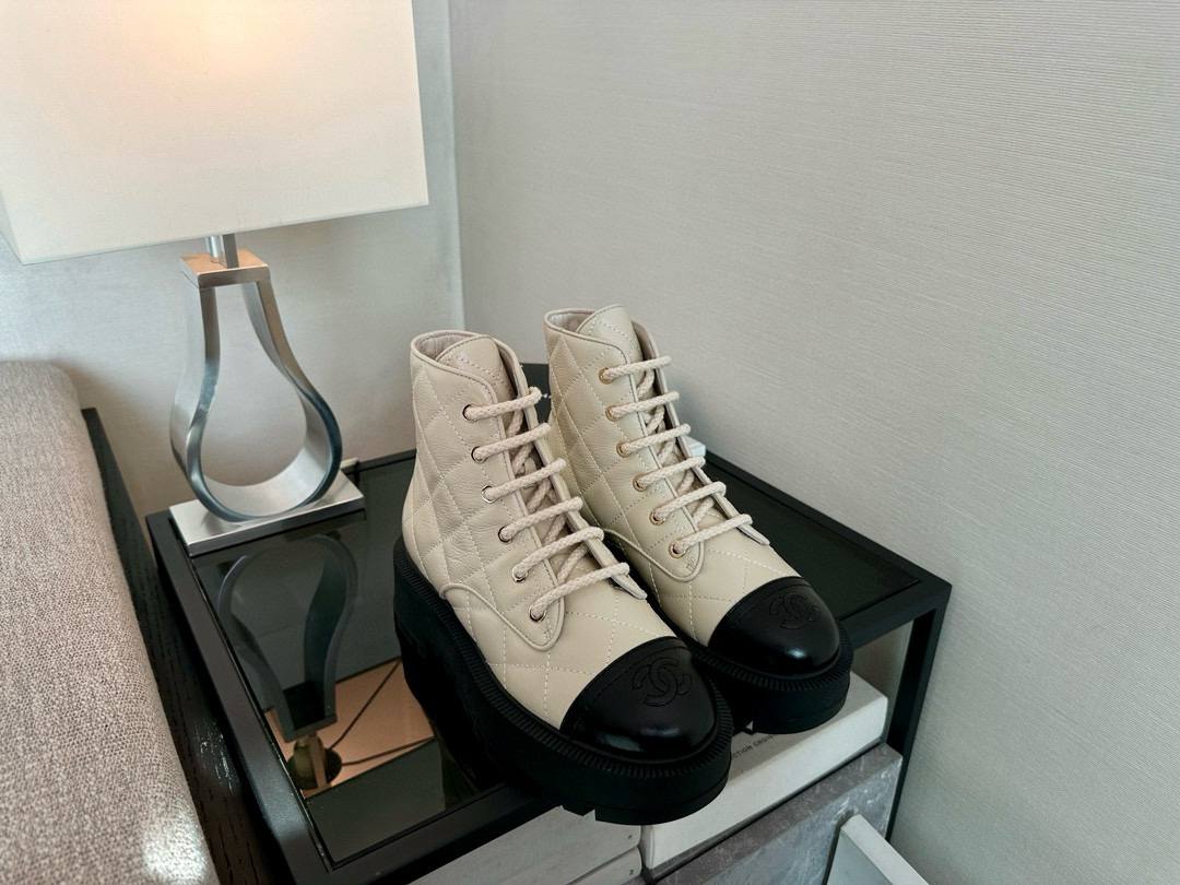 Ботинки выполнены из высококачественной кожи бежевого оттенка, украшенной фирменной стёжкой «квадрат» с мягким матовым блеском. Высокий силуэт и застёжка на шнуровку обеспечивают идеальную посадку и комфорт при носке. Контрастный нос ботинок выполнен из гладкой чёрной кожи, на котором эффектно расположена эмблема CHANEL, подчёркивающая престиж изделия.