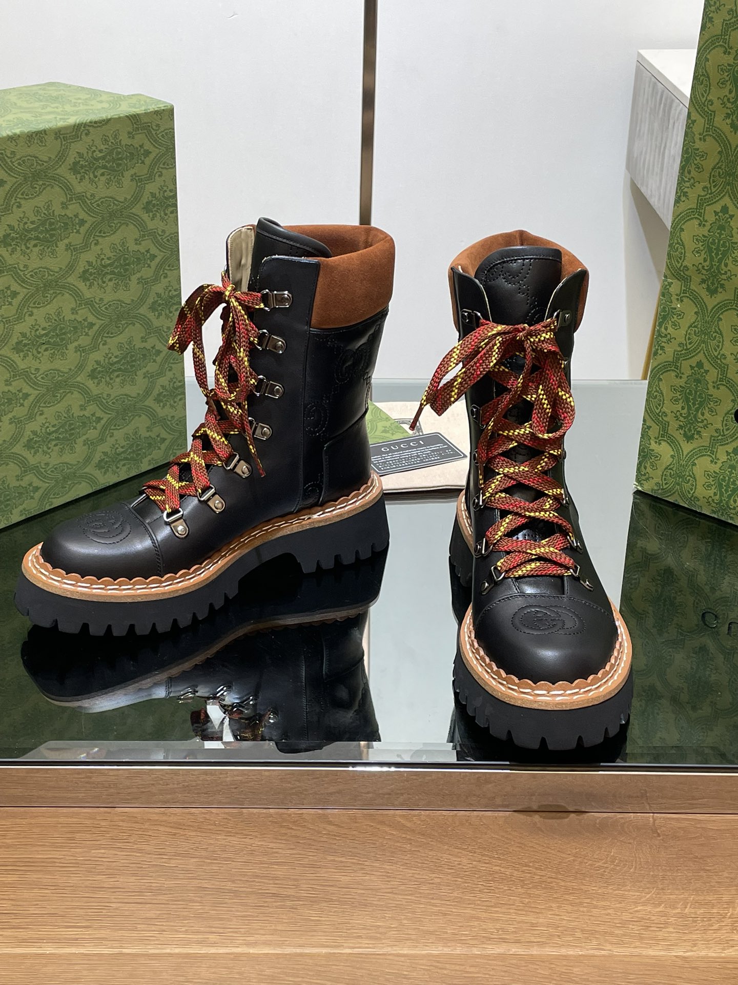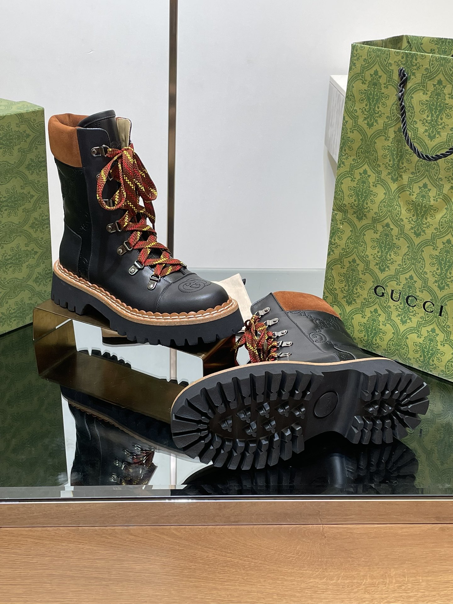 Стильные ботинки Gucci — идеальный выбор для современной девушки, ценящей комфорт и роскошь. Модель выполнена из высококачественной натуральной кожи черного цвета, украшена оригинальной замшевой вставкой на голенище. Трекерная подошва обеспечивает надежное сцепление и устойчивость в любую погоду. Шнуровка, металлическая фурнитура и фирменный логотип GG подчеркивают утончённый стиль бренда.