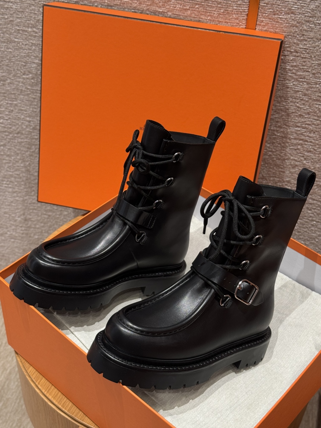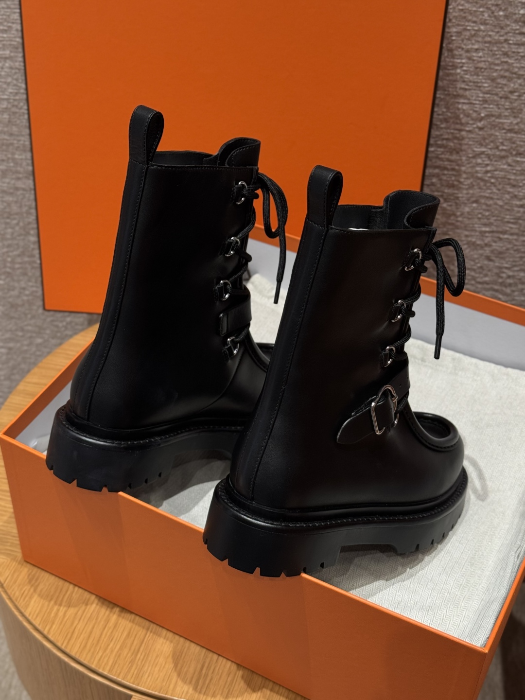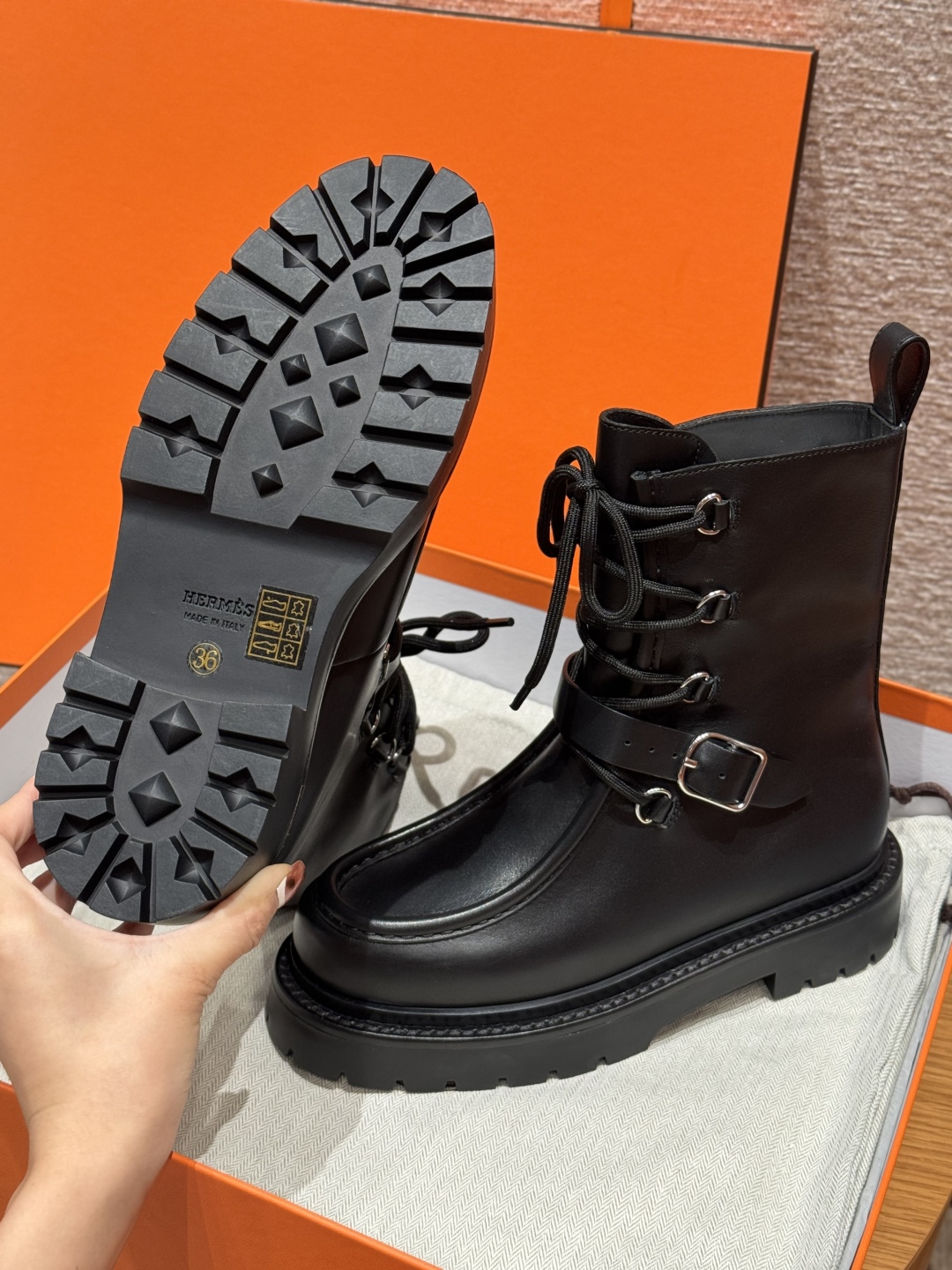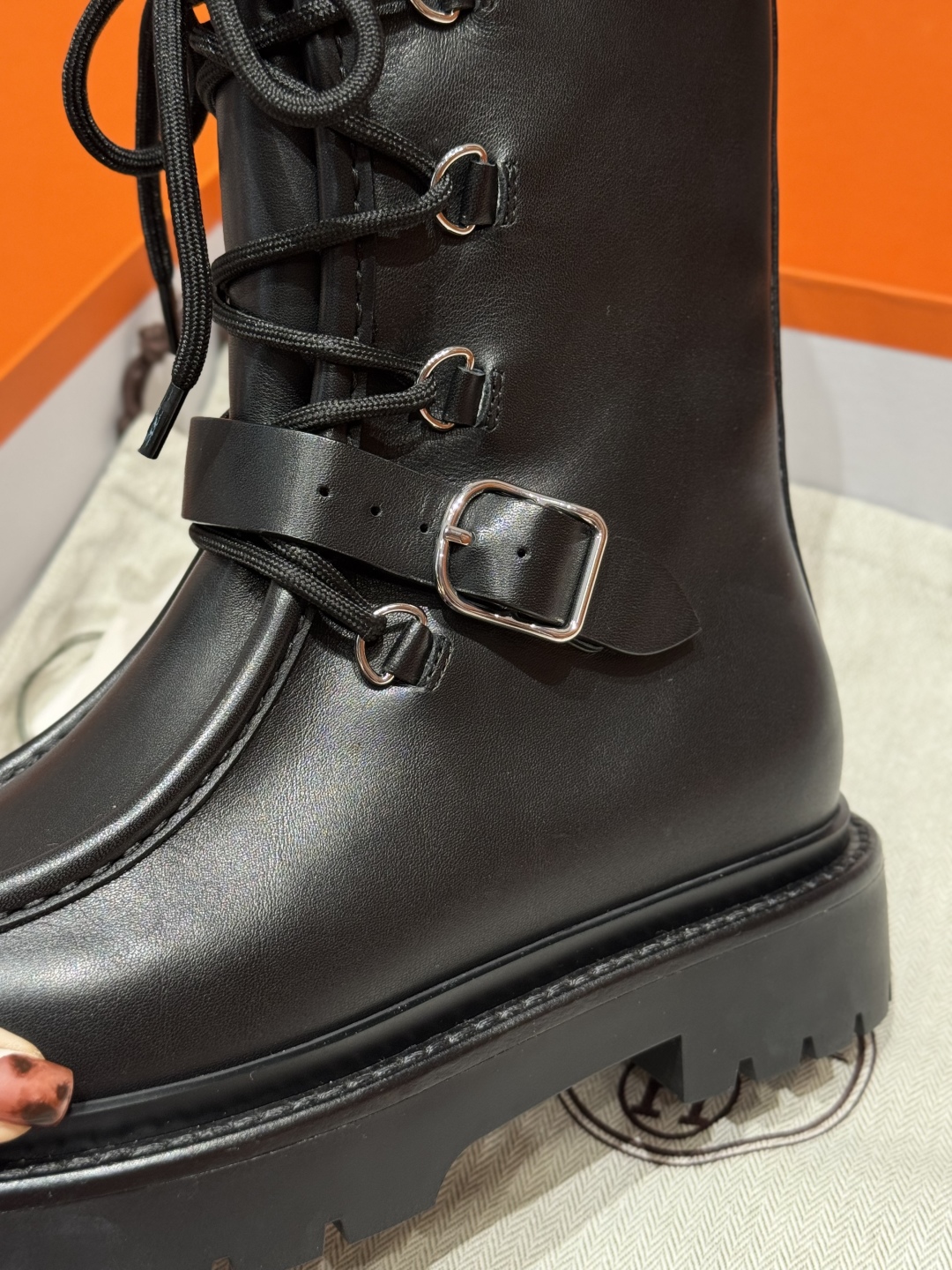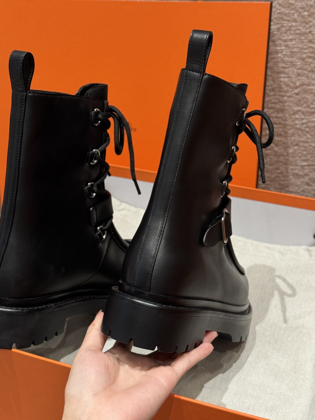 Практичные шнурки и задние петельки облегчают процесс надевания. Эти ботинки совмещают в себе элегантность, характерную для Hermès, и функциональность на каждый день, идеально дополняя как городской, так и кэжуал-образ.