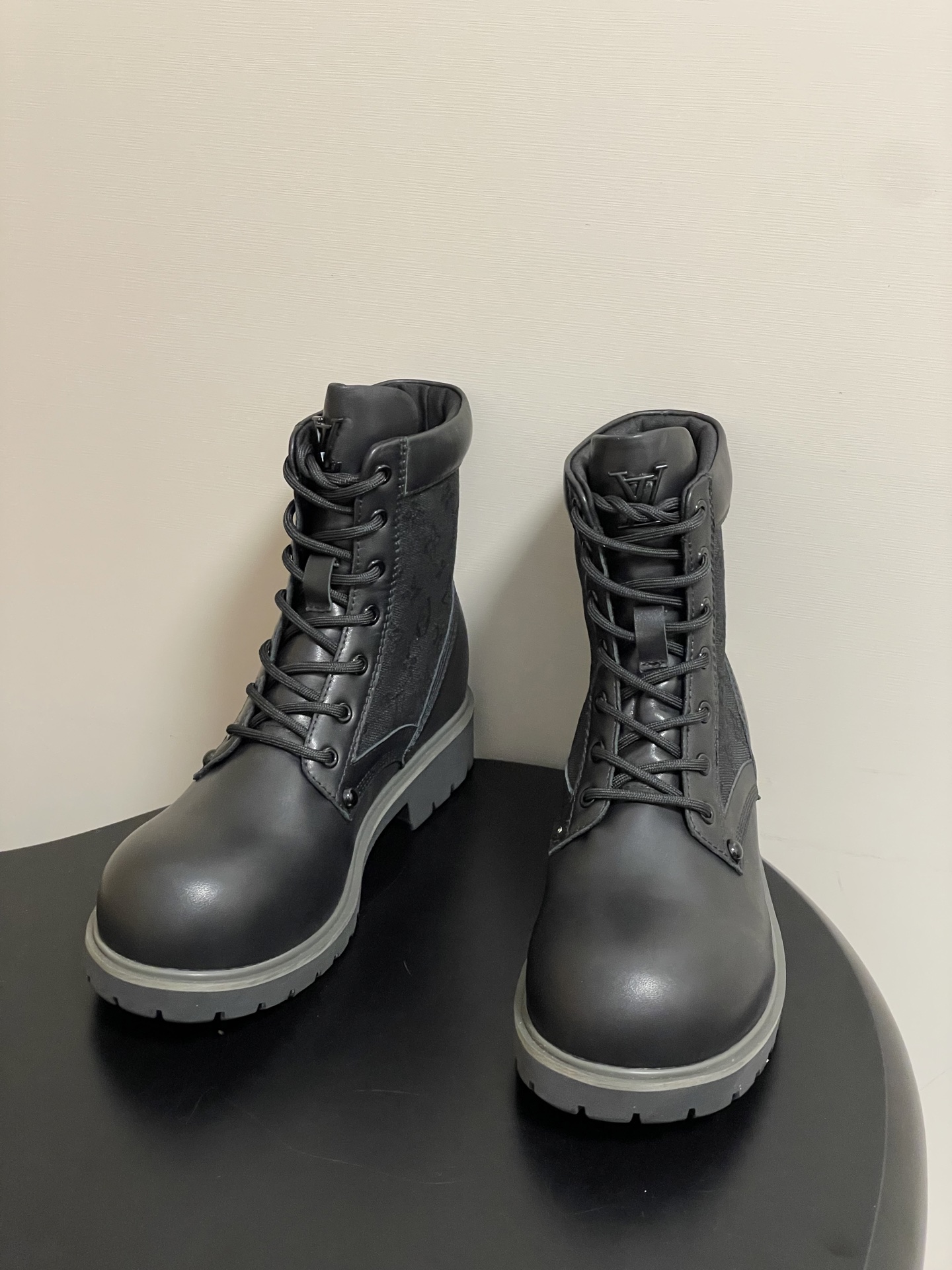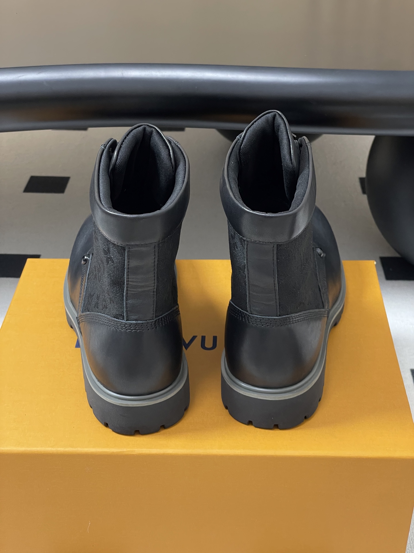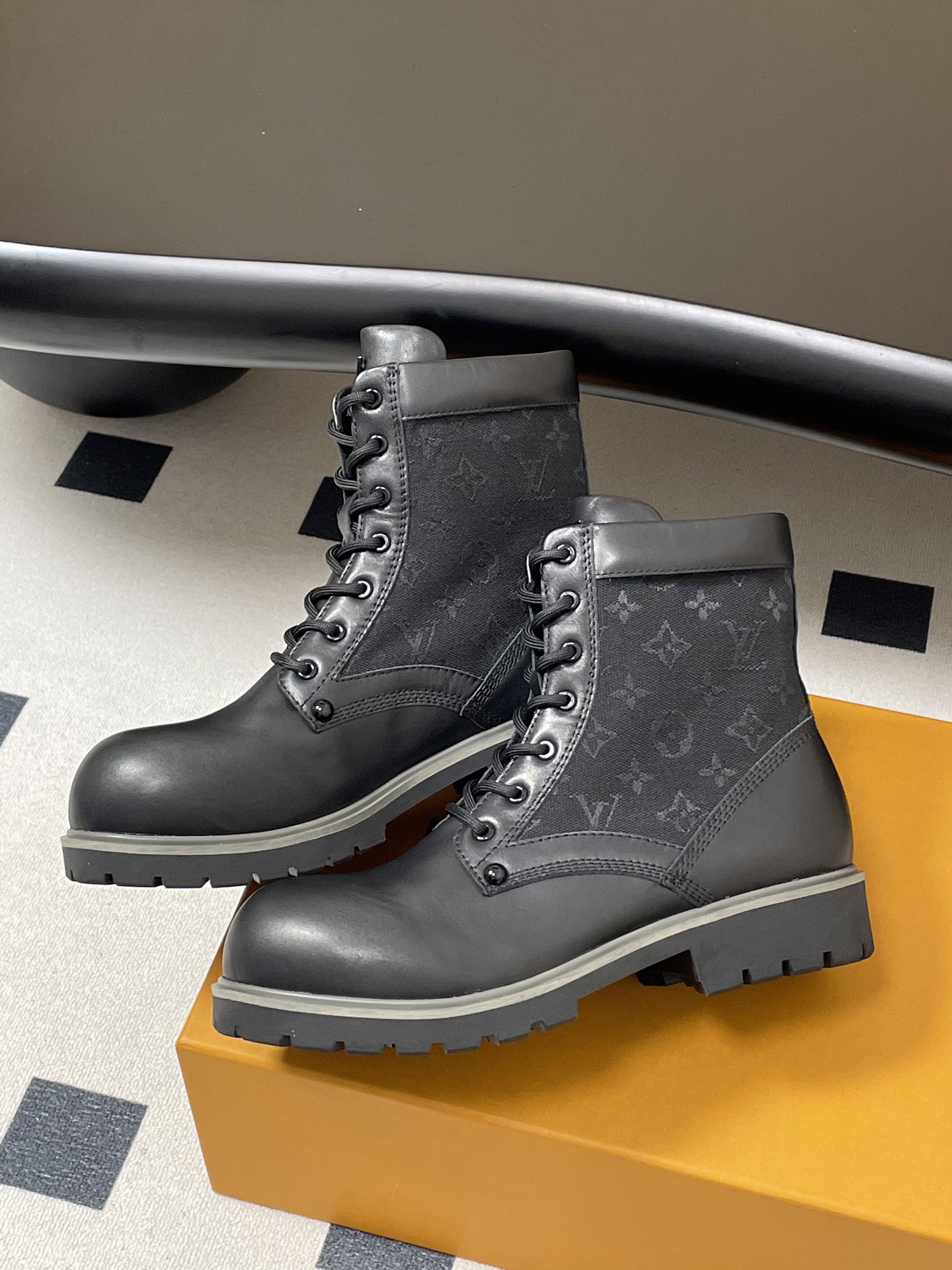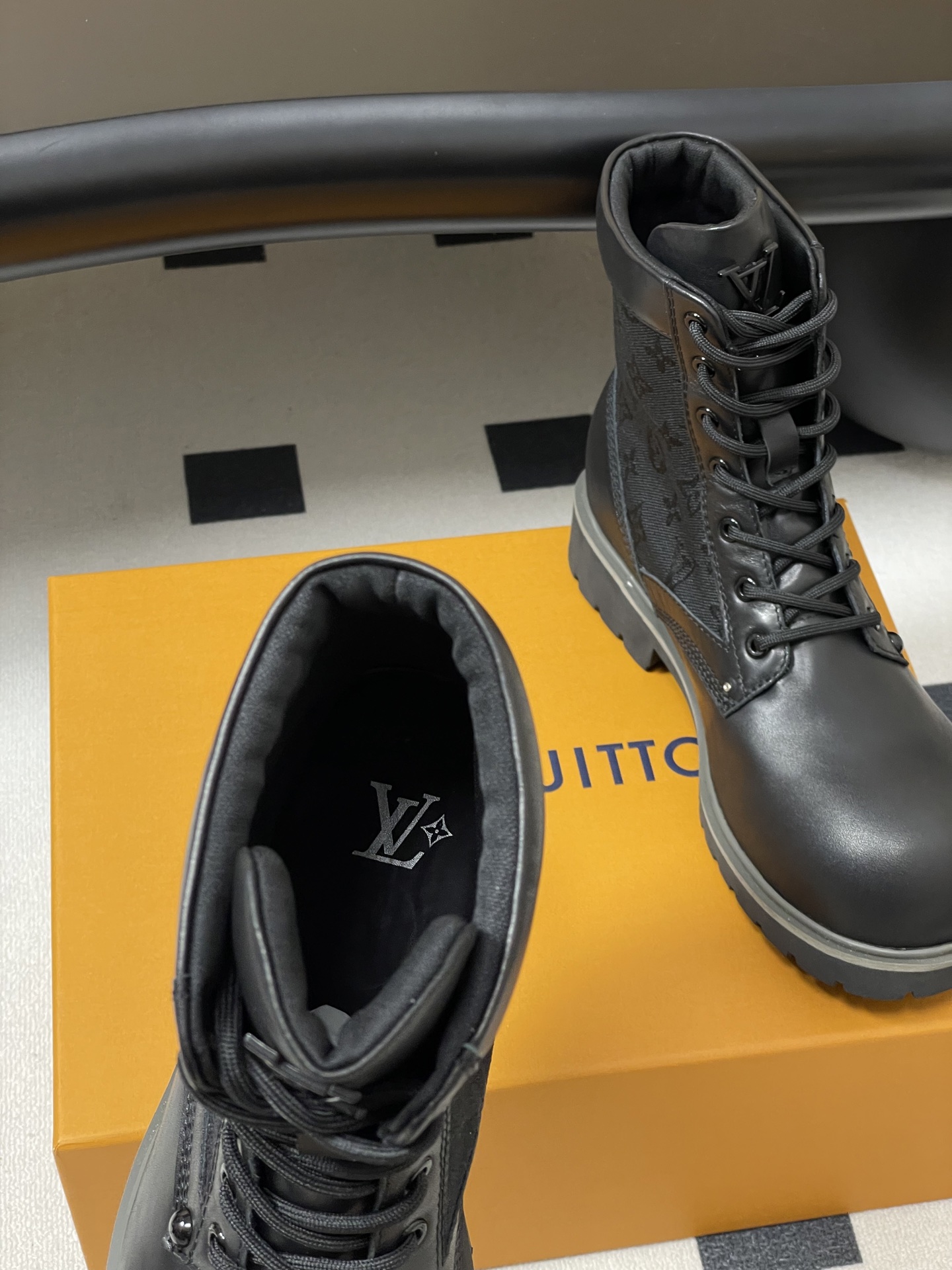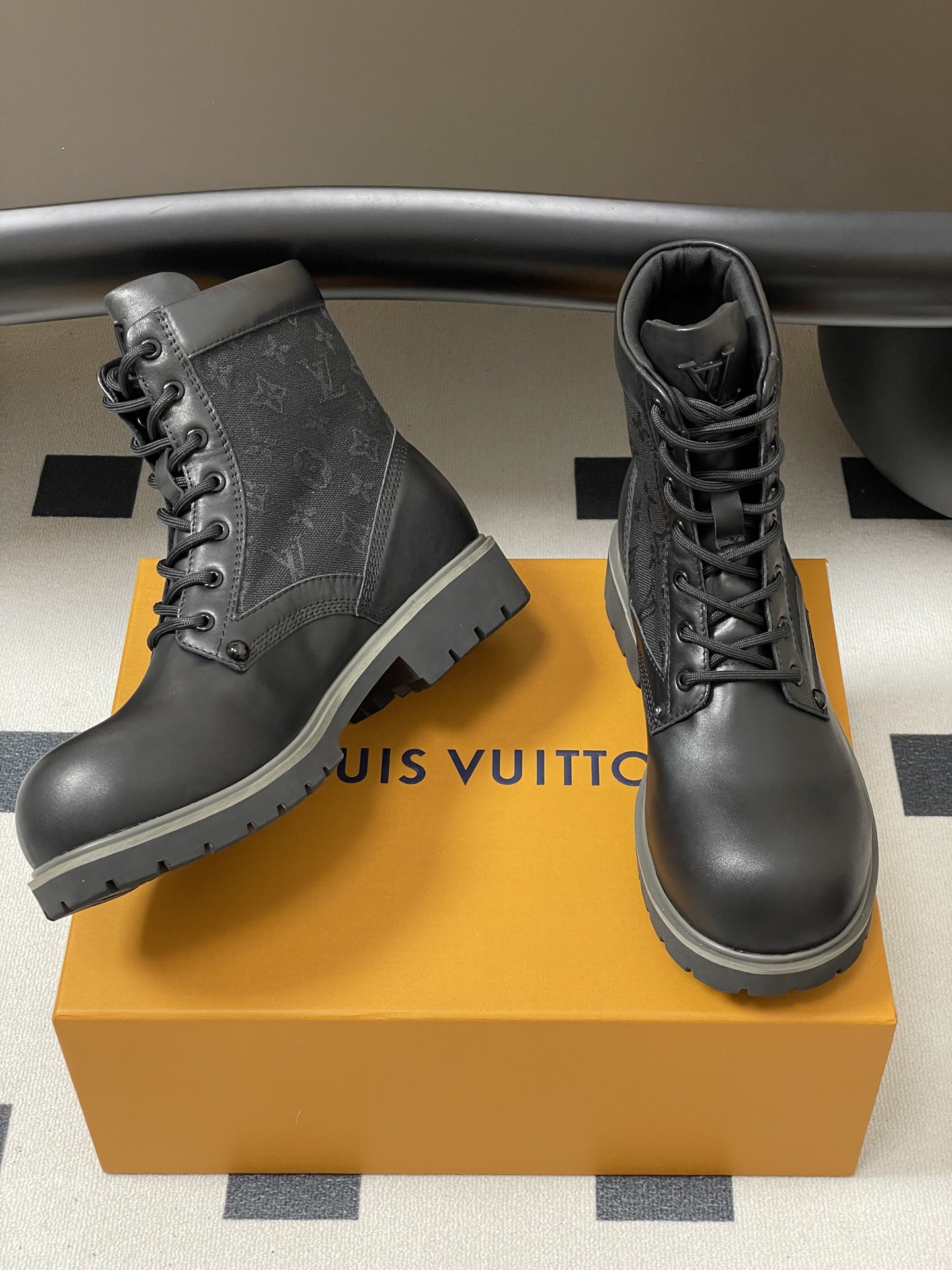 Элегантные ботинки от знаменитого бренда Louis Vuitton — идеальное сочетание премиального качества, комфорта и стильного французского дизайна. Модель выполнена из натуральной кожи в лаконичном черном цвете с фирменным монограммным принтом LV на боковых вставках.